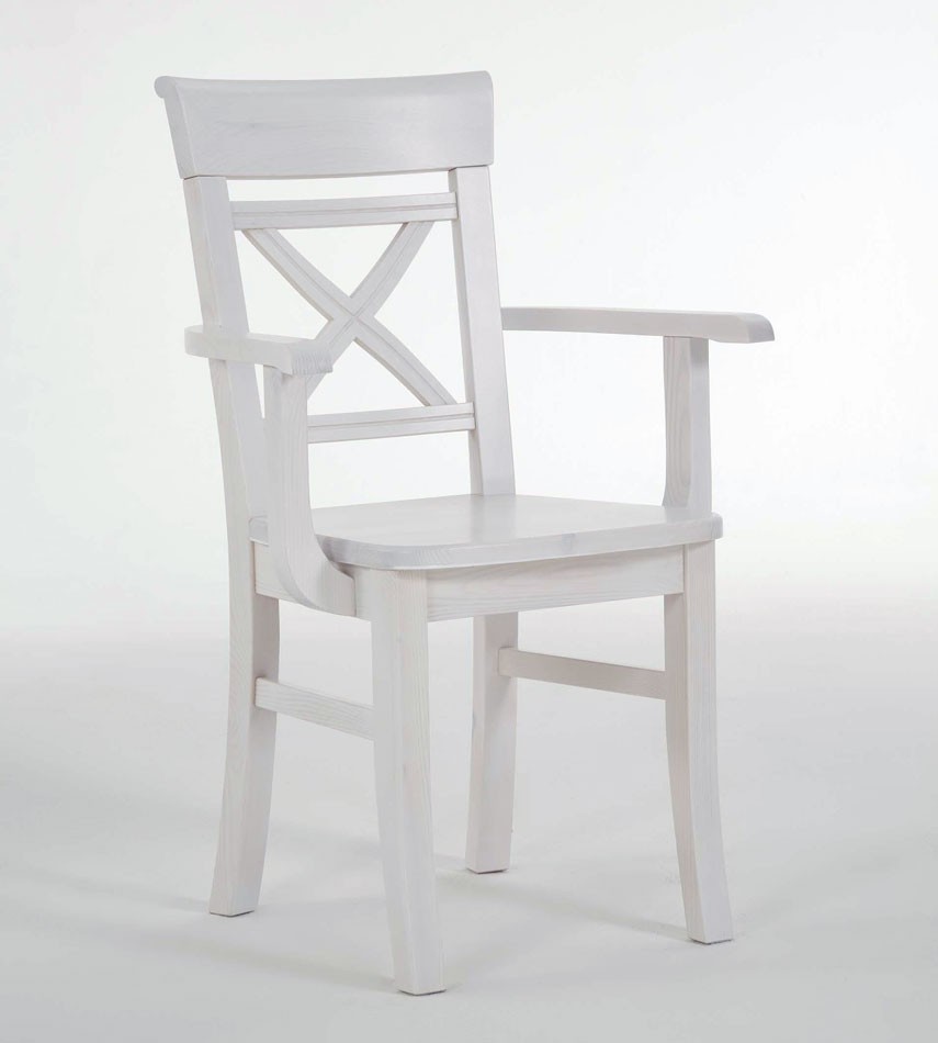 Dieser Holzstuhl ist aus massivem Kiefernholz gefertigt und verfügt über einen Holzsitz und Armlehnen.
