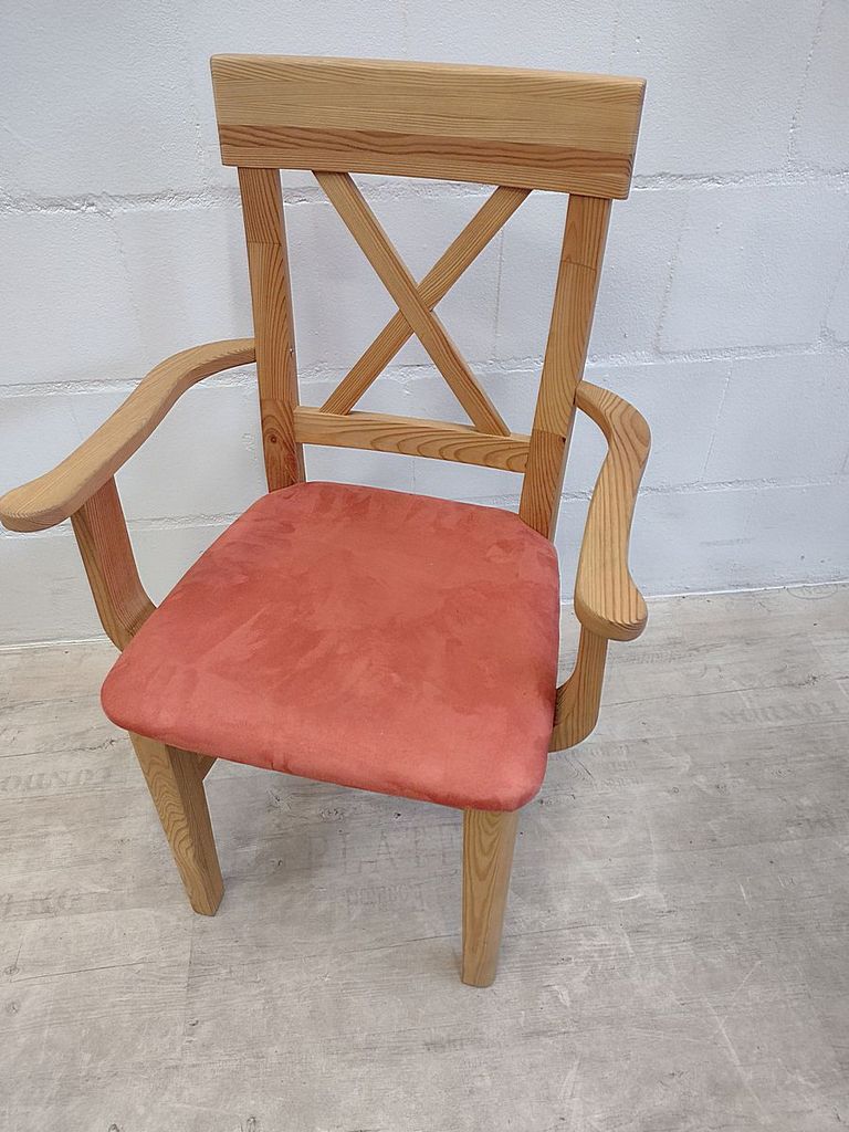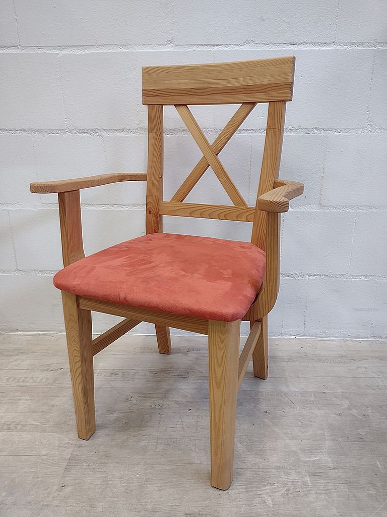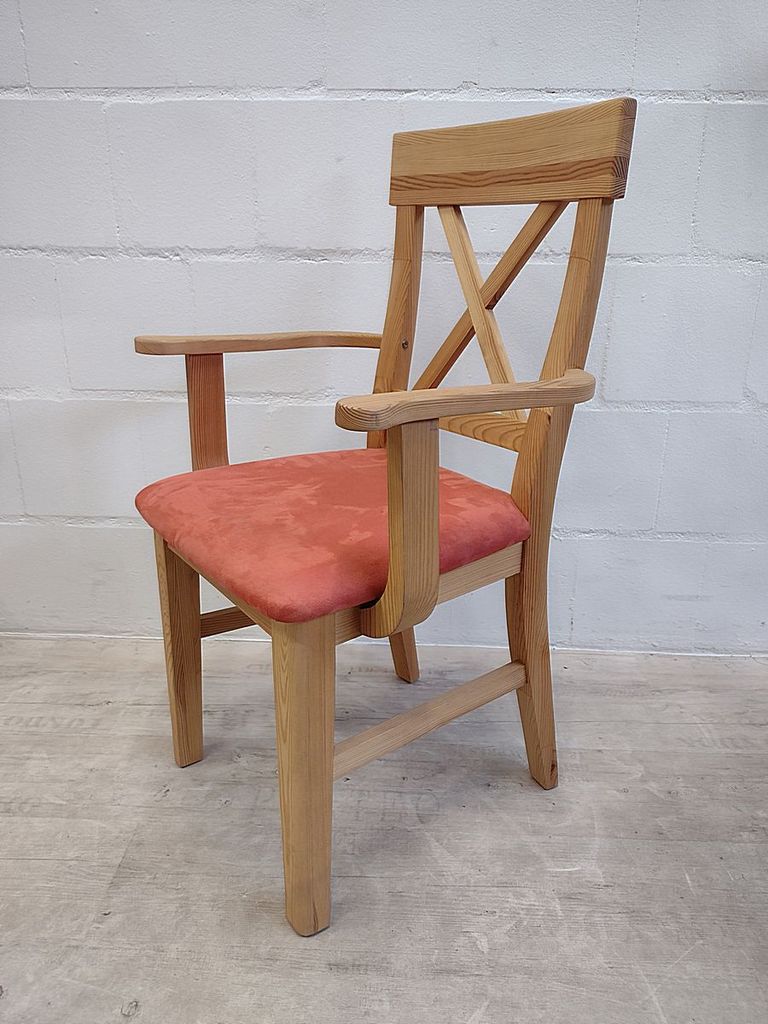 Dieser schöne Stuhl mit Armlehne und Polstersitz; aus der Serie ALENA; ist aus massiver Kiefer gefertigt.