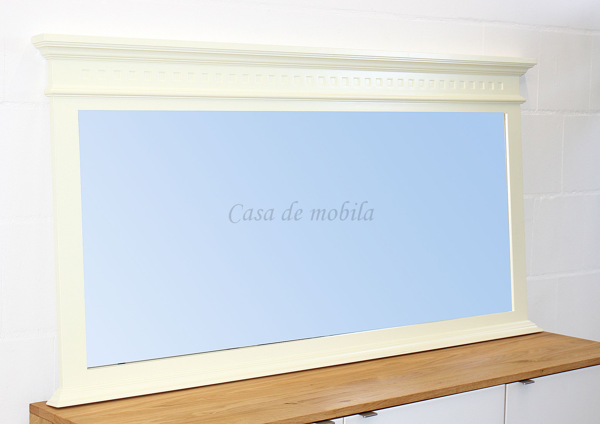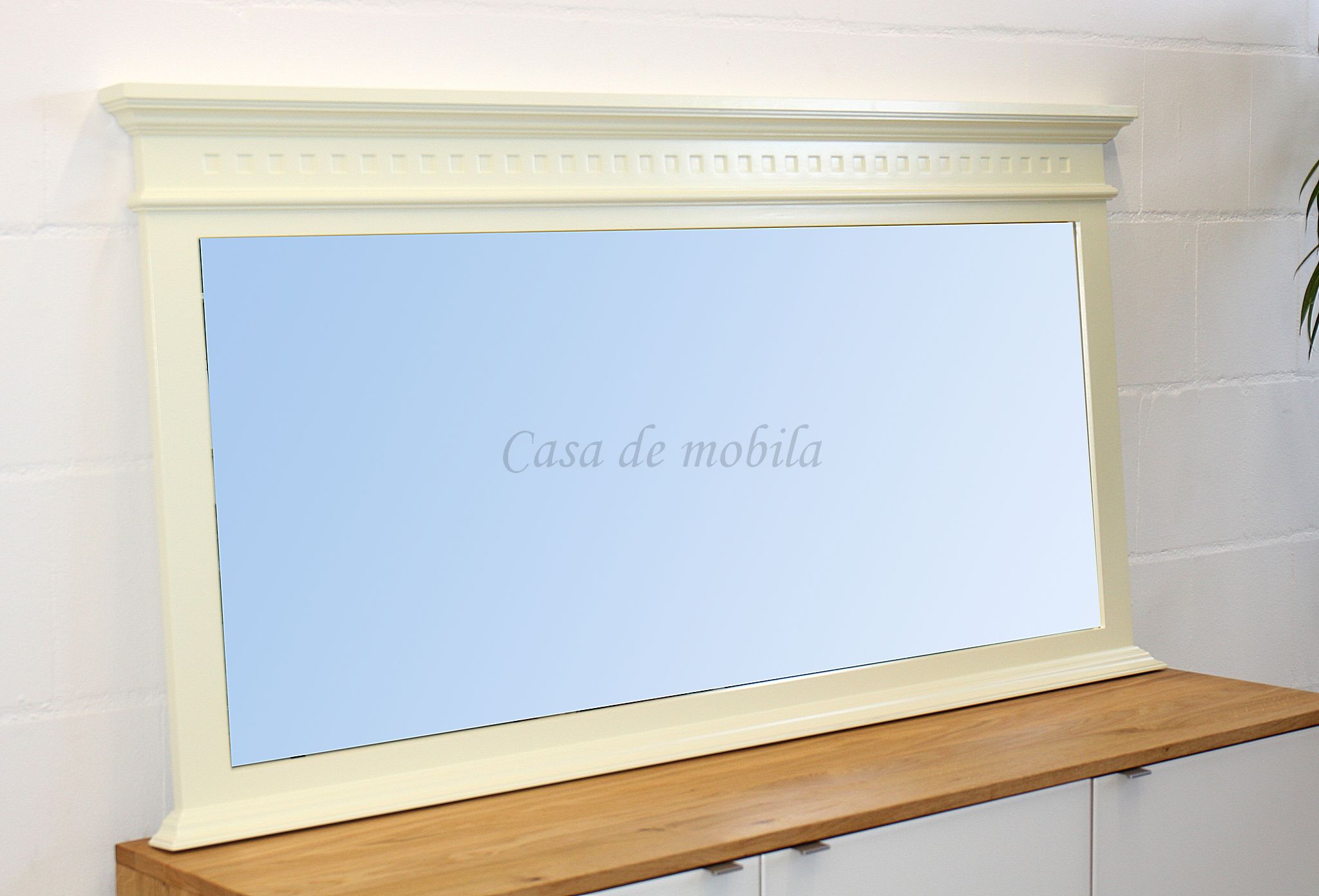 Kranz und Sockel des Spiegels sind profiliert gearbeitet, sehr edel wirkt die cremefarbene Lackierung des Spiegelrahmens.