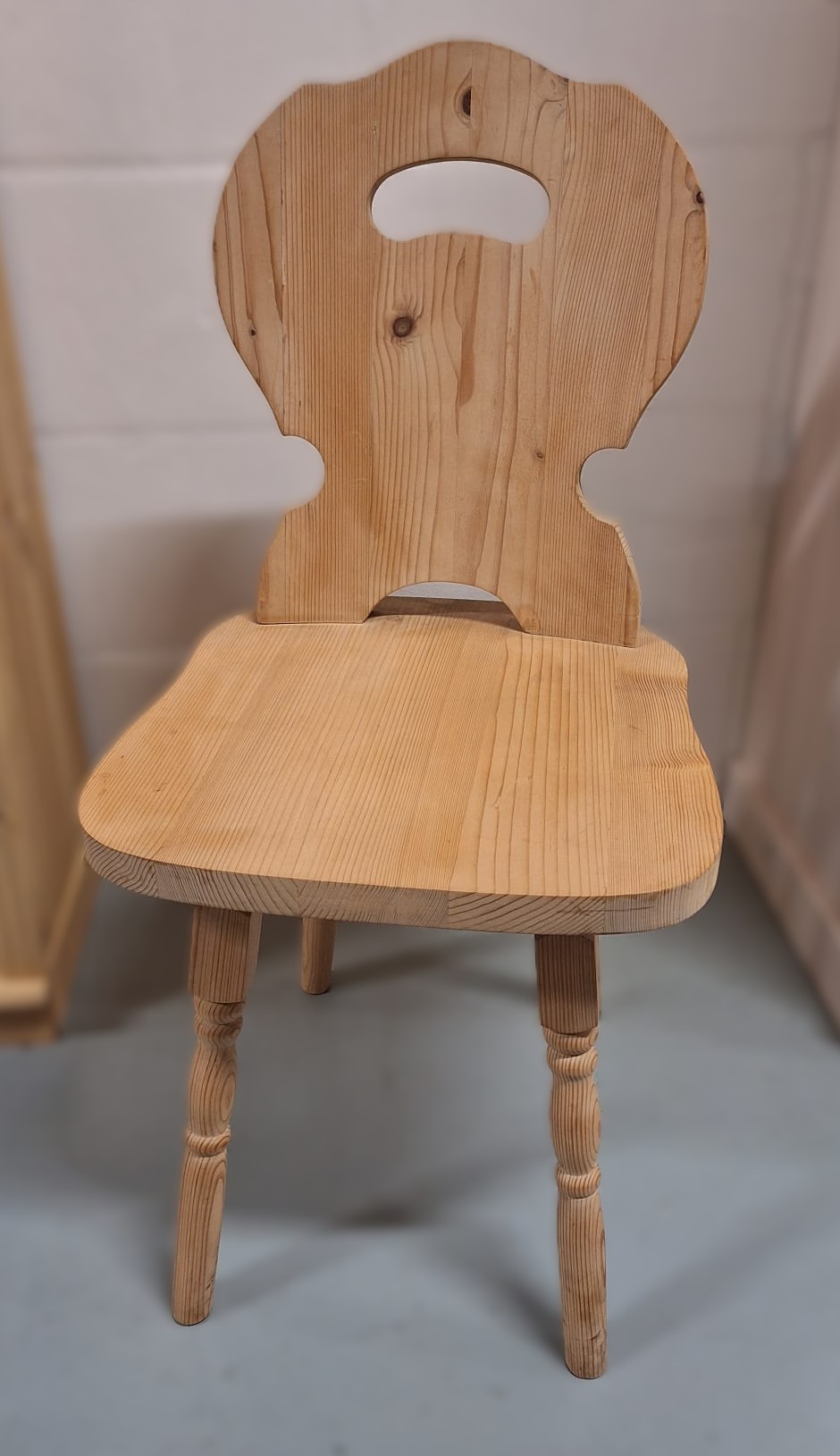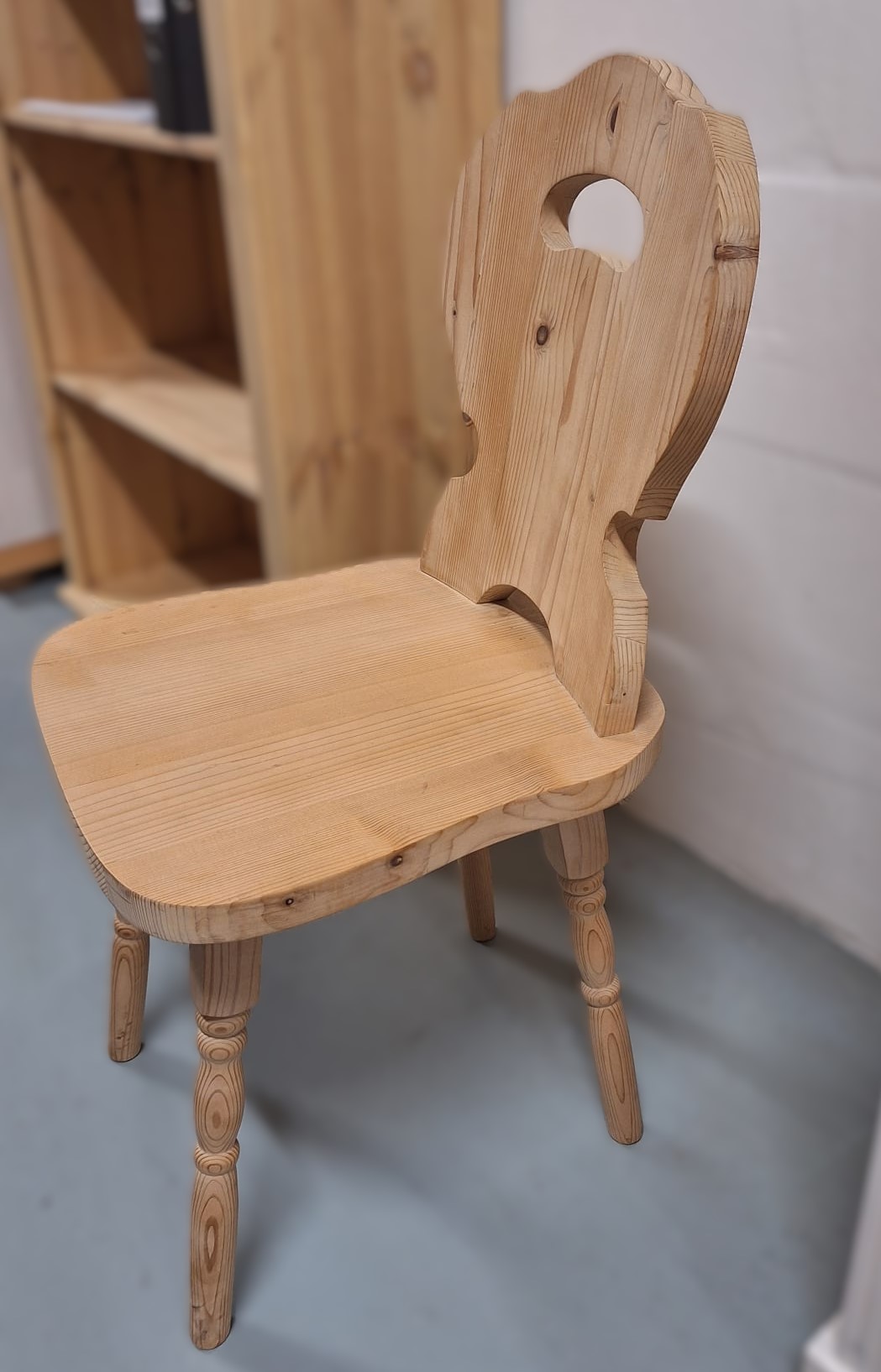 Dieser schöne Holzstuhl aus massiver Fichte im Landhausstil hat in der auffällig geformten Rückenlehne als besonderes Detail ein Griffloch.