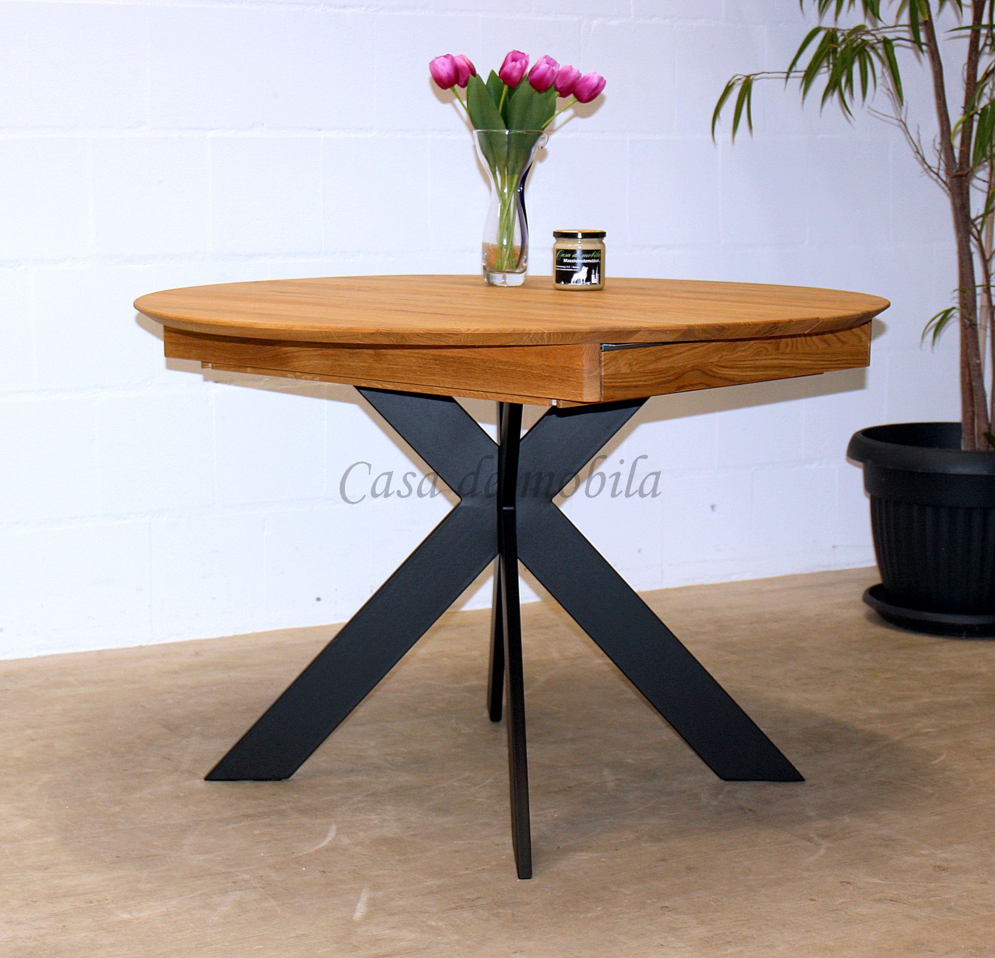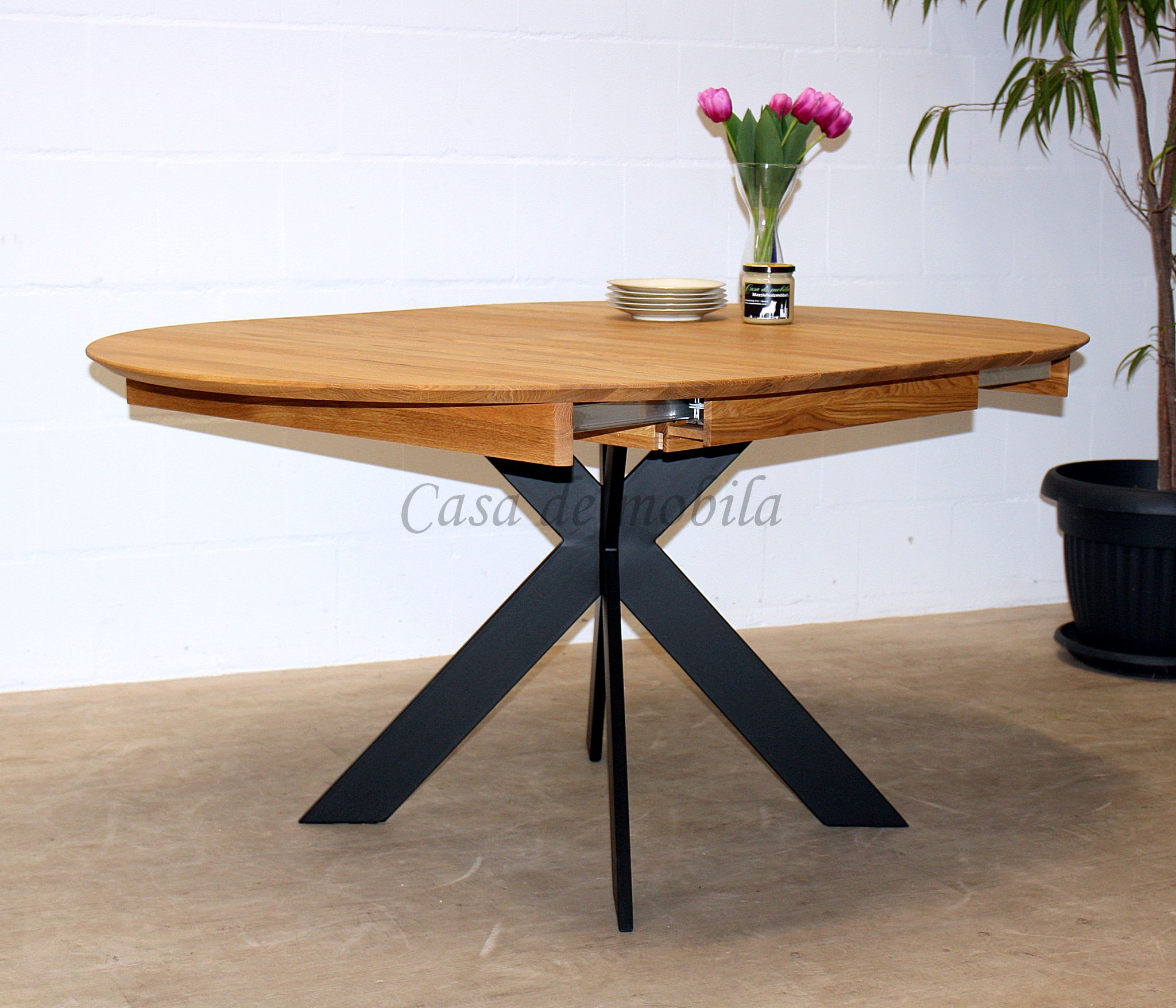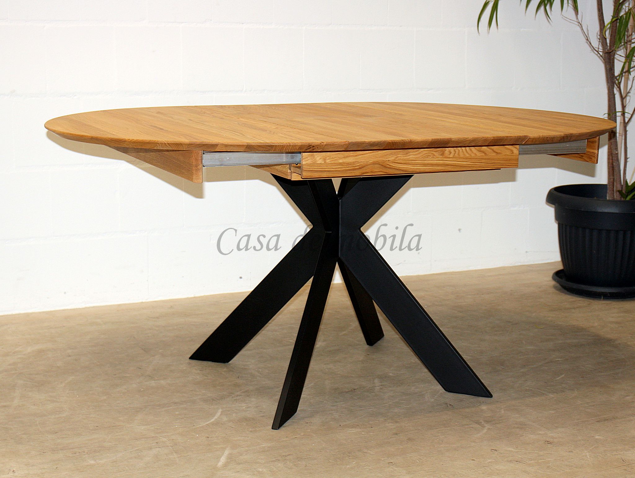 Die Tischplatte des runden Esstisches hat einen Durchmesser von 115 cm. Sie ist mit der innenliegenden Einlegeplatte auf 165x115 cm erweiterbar.