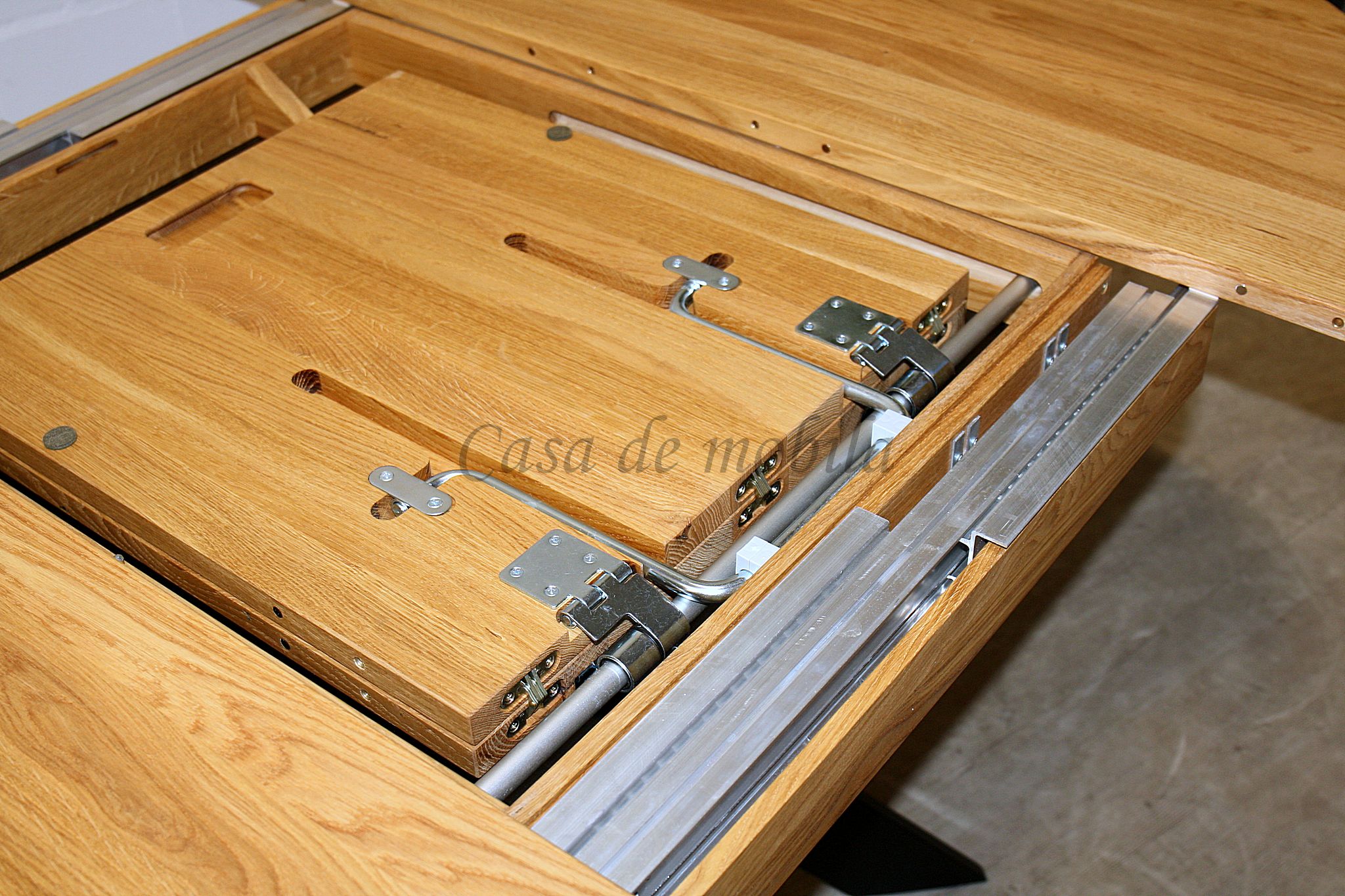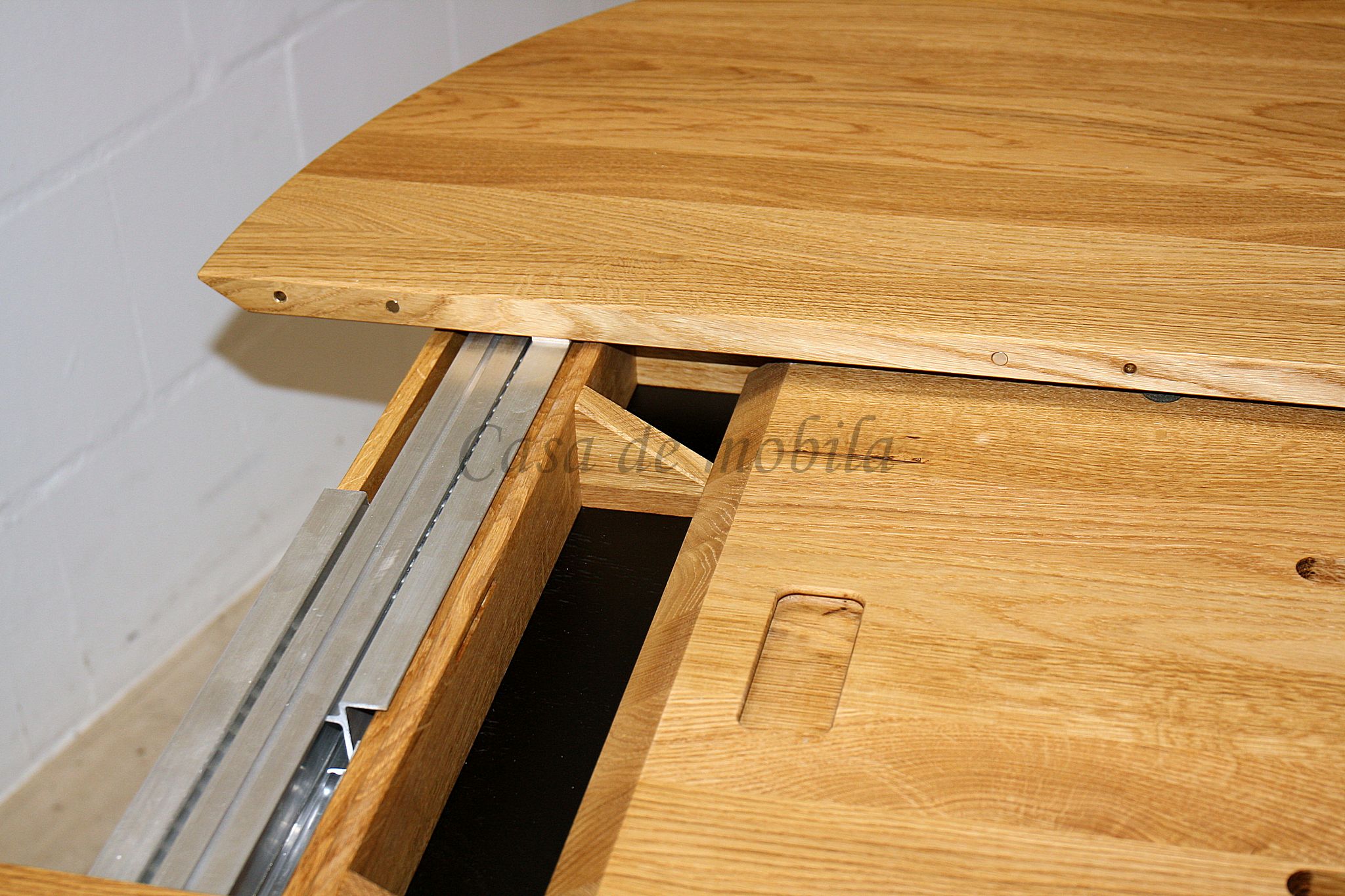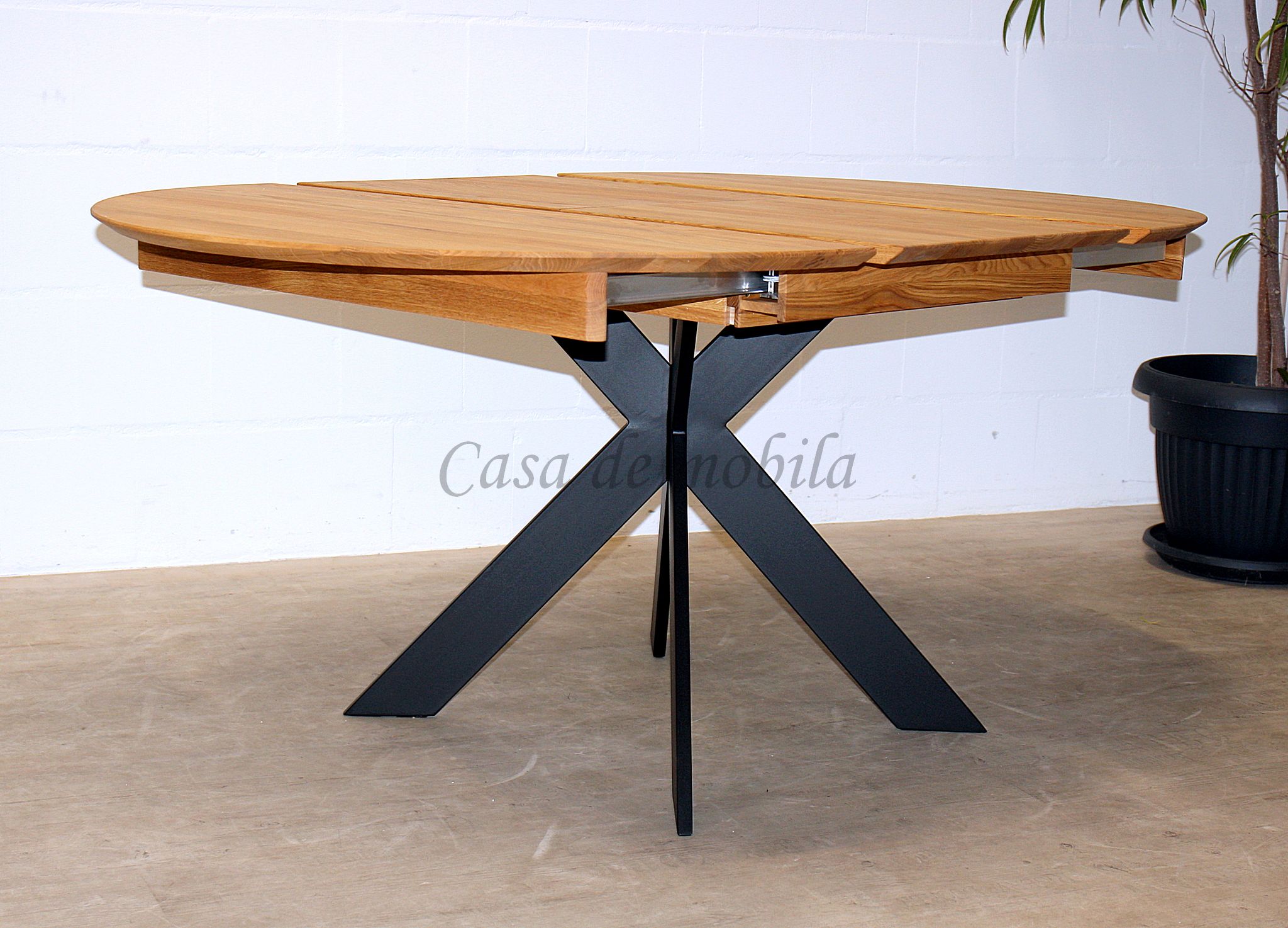 Die Tischplatte des runden Esstisches hat einen Durchmesser von 115 cm. Sie ist mit der innenliegenden Einlegeplatte auf 165x115 cm erweiterbar.