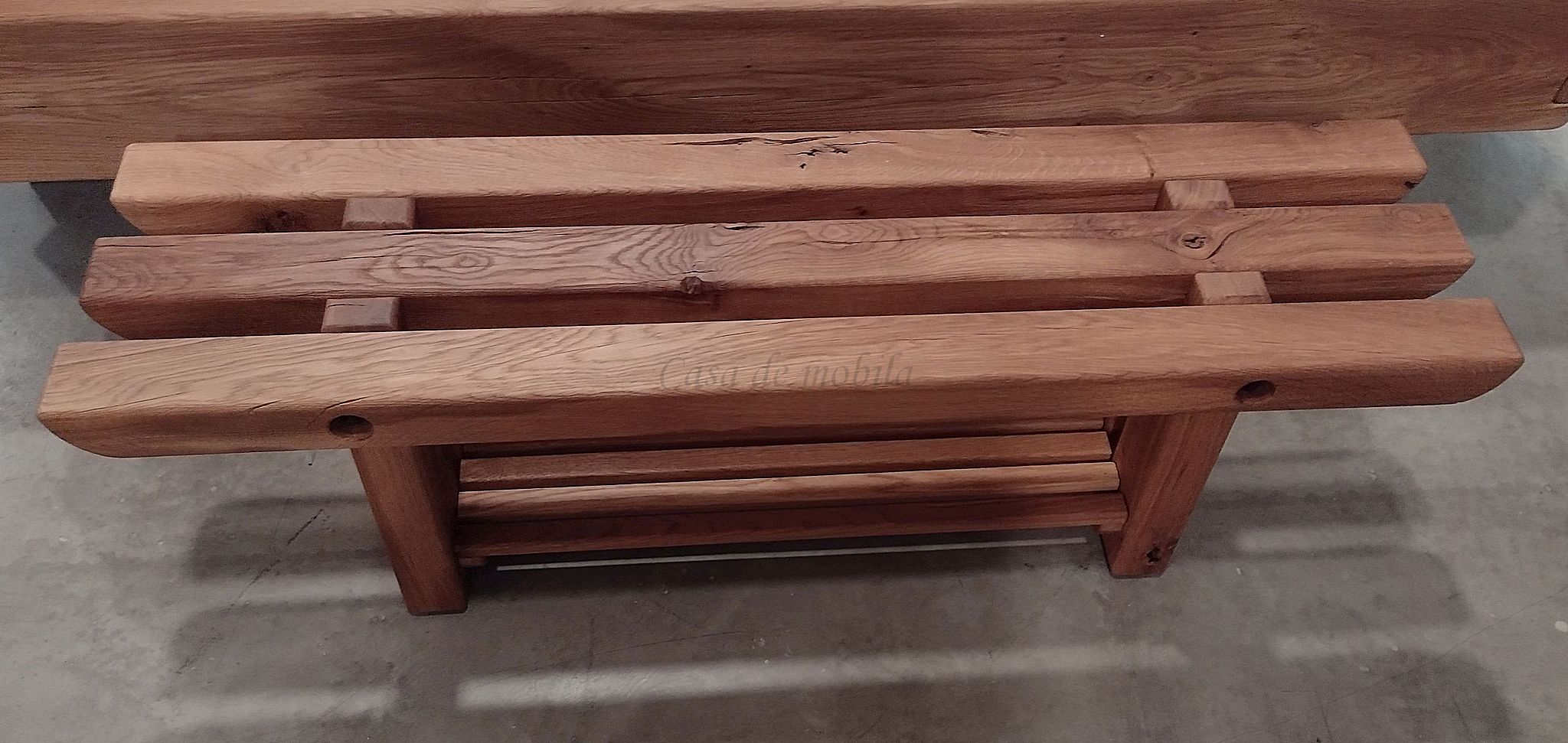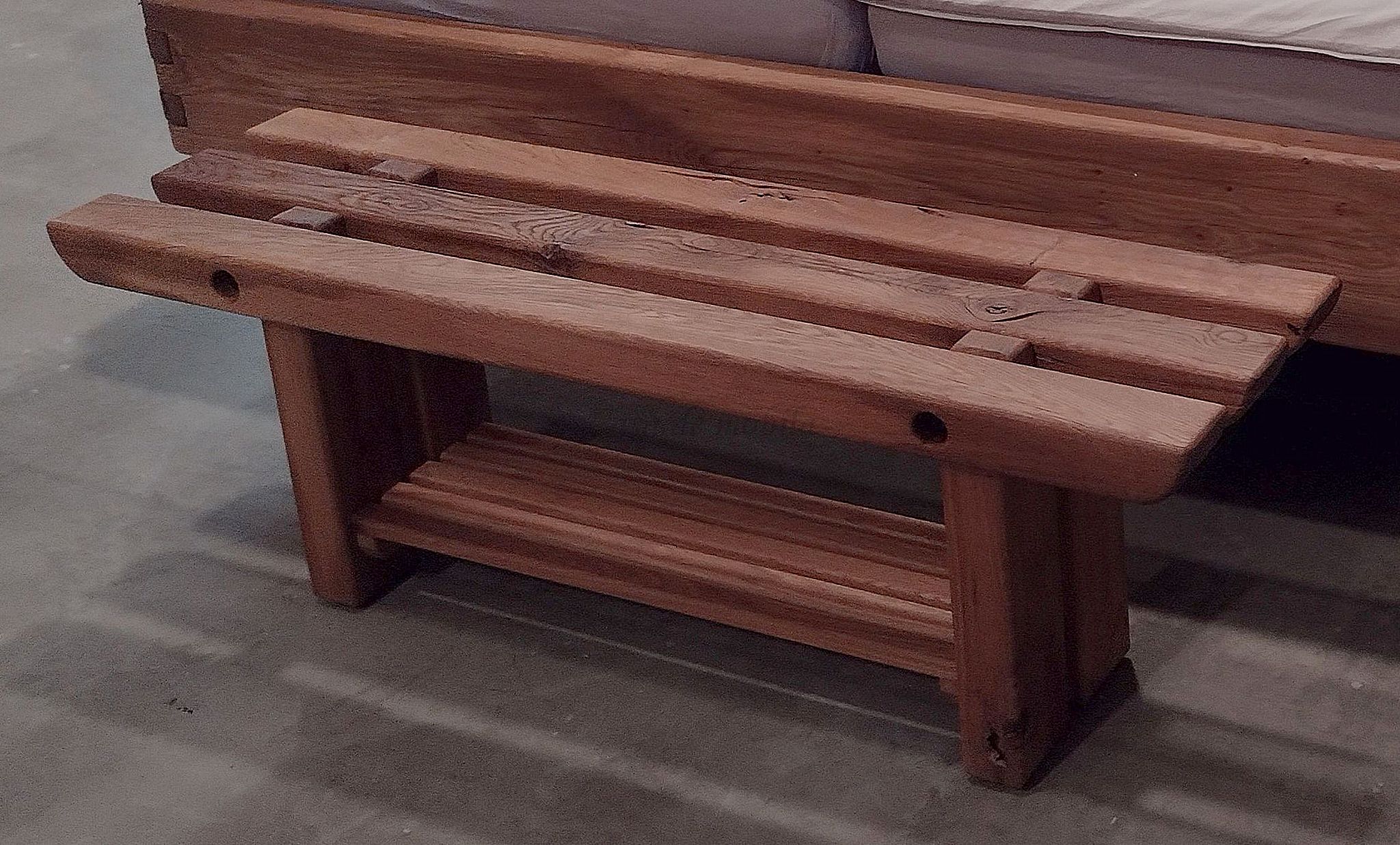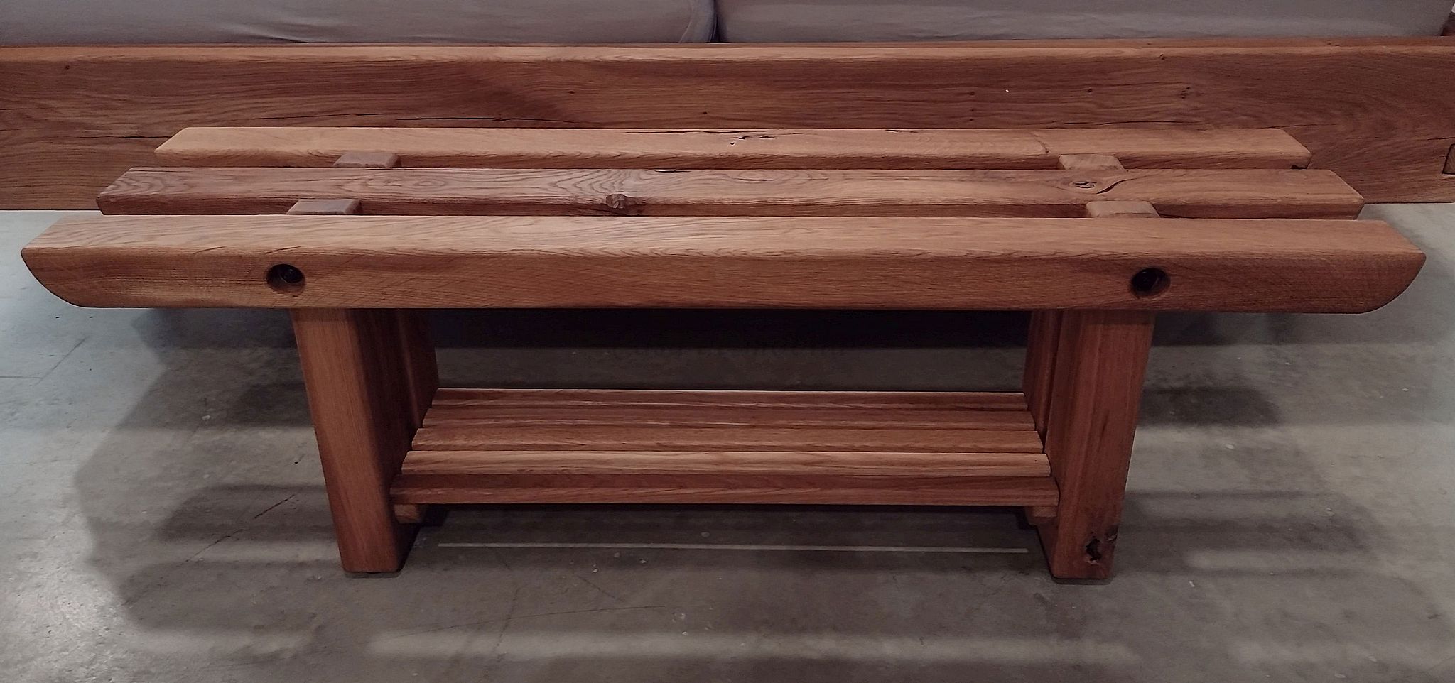 Die Schlafzimmer-Bettbank ist aus massiver Wildeiche gefertigt und hat einen Ablageboden.
