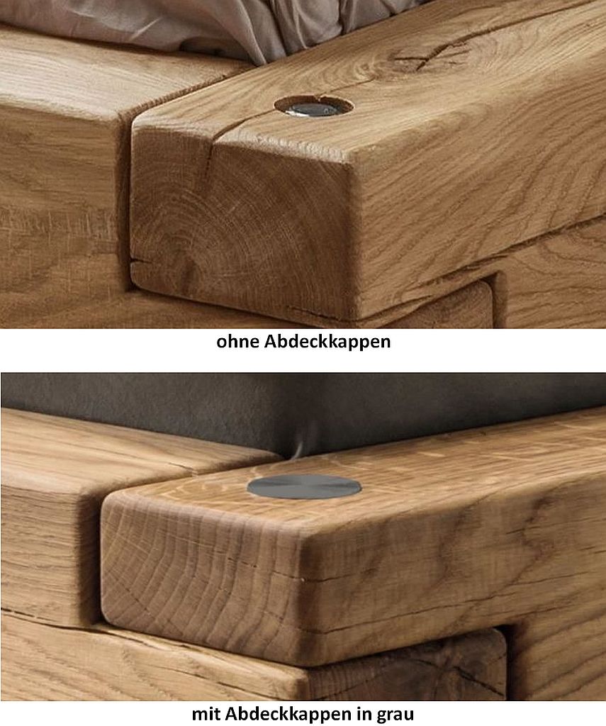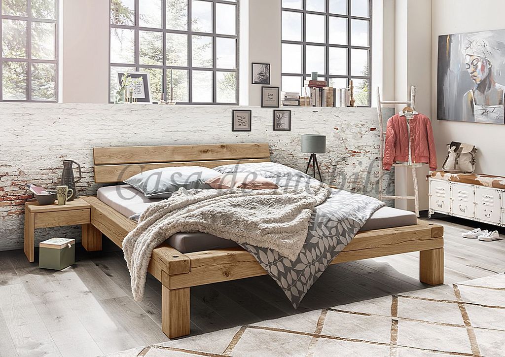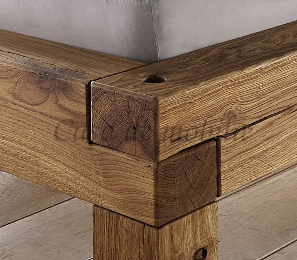Die massiven Holzbalken des Bettes haben rustikale Wuchsrisse und eine Stärke von 12x15 cm.