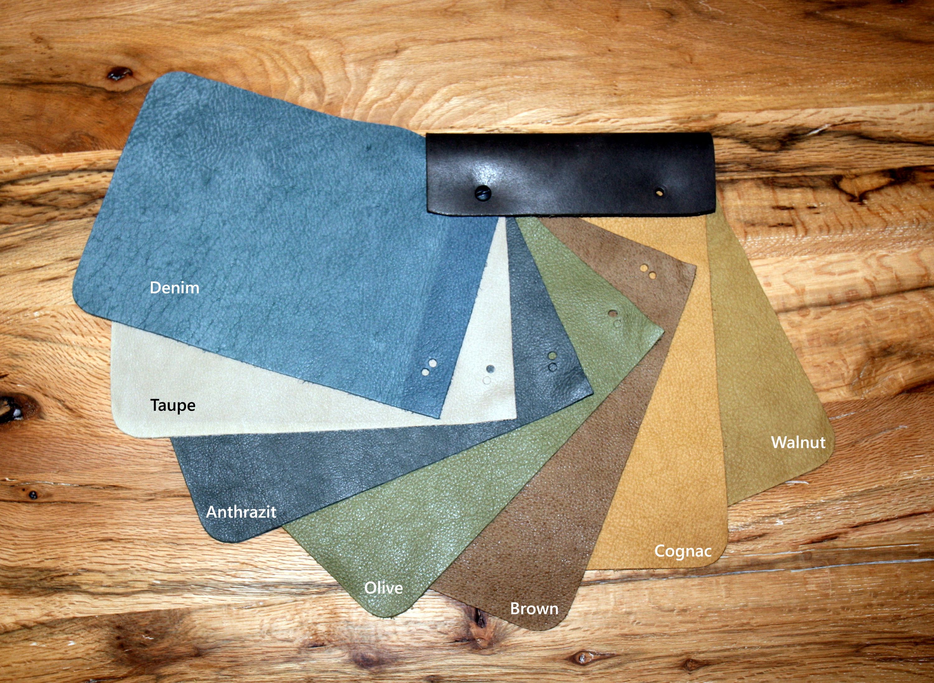 Die Dielenbank hat eine Sitzfläche aus Leder und einen Metall-Ablagerost.