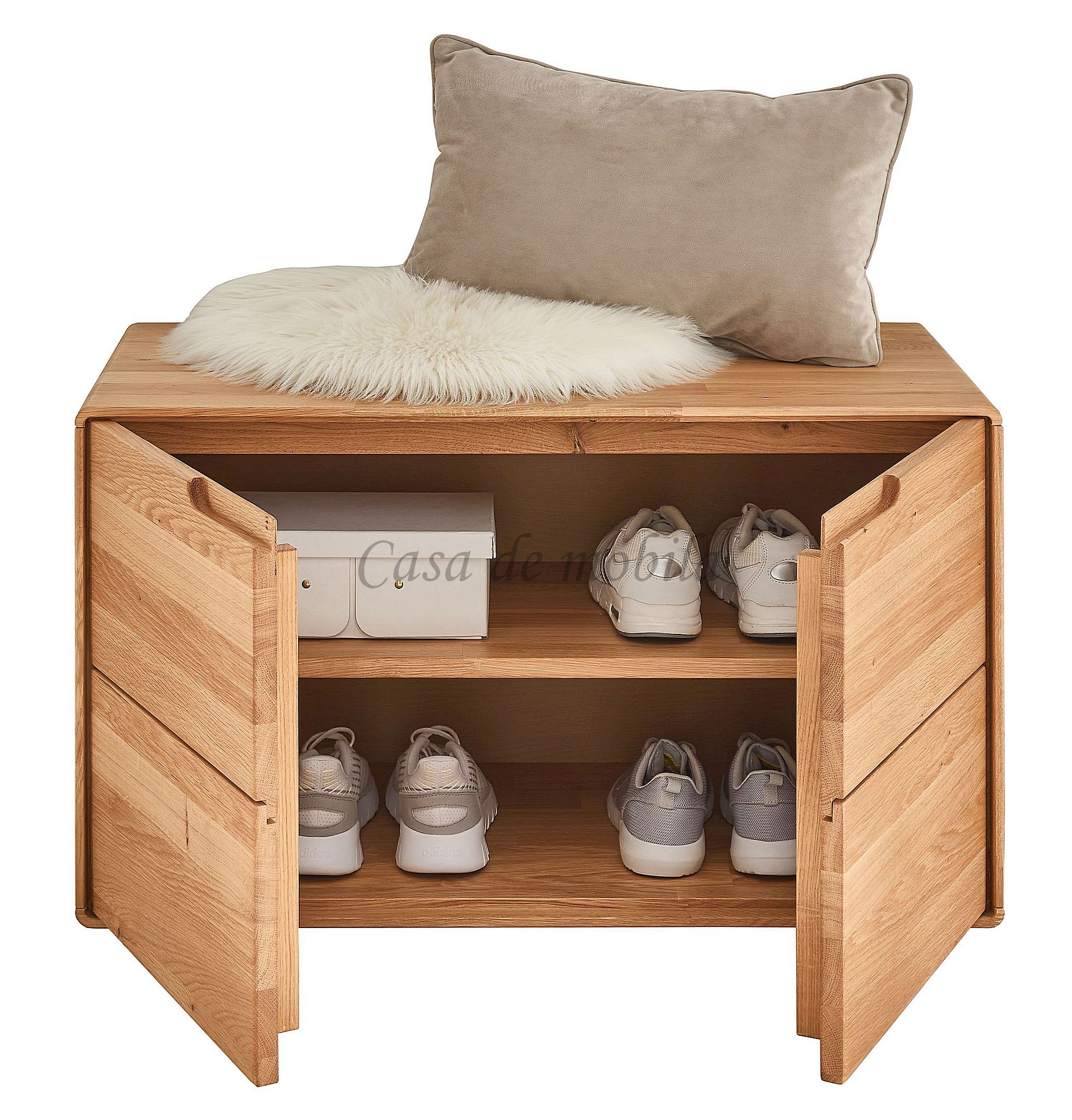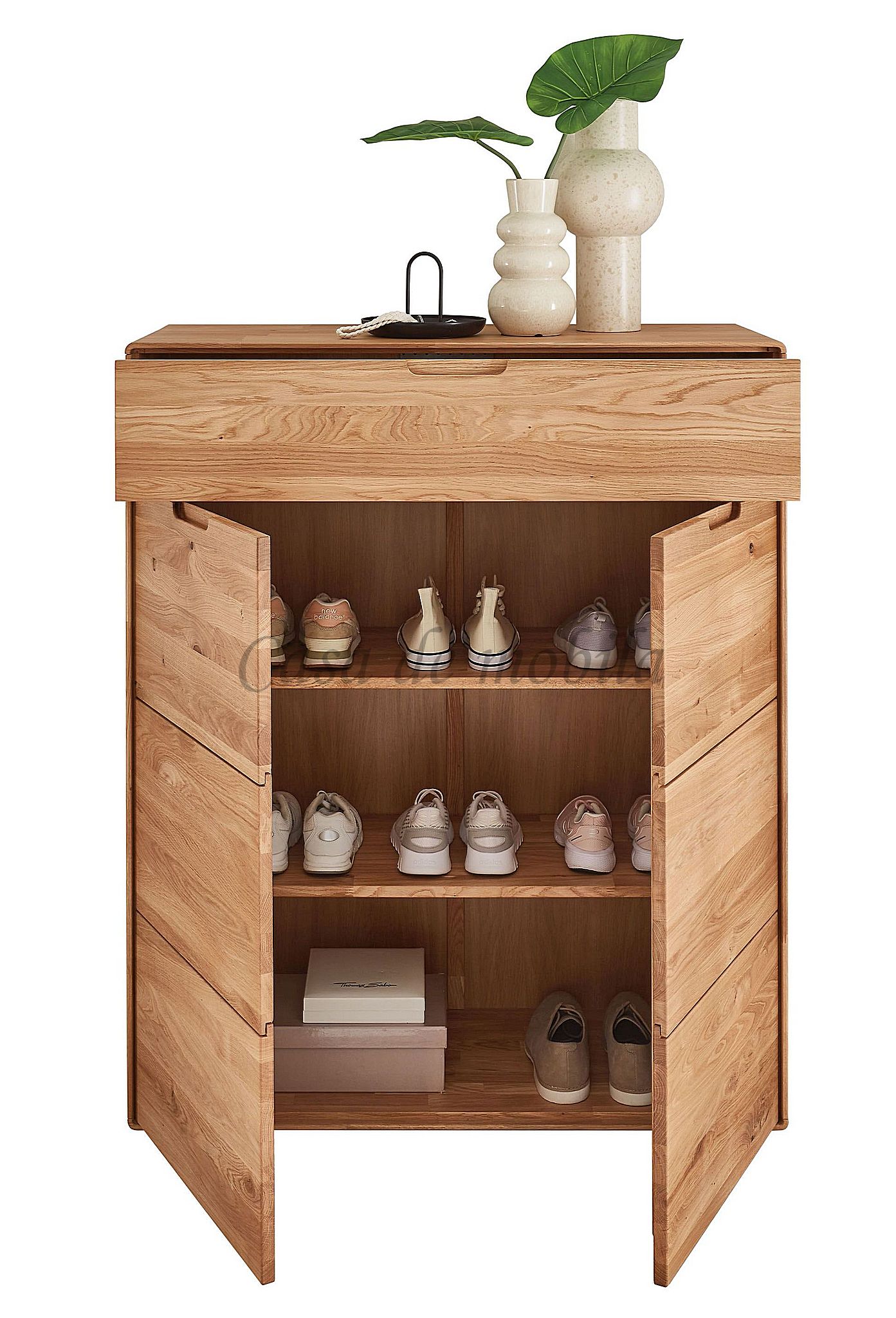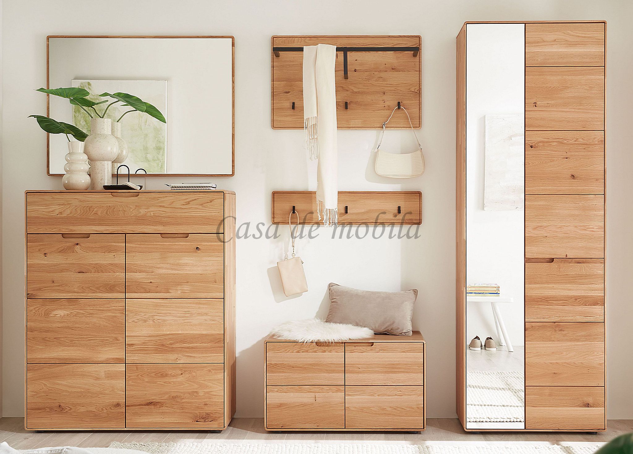 Das 6-teilige Dielen-Set GOSE aus massiver, geölter Wildeiche vereint natürliche Ausstrahlung mit durchdachter Funktionalität für Ihren Eingangsbereich. Der großzügige Dielenschrank bietet viel Stauraum für Jacken und Accessoires und sorgt für ein aufgeräumtes Gesamtbild. Der Schuhschrank schafft hinter zwei Türen ordentlich Platz für Ihre Schuhe und hält den Flur strukturiert. Die Dielenbank kombiniert eine stabile Sitzgelegenheit mit praktischem Stauraum und unterstreicht die warme Holzoptik. Ergänzt wird das Set durch eine Hakenleiste sowie eine Wandgarderobe, die funktionale Aufhängemöglichkeiten mit massivem Eichenholz verbinden. Der passende Wandspiegel rundet das Ensemble harmonisch ab und lässt den Raum heller und großzügiger wirken.