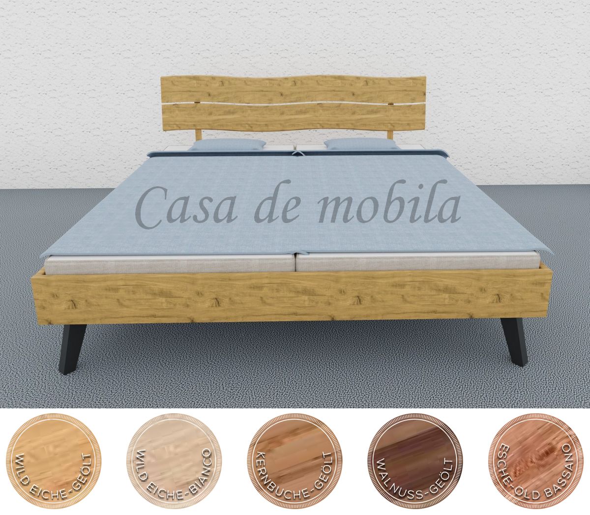 Das Doppelbett MODERN SLEEP besticht durch eine harmonische Verbindung von Natur und Moderne. Aus massivem Holz gefertigt, ist es in den Varianten Kernbuche, Wildeiche, Nussbaum und Esche erhältlich, was jedem Schlafzimmer eine warme und natürliche Atmosphäre verleiht. Das zweiteilige Kopfteil mit einer markanten Baumkante unterstreicht die Individualität jedes Bettes und hebt die natürliche Maserung des Holzes hervor.