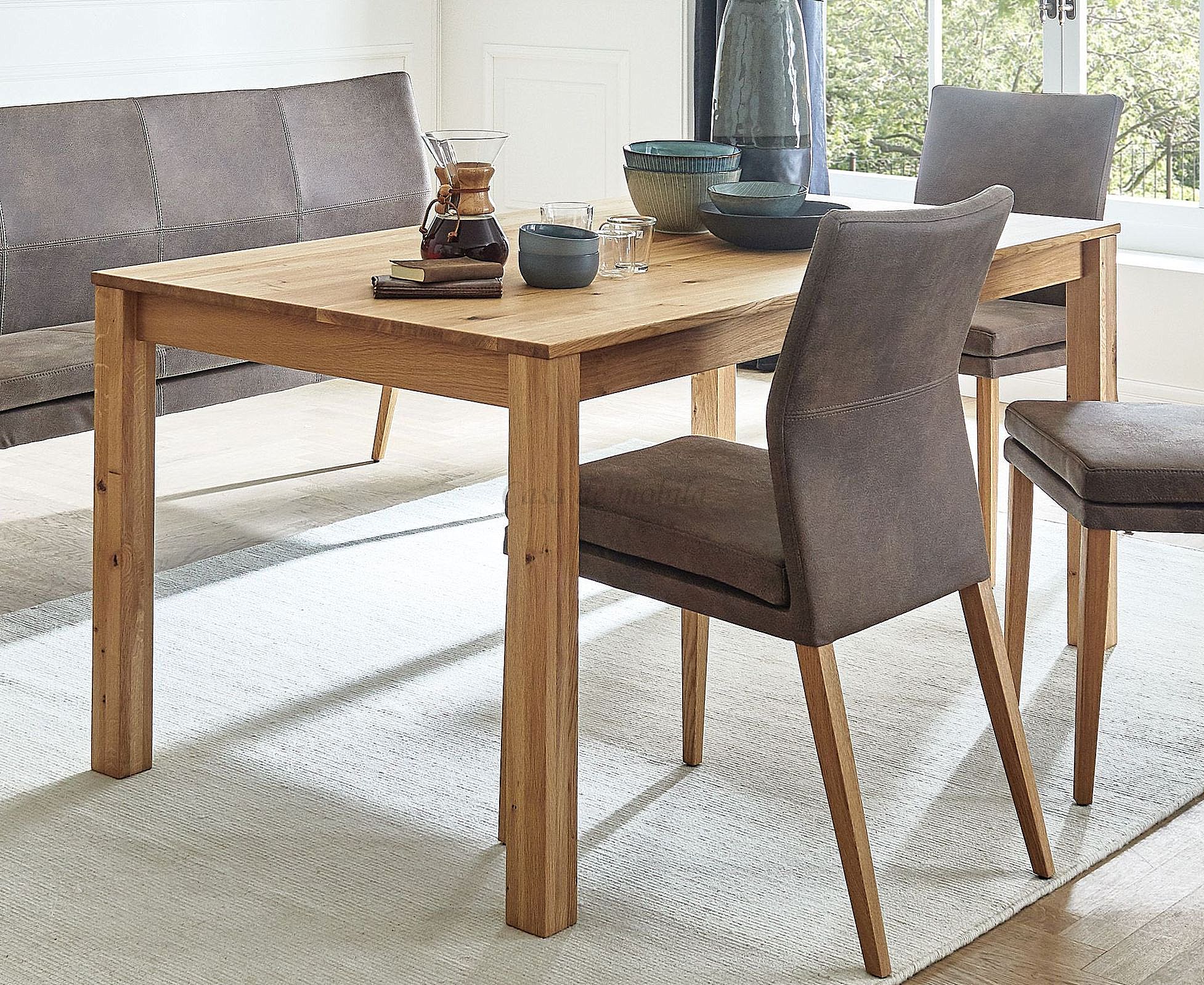 Dieser moderne Esstisch mit seiner Massivholzplatte aus Kernbuche oder Wildeiche und 2 Auszügen mit 47 cm überzeugt im vollen Umfang. Ein absoluter Blickfang in ihrem Esszimmer.