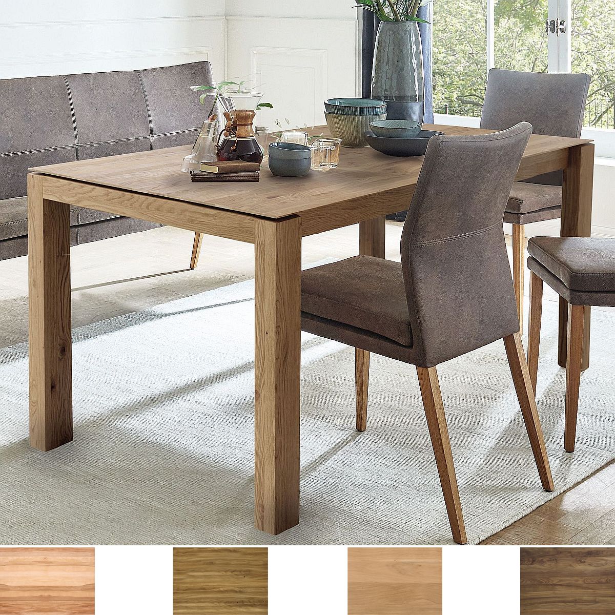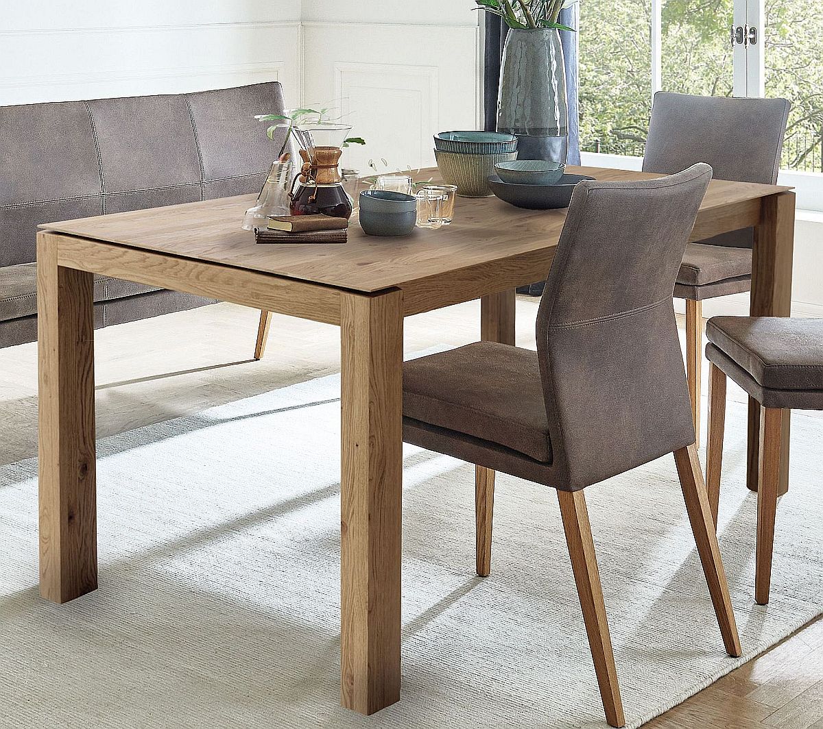 Dieser moderne Esstisch mit seiner Massivholzplatte aus Kernbuche oder Wildeiche und Auszug mit 95 cm überzeugt im vollen Umfang. Ein absoluter Blickfang in ihrem Esszimmer.