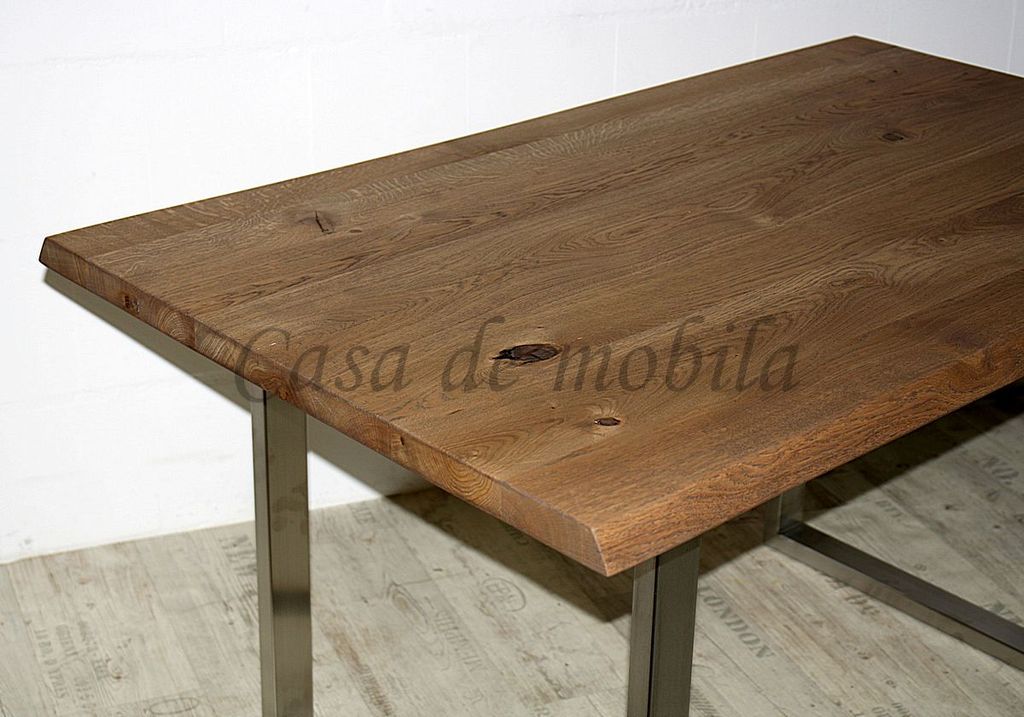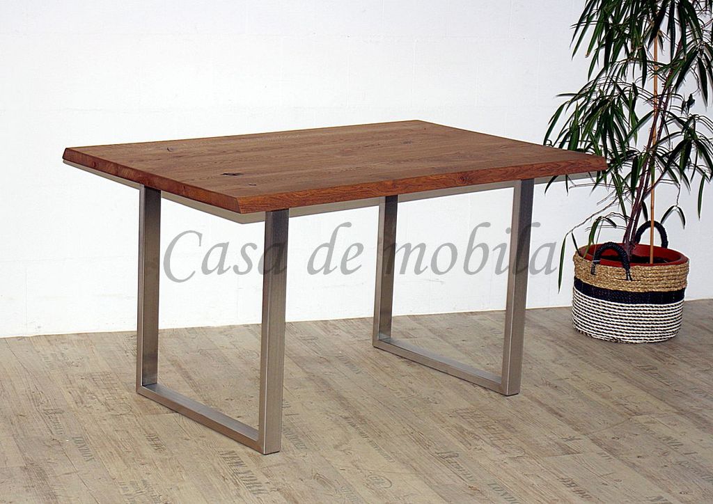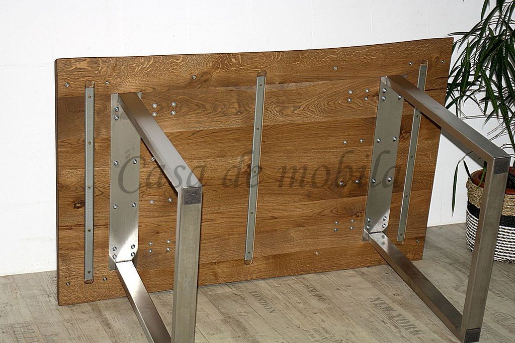 Dieser moderne Esstisch mit seiner Kombination aus stillvollem Edelstahl-Kufen-Gestell und einer Massivholzplatte aus Wildeiche überzeugt im vollen Umfang. Ein absoluter Blickfang in ihrem Esszimmer.