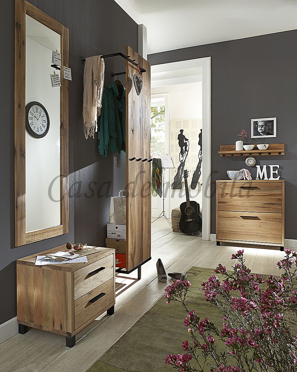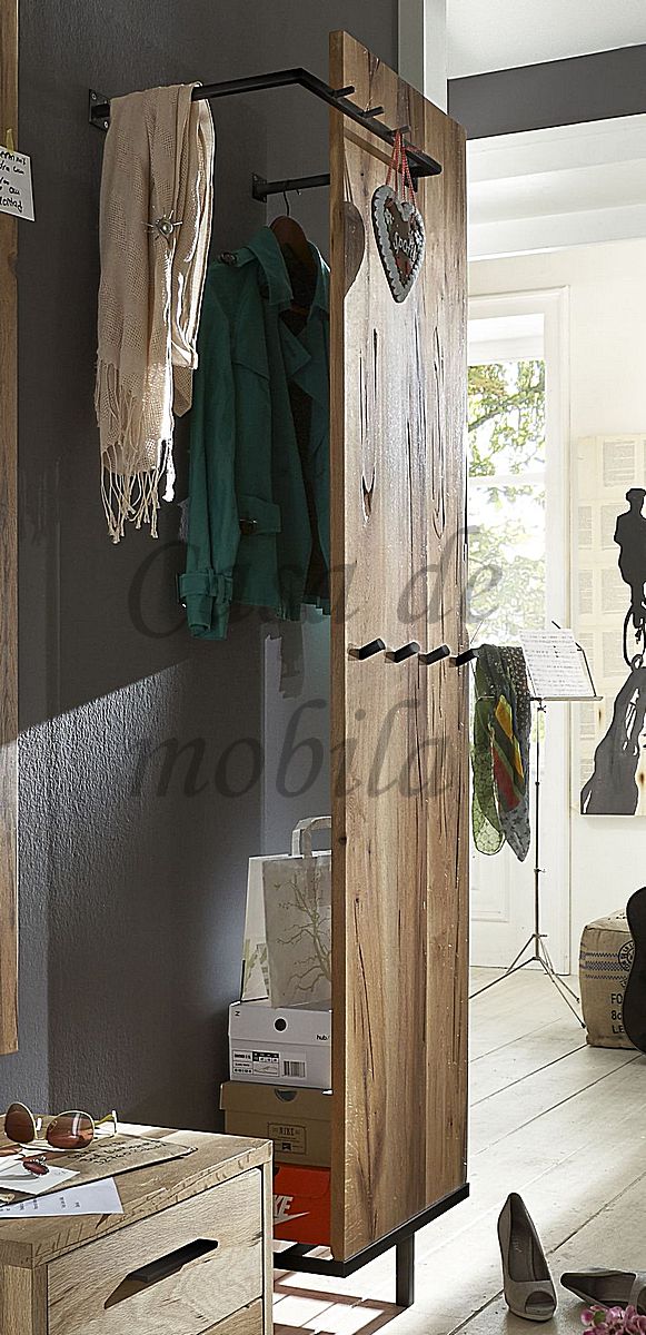 Die Kombination aus massivem Holz und schwarzen Metallelementen verleiht dem Dielenpaneel einen modernen Loft-Look. Mehrere stabile Garderobenhaken bieten ausreichend Platz für Jacken, Mäntel oder Taschen.