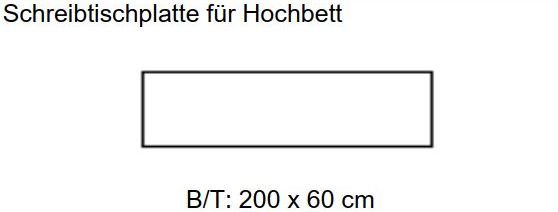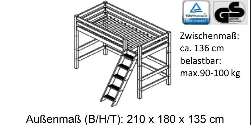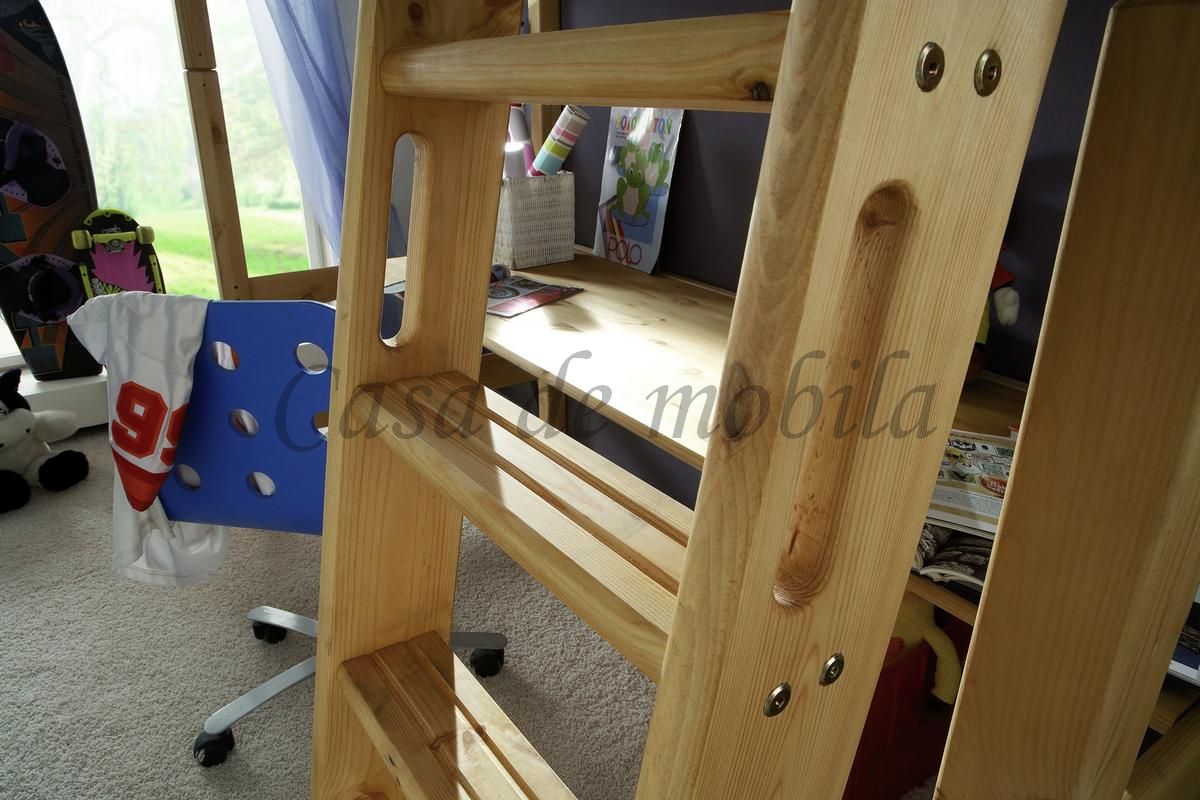 Das Hochbett ist mit einer Schrägleiter und einem Rollrost ausgestattet. Unter dem Bett ist eine Schreibtischplatte befestigt.