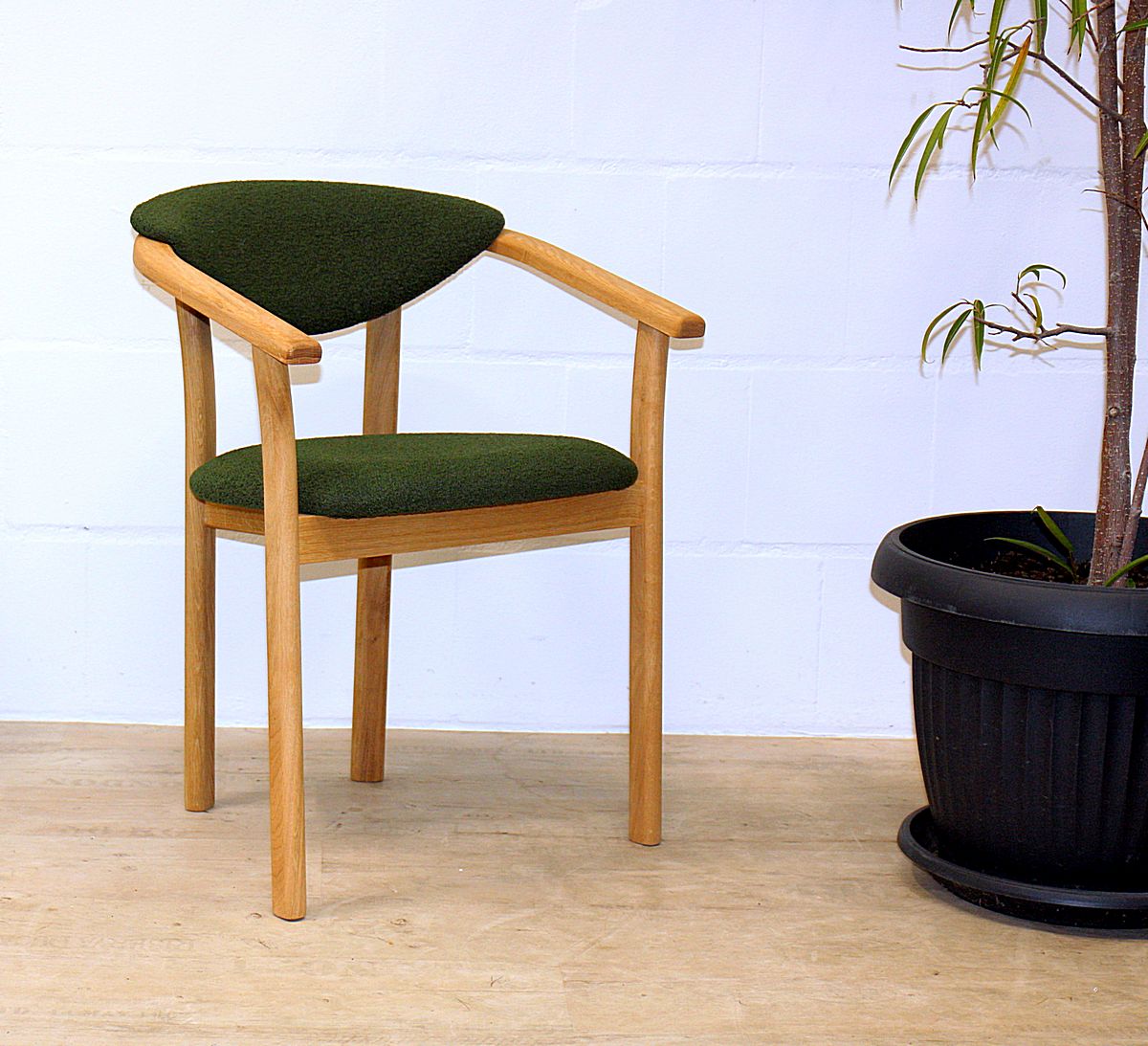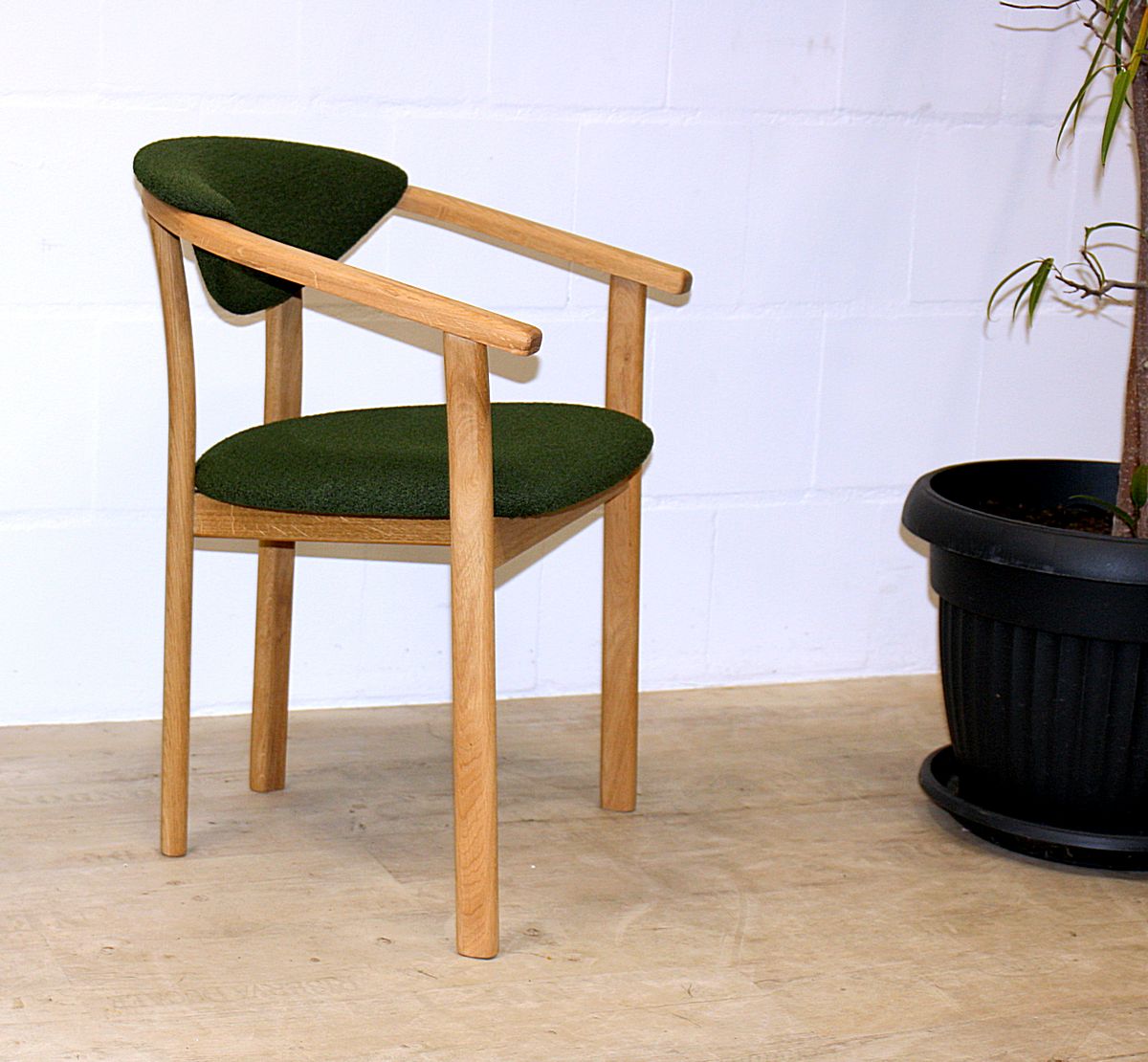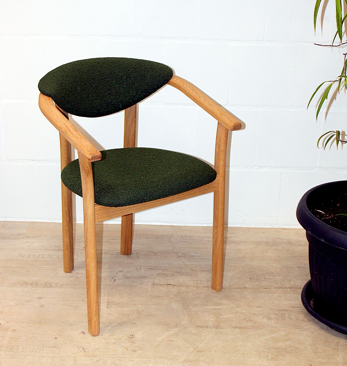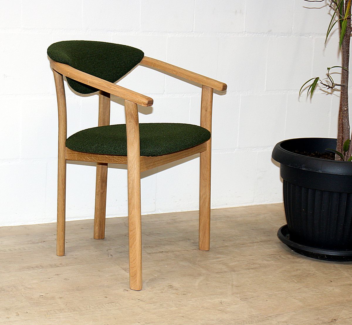 Sitz- und Rückenfläche sind komfortabel gepolstert und mit einem edlen, dunkelgrünen Stoff bezogen. Der harmonische Farbkontrast zwischen dem warmen Holzton und dem satten Grün verleiht dem Stuhl eine moderne und zugleich zeitlos elegante Note. Die sanft geschwungene Rückenlehne sowie die integrierten Armlehnen bieten angenehmen Halt und hohen Sitzkomfort – ideal für lange Abende am Esstisch.