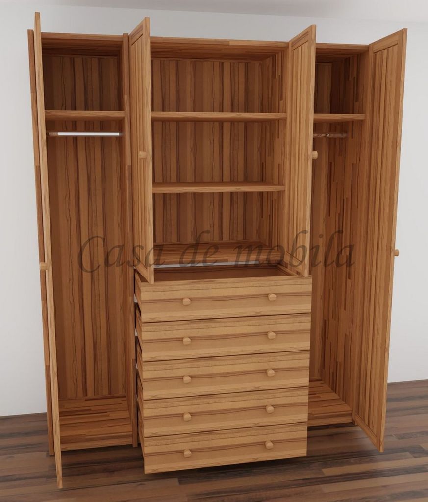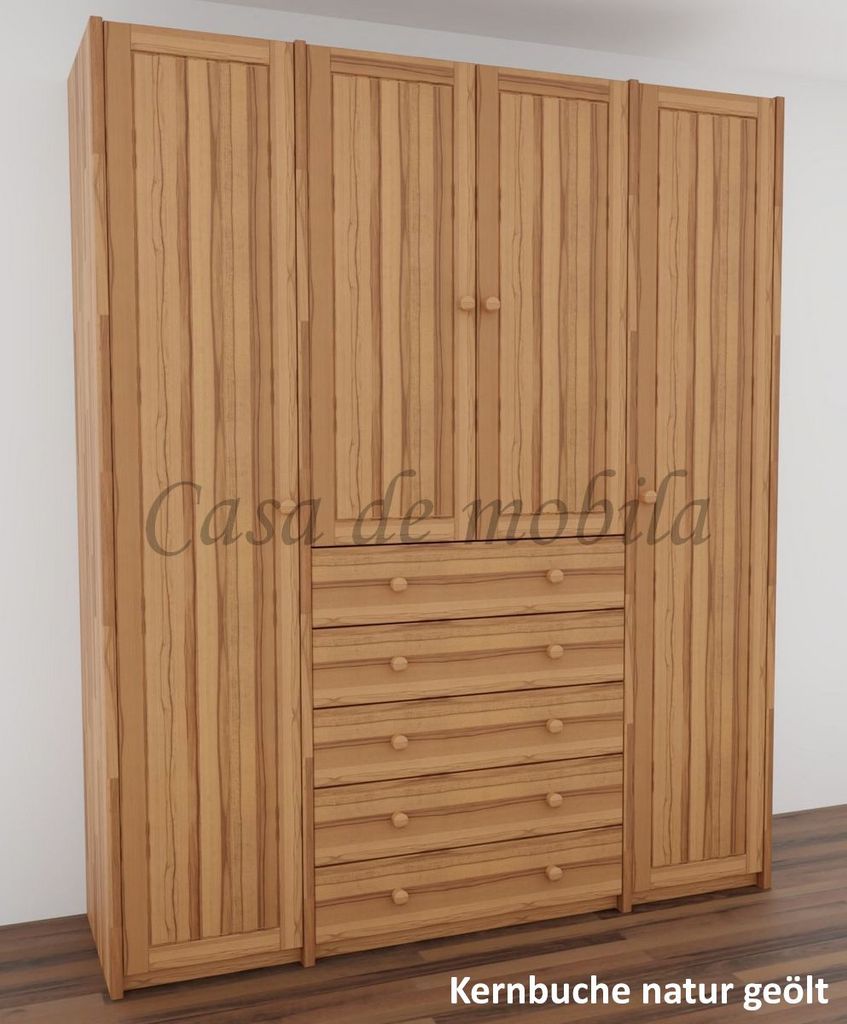 Dieser Kleiderschrank verfügt über fünf große Schubladen, zwei große Holztüren mit je einem Einlegeboden und einer Kleiderstange sowie über zwei kleine Holztüren mit zwei durchgehenden Einlegeböden.