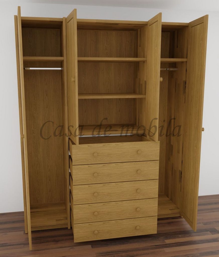 Dieser Kleiderschrank verfügt über fünf große Schubladen, zwei große Holztüren mit je einem Einlegeboden und einer Kleiderstange sowie über zwei kleine Holztüren mit zwei durchgehenden Einlegeböden.