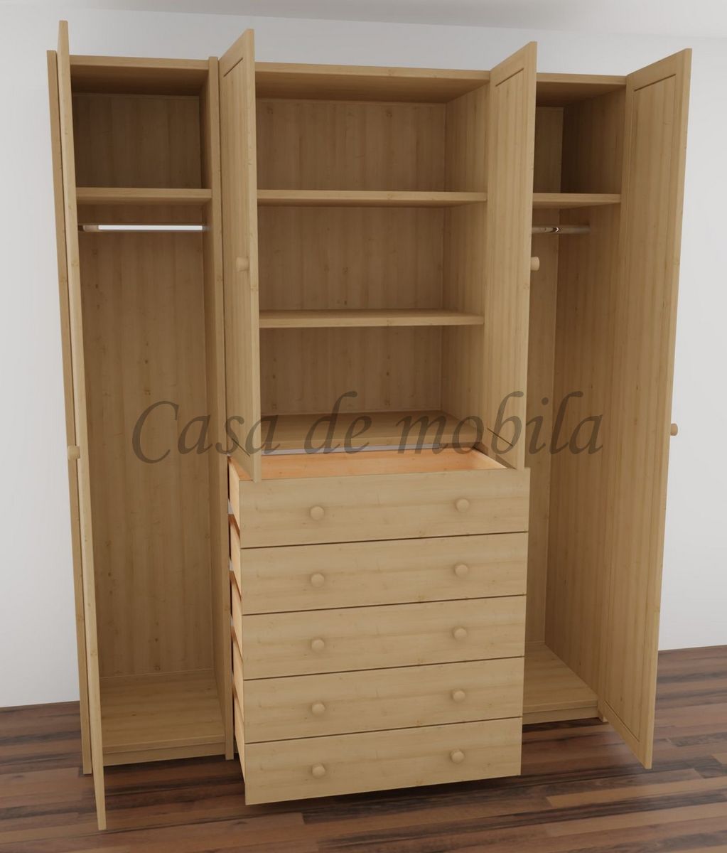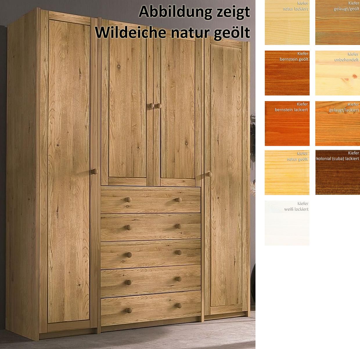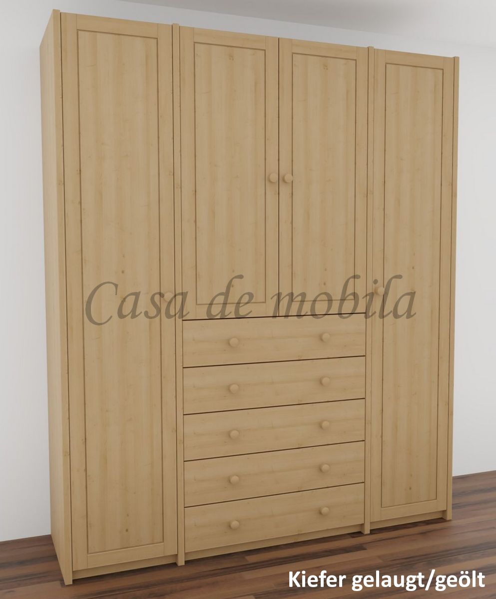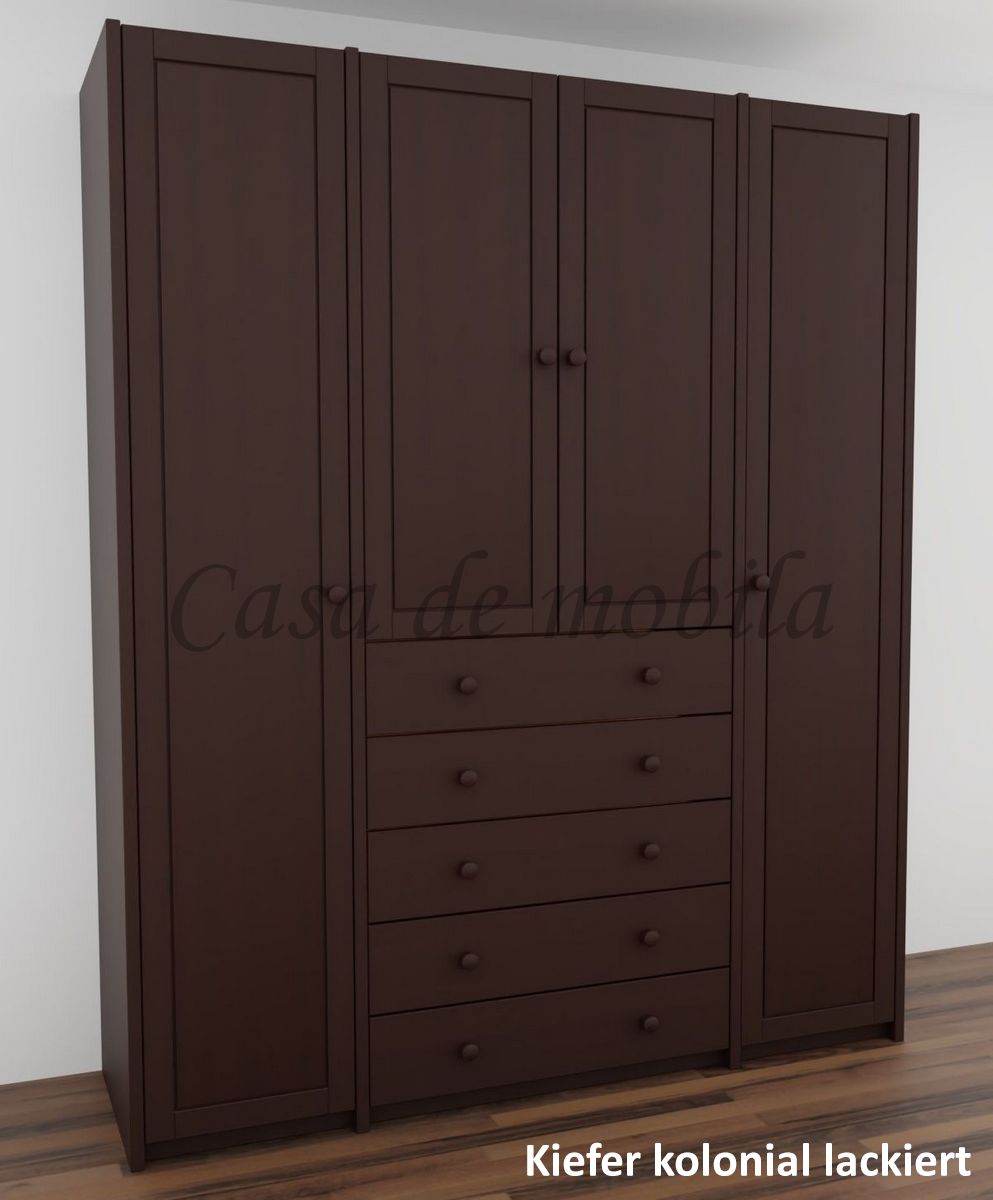 Dieser Kleiderschrank verfügt über fünf große Schubladen, zwei große Holztüren mit je einem Einlegeboden und einer Kleiderstange sowie über zwei kleine Holztüren mit zwei durchgehenden Einlegeböden.