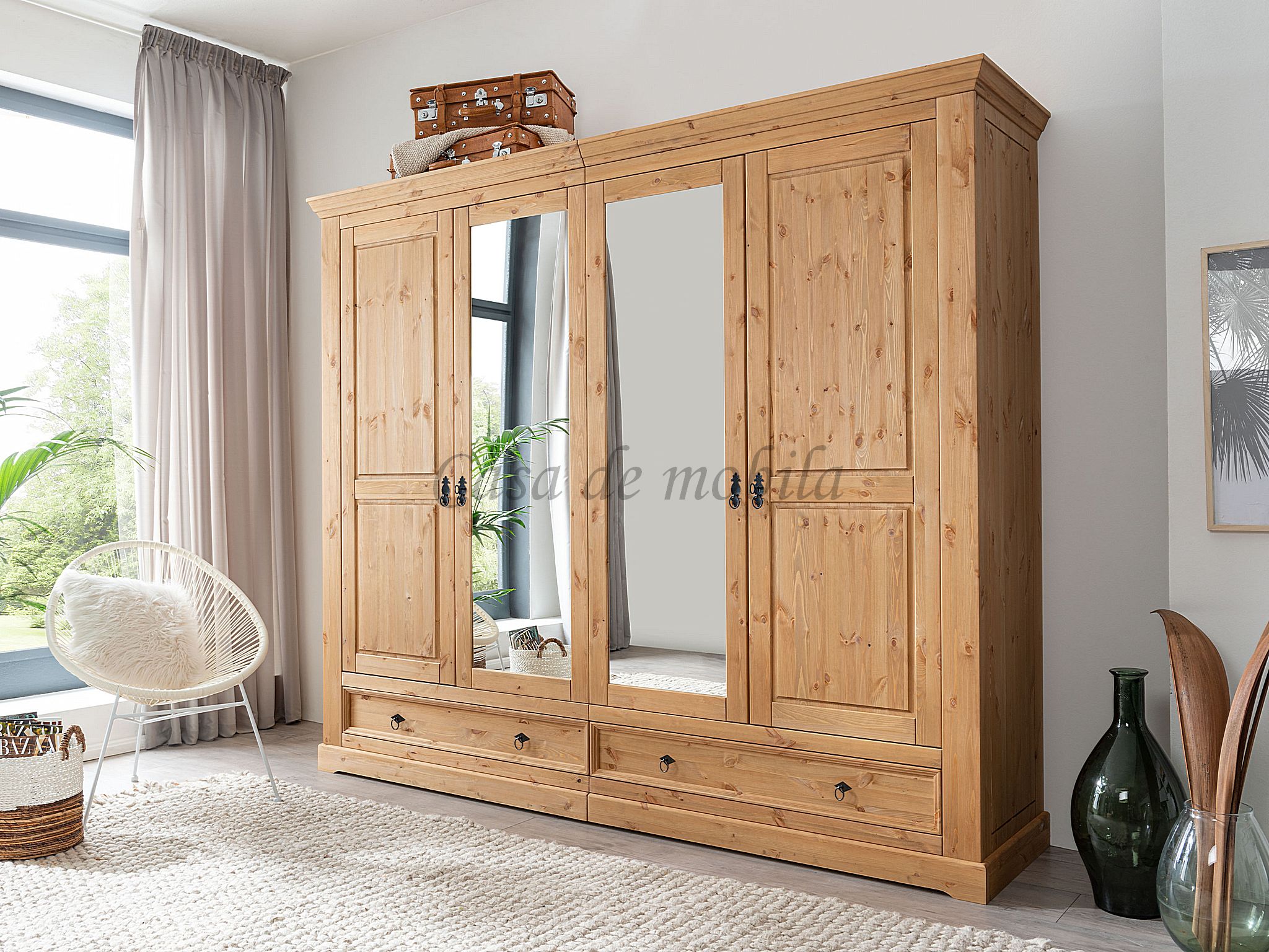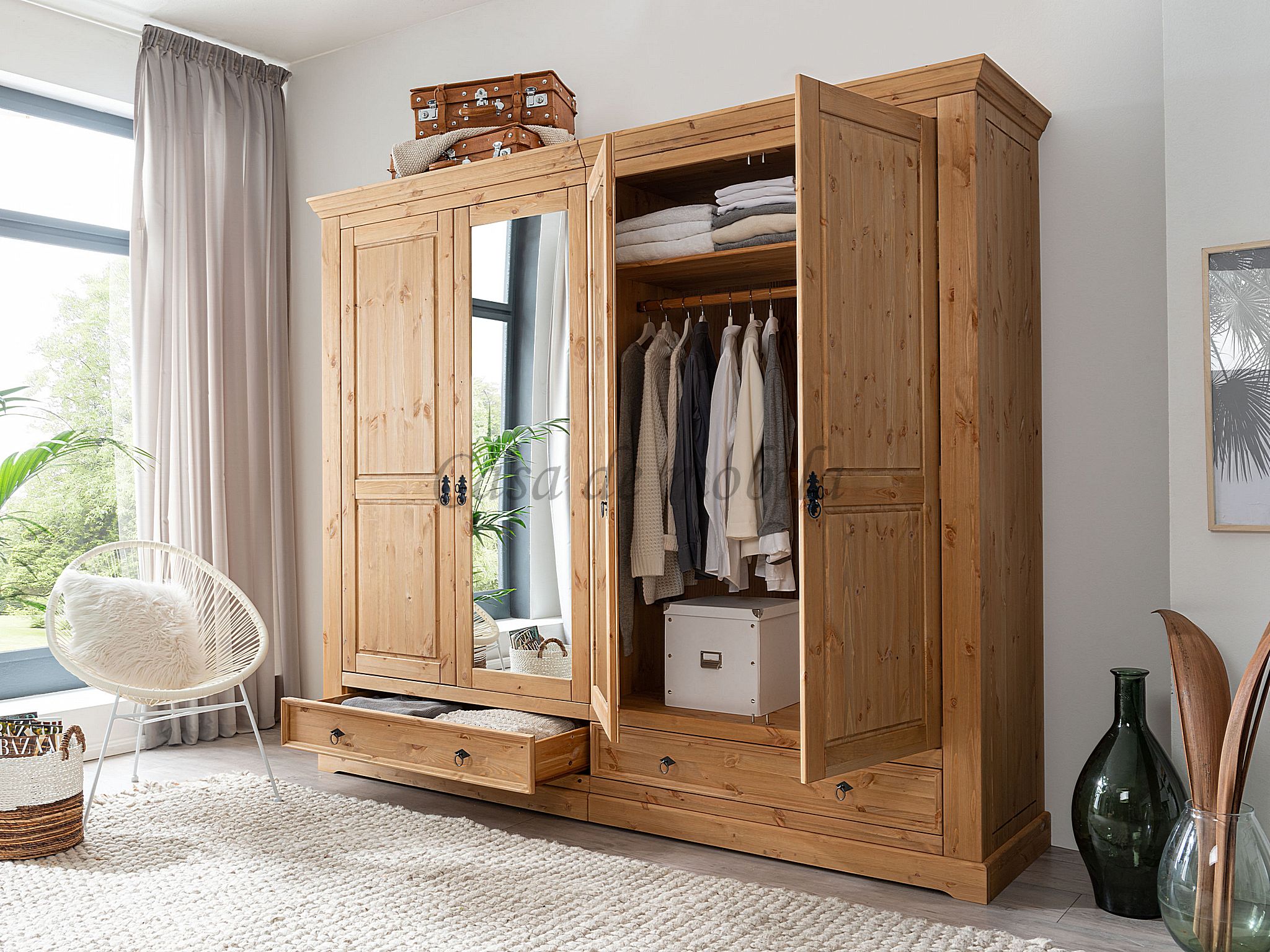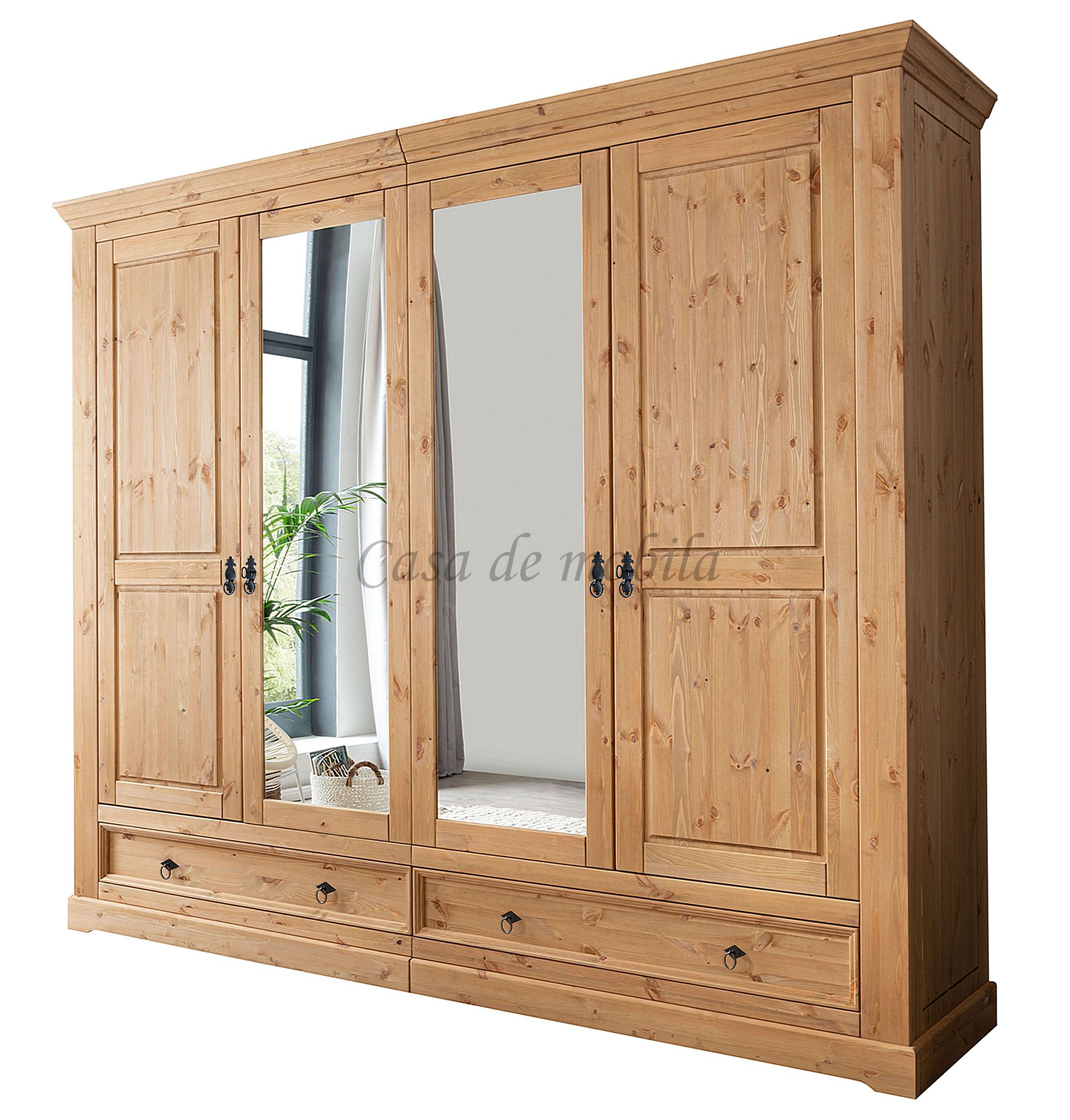 Ein edel und hochwertig verarbeiteter Schrank, gefertigt aus Kiefernholz. Dieser Kleiderschrank besticht durch seine hohe Vielseitigkeit und Eleganz - Hinzu kommen zwei Holztüren, zwei Spiegeltüren, zwei Schubkästen, zwei Holzeinlegeböden, sowie zwei Kleiderstangen - für einen edlen Vollholz-Look. Massive Kiefer ziert dieses Massivholz-Möbelstück. Hergestellt aus bestandsgepflegten Forsten, bietet dieser Schrank das Maximale an Wohnkomfort und überzeugt in seiner herausragenden Qualität. In diesem schicken Möbelstück steckt viel Handarbeit und Liebe zum Detail. Dieses lebendige Naturprodukt zeichnet sich durch seine unverwechselbaren Echtheitsmerkmale aus - Maserungen, Verwachsungen, Unregelmäßigkeiten sowie Spannungen sind typische Eigenschaften und Sie dürfen sich somit auf ein echtes Unikat freuen.