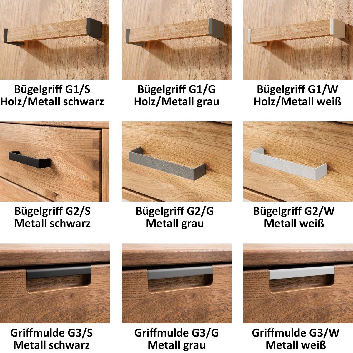 ⚠ Die Fotos zeigen die Ausführung Eiche bianco geölt mit Griffen G1/G und Gleitern.