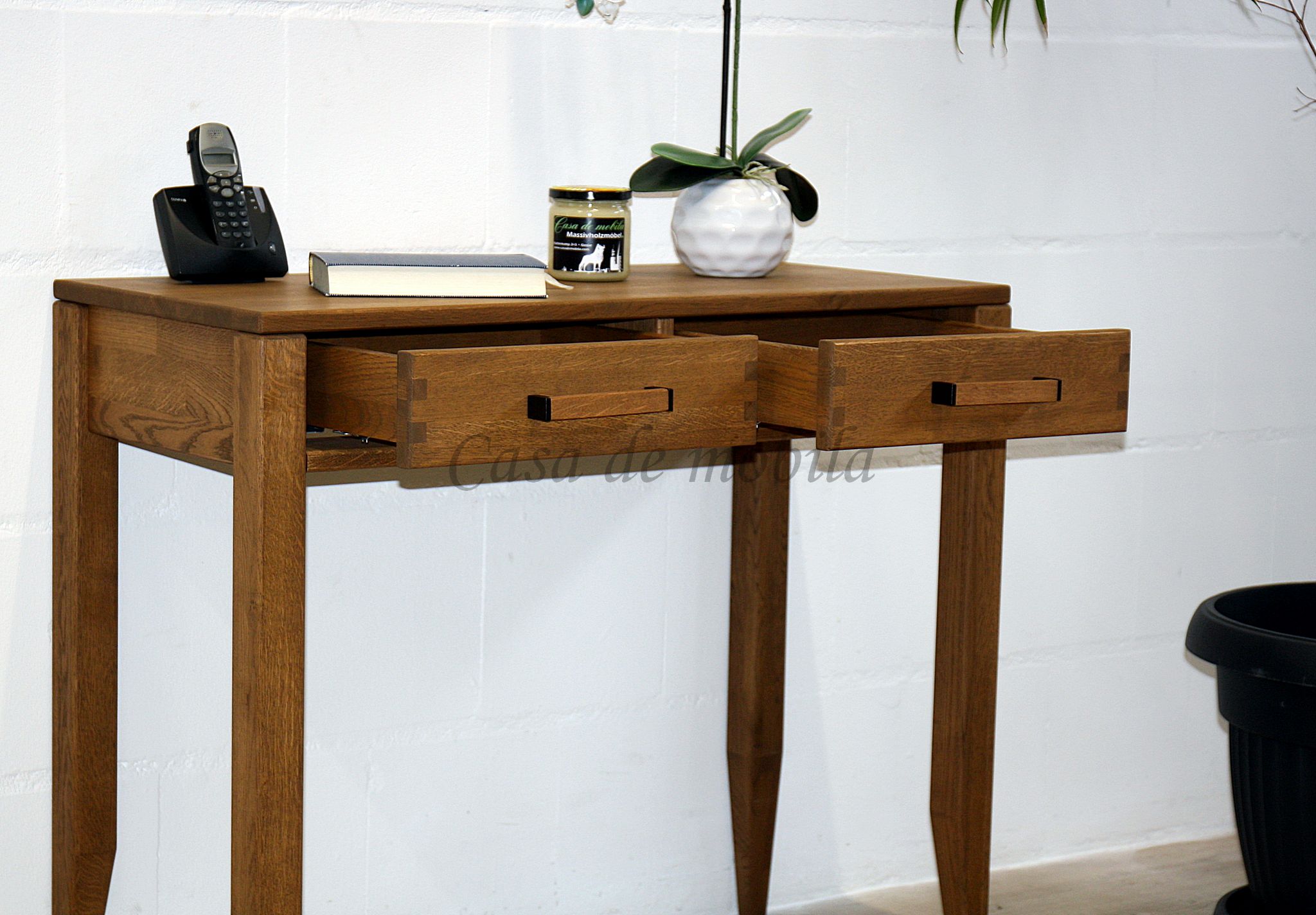 Die Oberfläche des Konsolentisches MIDO ist aus massiver Kernbuche oder Eiche gefertigt und hat eine geölte Oberfläche. Der Tisch ist 90 cm breit und verfügt über zwei Schubladen.