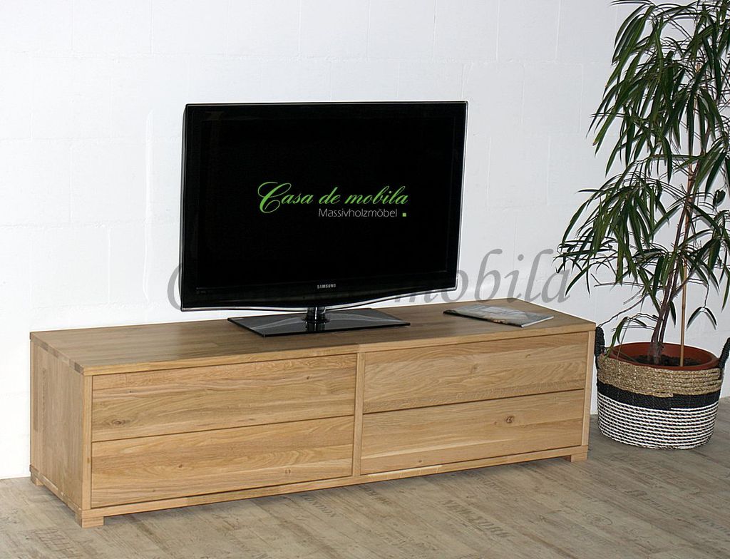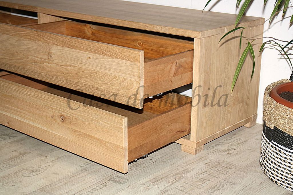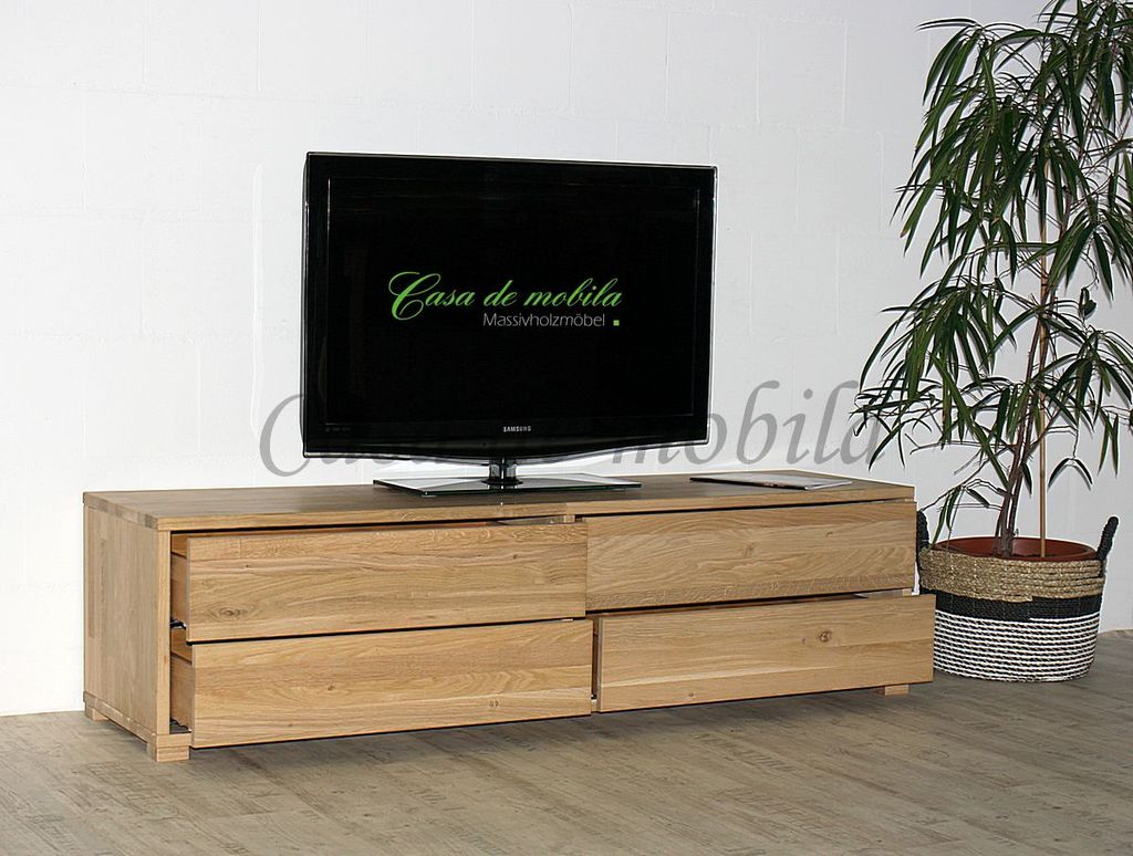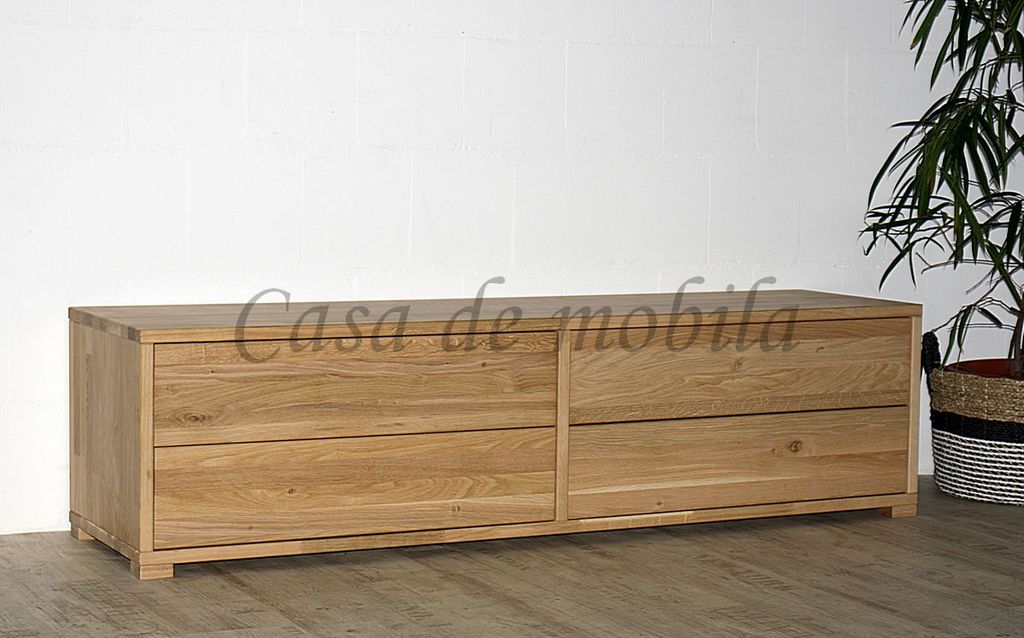 Das TV-Lowboard CONTRA mit 4 Schubladen in 33 cm Tiefe ist aus Buchenholz oder Eichenholz lieferbar. Es stehen verschiedene Oberflächenbehandlungen wie geölt, lackiert, bianco oder weiß zur Auswahl. Das Möbelstück wird in Dänemark aus Massivholz gefertigt.