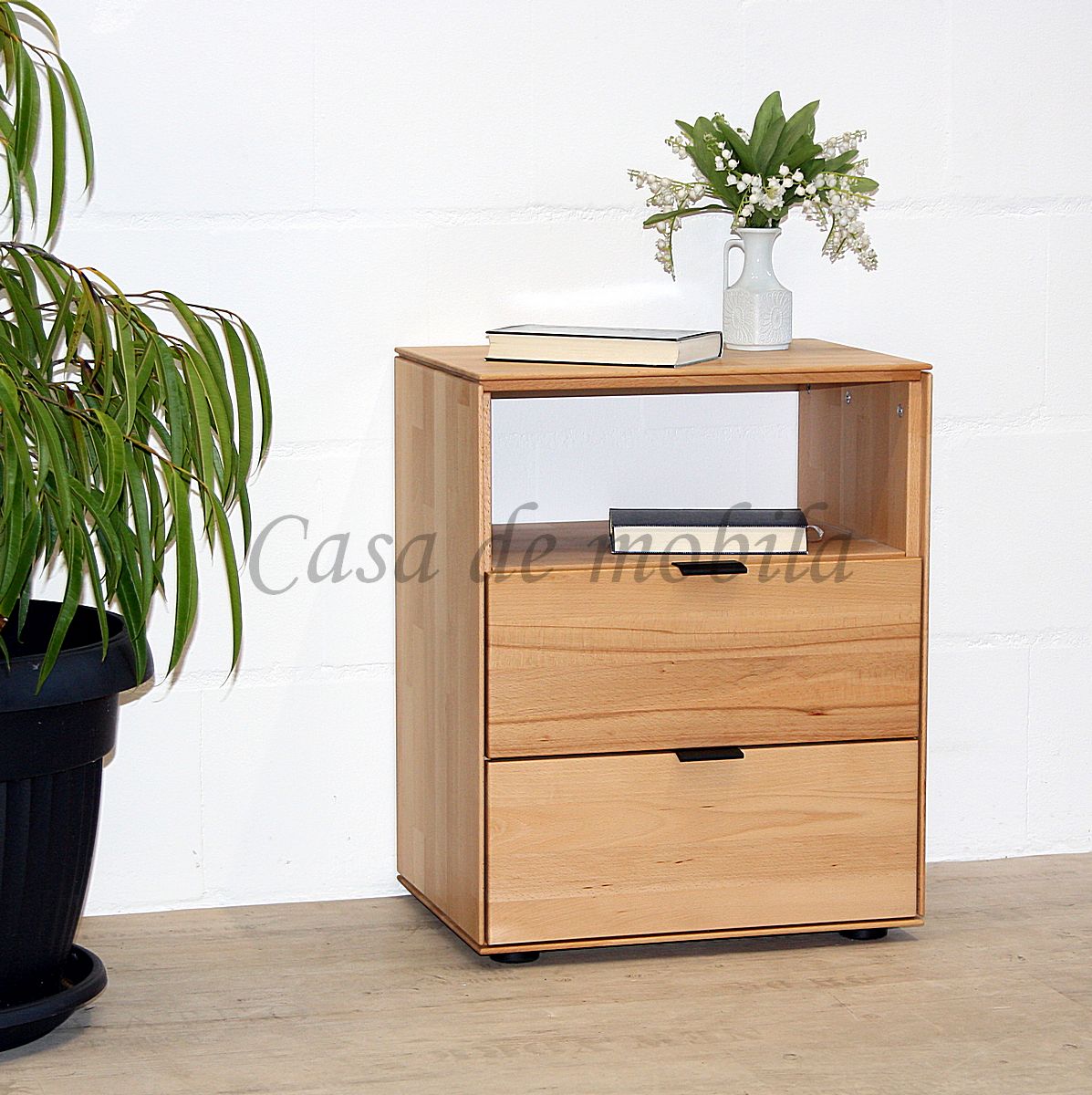 Die Nachtkommode verfügt über ein offenes Ablagefach und zwei Schubladen. Während das Ablagefach Platz für Bücher oder einen Wecker bietet, lassen sich in den beiden Schubladen persönliche Gegenstände ordentlich verstauen. Die hochwertige Verarbeitung sorgt dafür, dass die Schubladen leichtgängig sind und sich mühelos öffnen und schließen lassen.