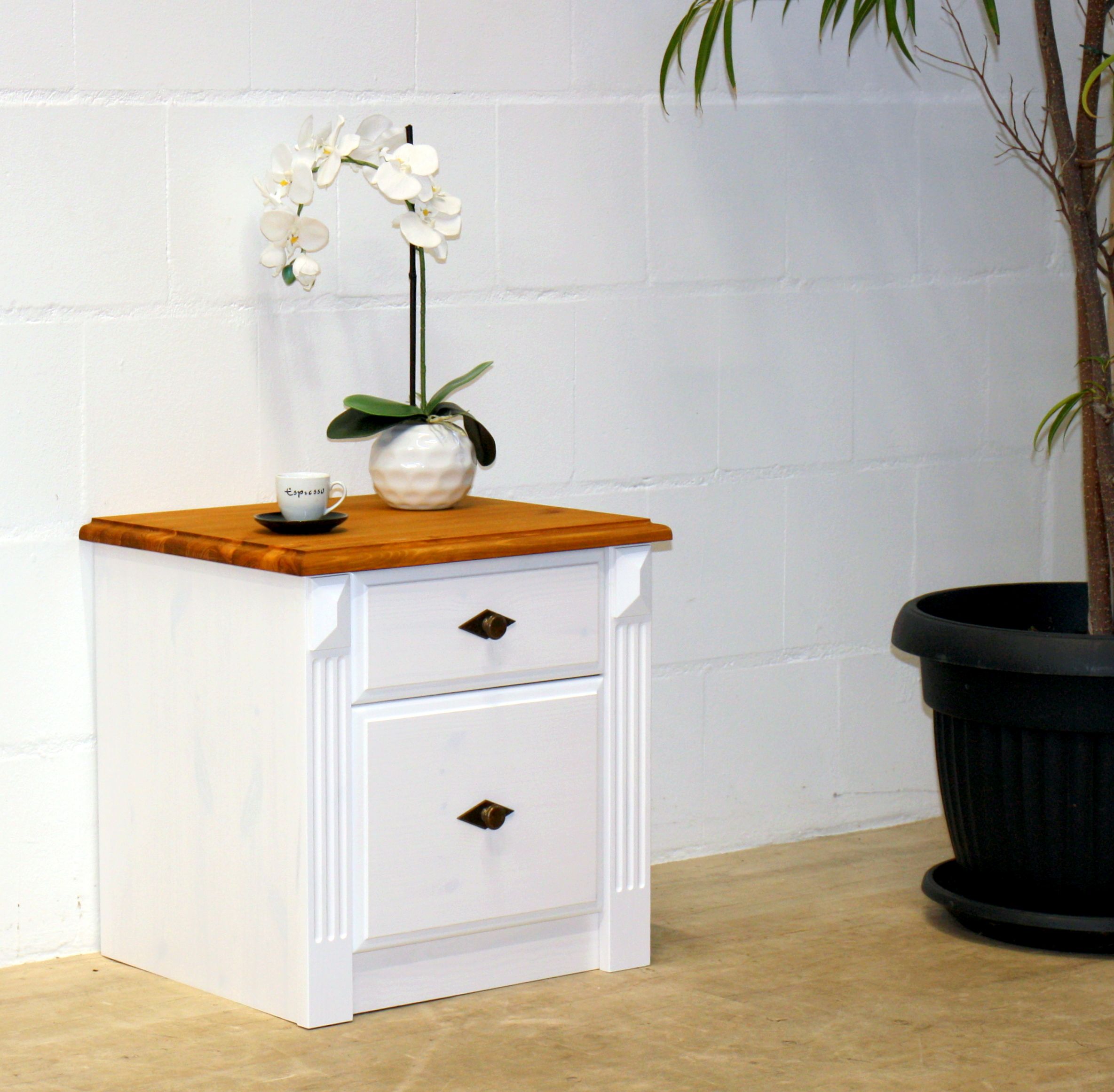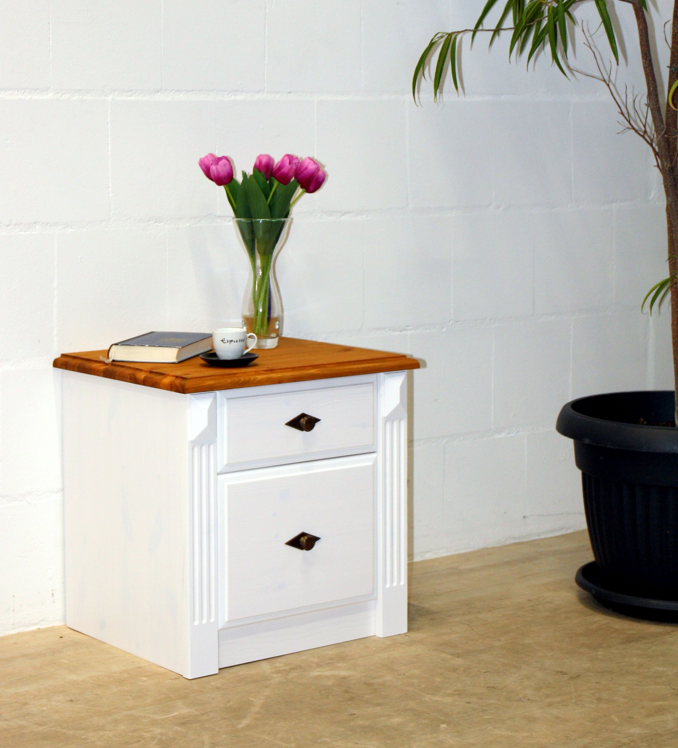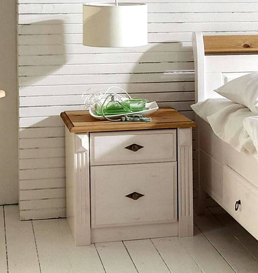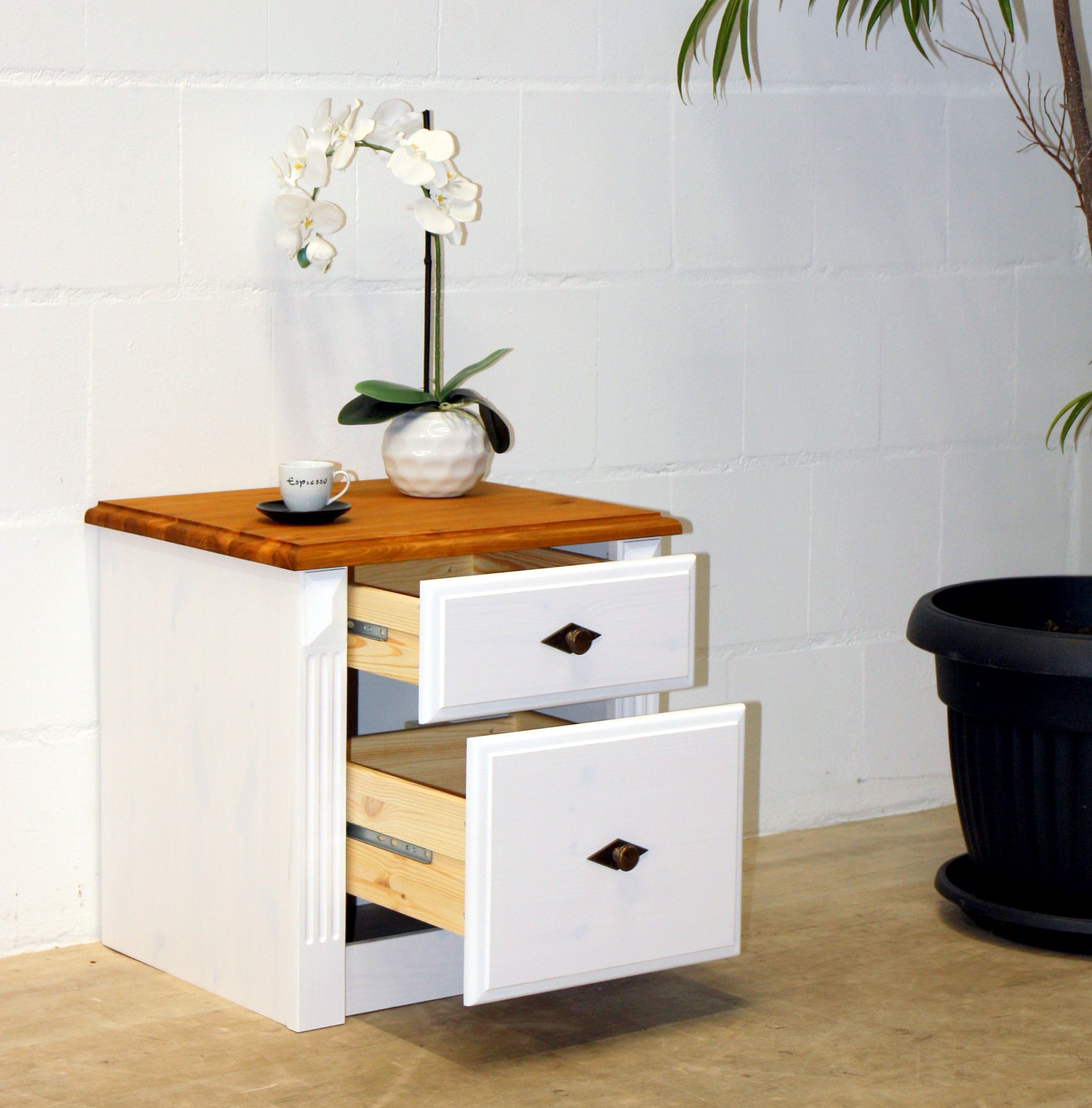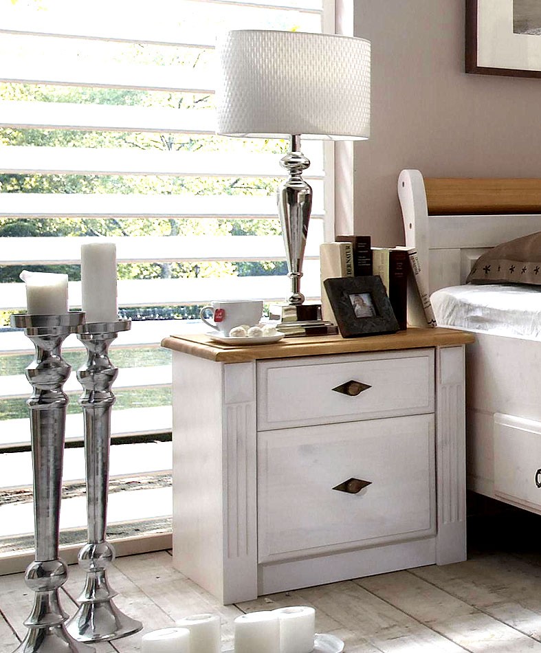 Die Nachtkommode EVA überzeugt mit zeitlosem Landhauscharakter und hochwertiger Verarbeitung aus massiver Kiefer. Der weiß gelaugte und geölte Korpus bringt die natürliche Holzstruktur dezent zur Geltung und sorgt für eine helle, freundliche Ausstrahlung im Schlafzimmer.
