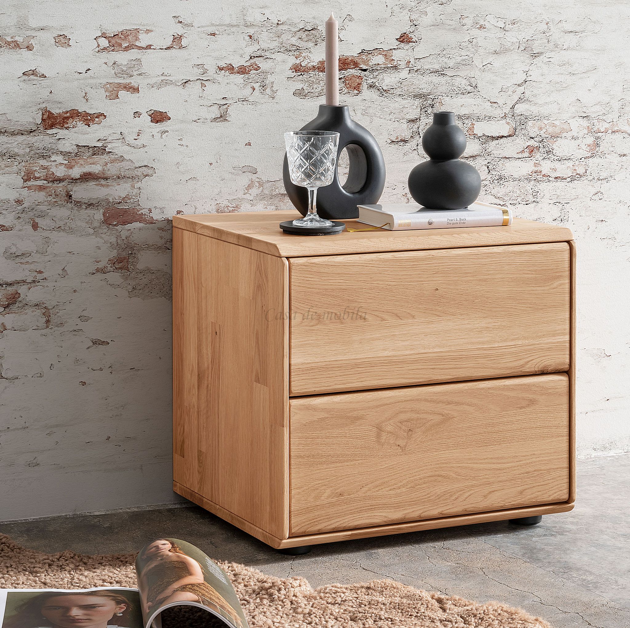 Die Nachtkommode hat zwei Schubladen.