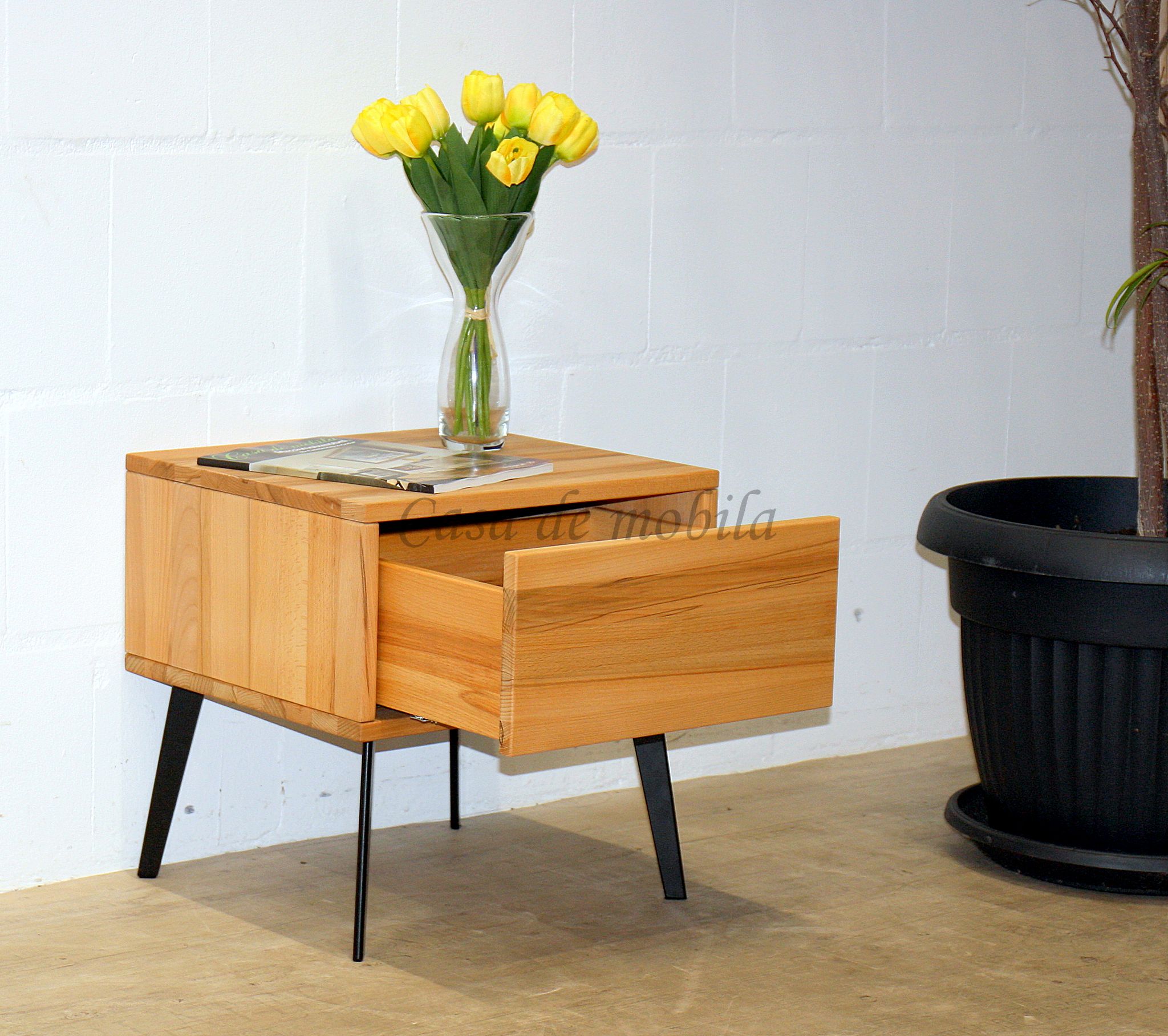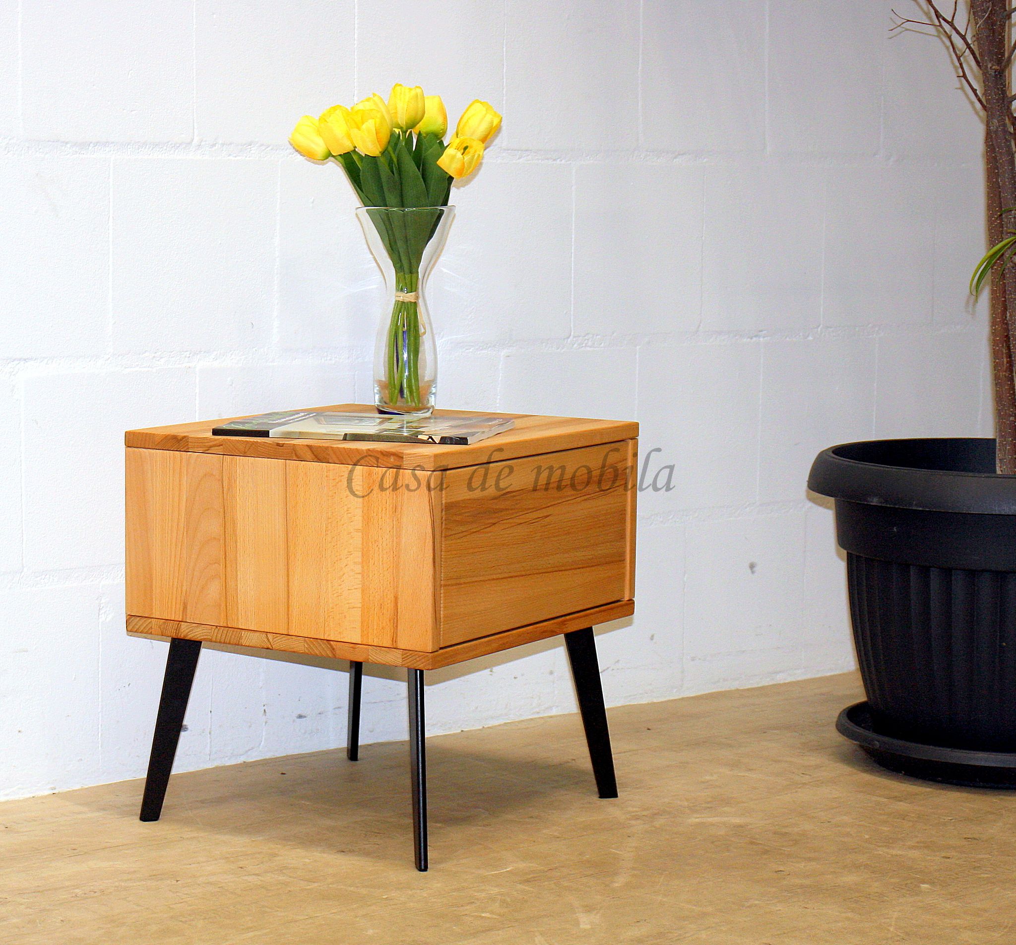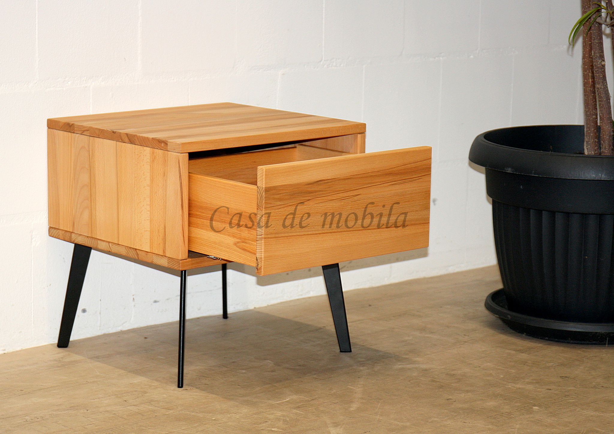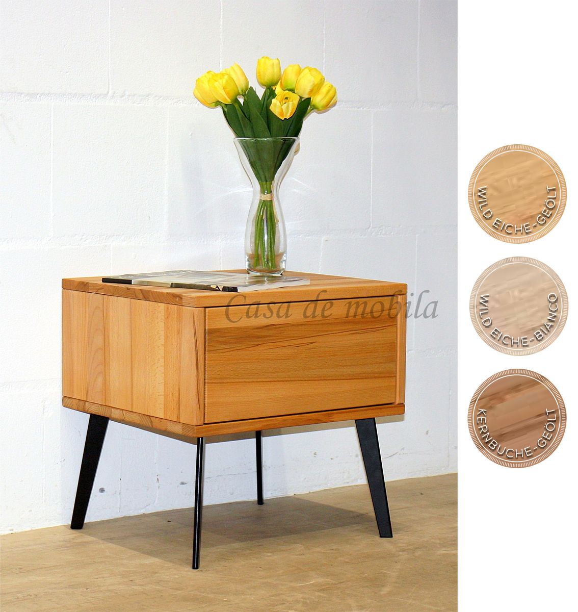 Gefertigt aus massiver Buche oder massiver Eiche, bringt die Nachtkommode die natürliche Maserung des Holzes besonders schön zur Geltung. Die Oberfläche ist wahlweise natur geölt oder bianco geölt erhältlich und optional sandgestrahlt – für eine noch intensivere Holzstruktur und eine edle Haptik.