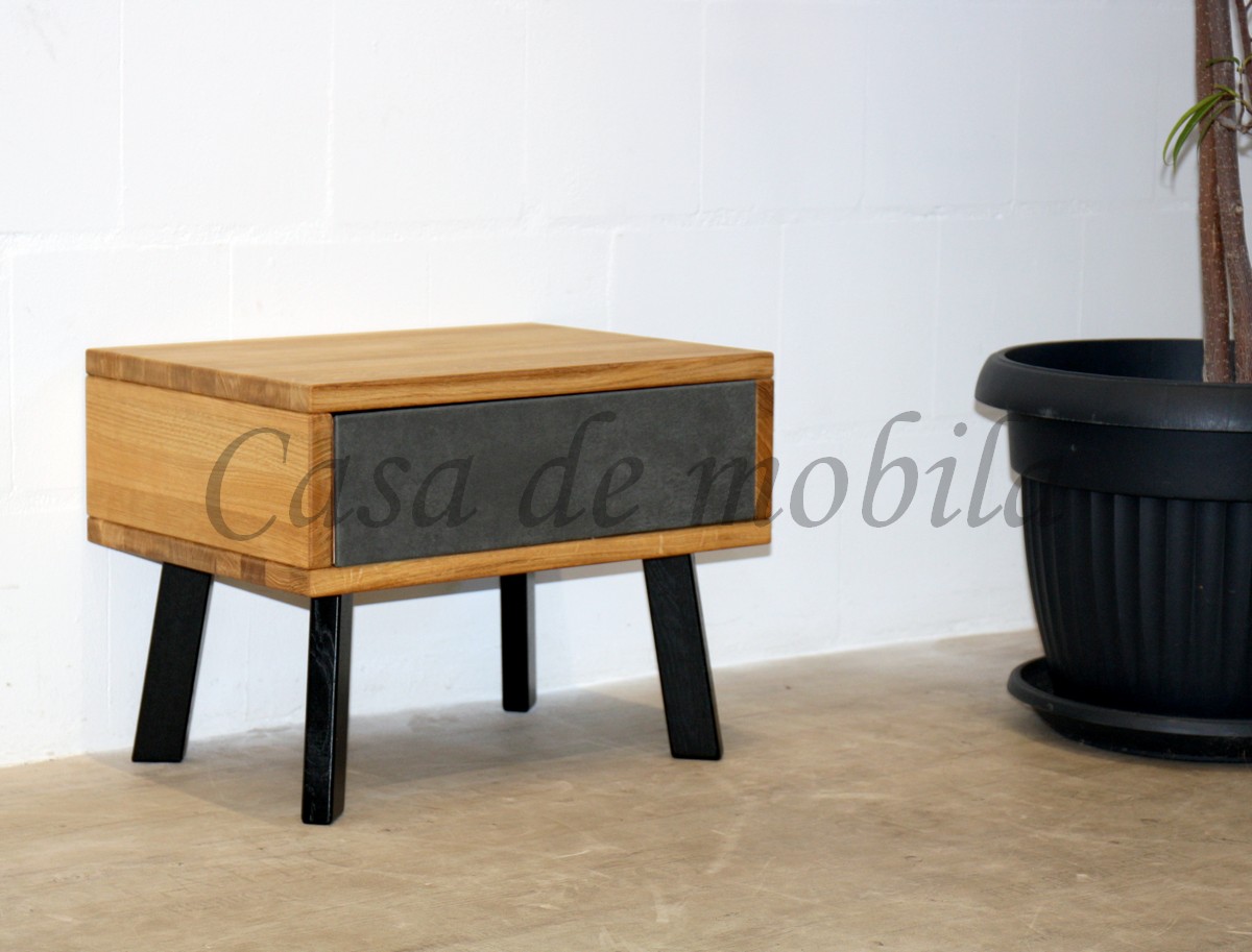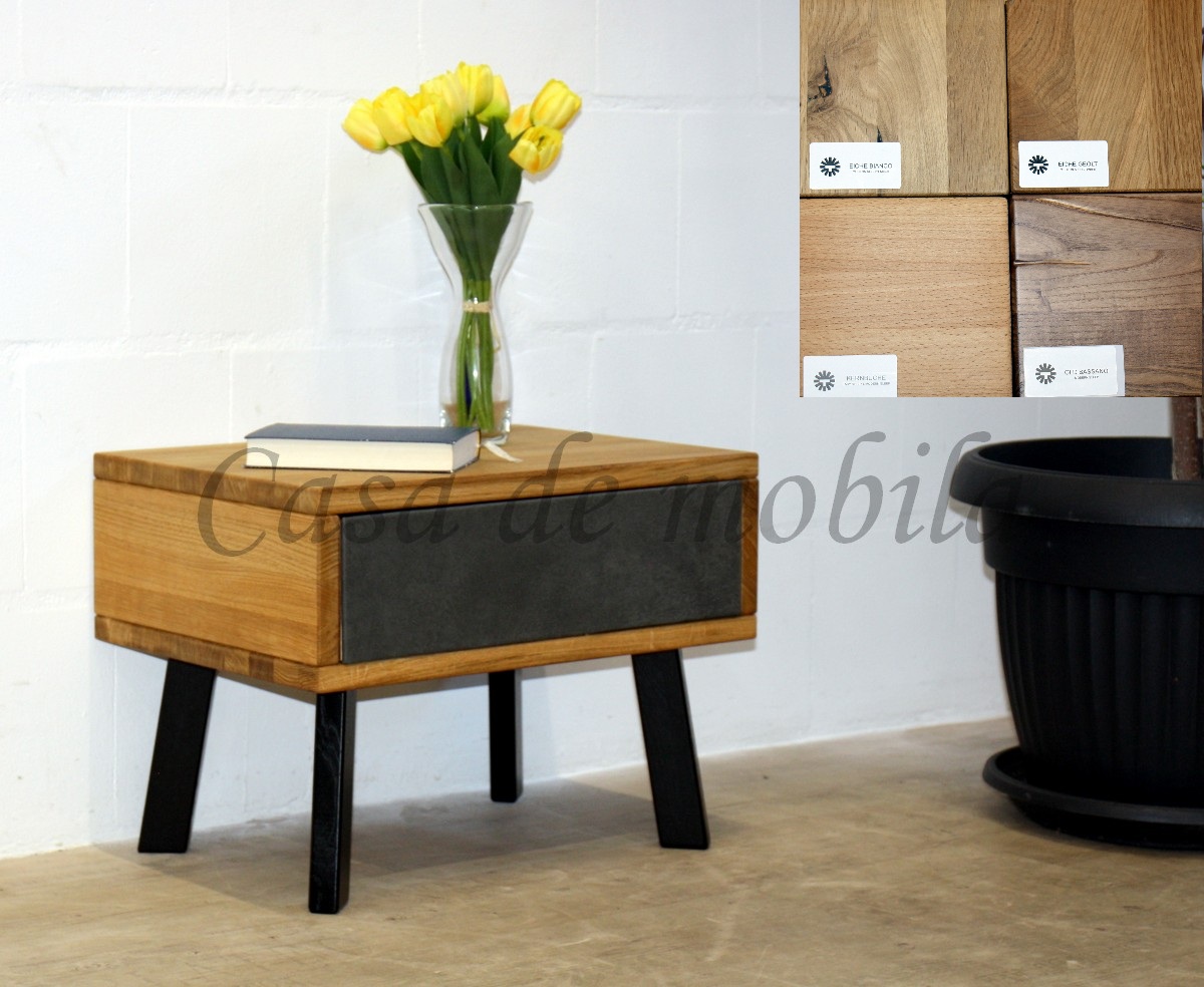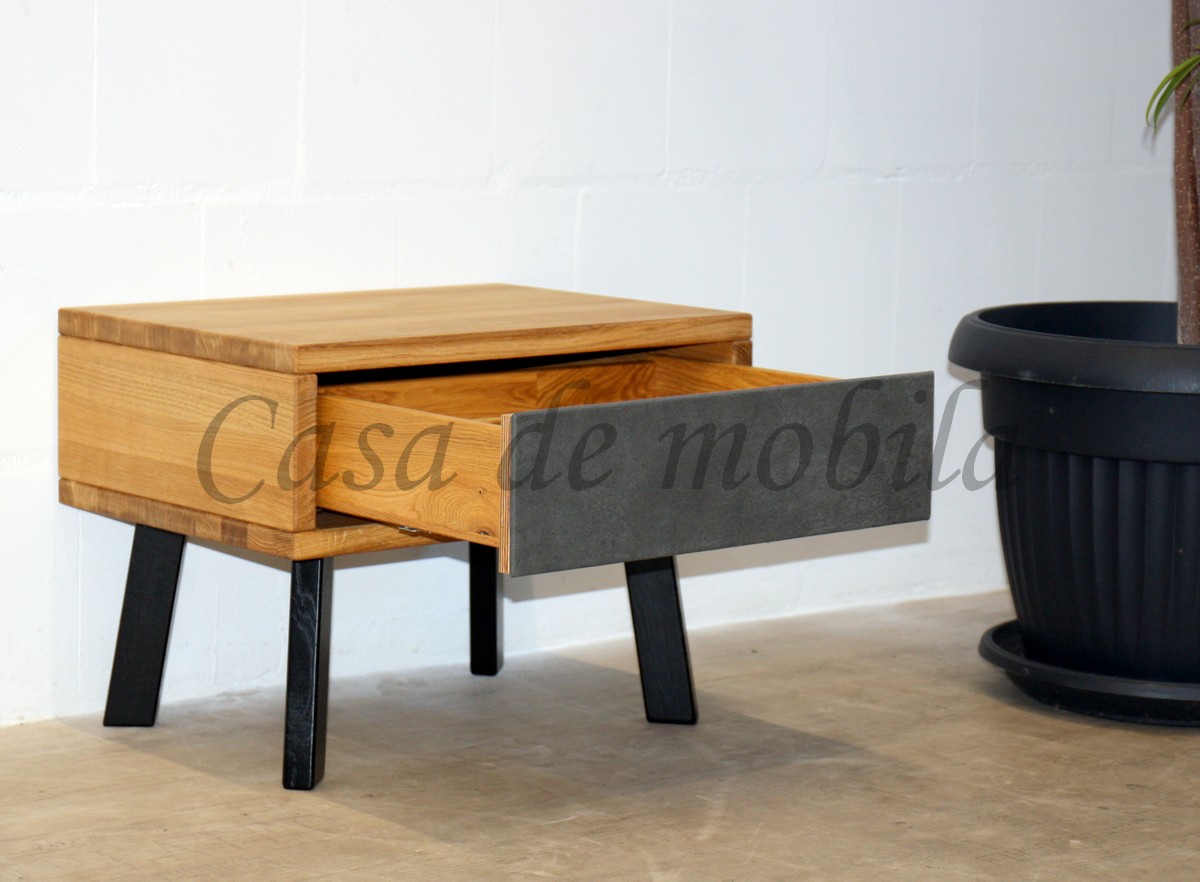 Dieser moderne Nachtschrank verbindet natürliches Massivholz mit markanten Details im Industrial-Stil. Der Korpus ist wahlweise in Wildeiche oder Kernbuche erhältlich und überzeugt durch seine warme, lebendige Maserung. Ein besonderer Blickfang ist die Schubladenfront mit hochwertigem Kenia Leder, die dem Möbelstück eine edle und außergewöhnliche Note verleiht.