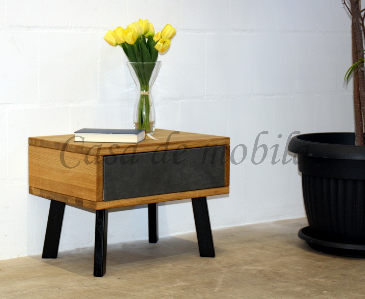 Die schräg gestellten, schwarzen Metallbeine sorgen für Stabilität und unterstreichen das moderne Design. Dank der praktischen Schublade haben Sie wichtige Dinge wie Buch, Smartphone oder Brille stets griffbereit und ordentlich verstaut.