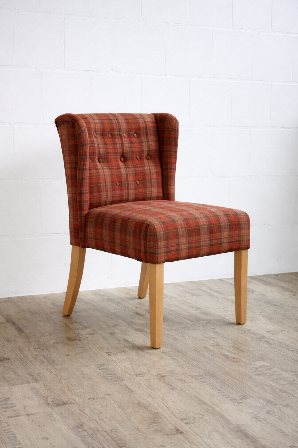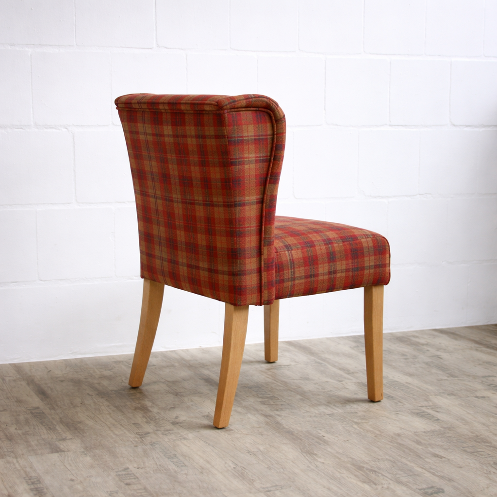 Die massiven Holzbeine sorgen für einen sicheren Stand und ergänzen das Design perfekt. Die Kombination aus Stoff und Holz verleiht dem Stuhl eine warme und moderne Ausstrahlung.