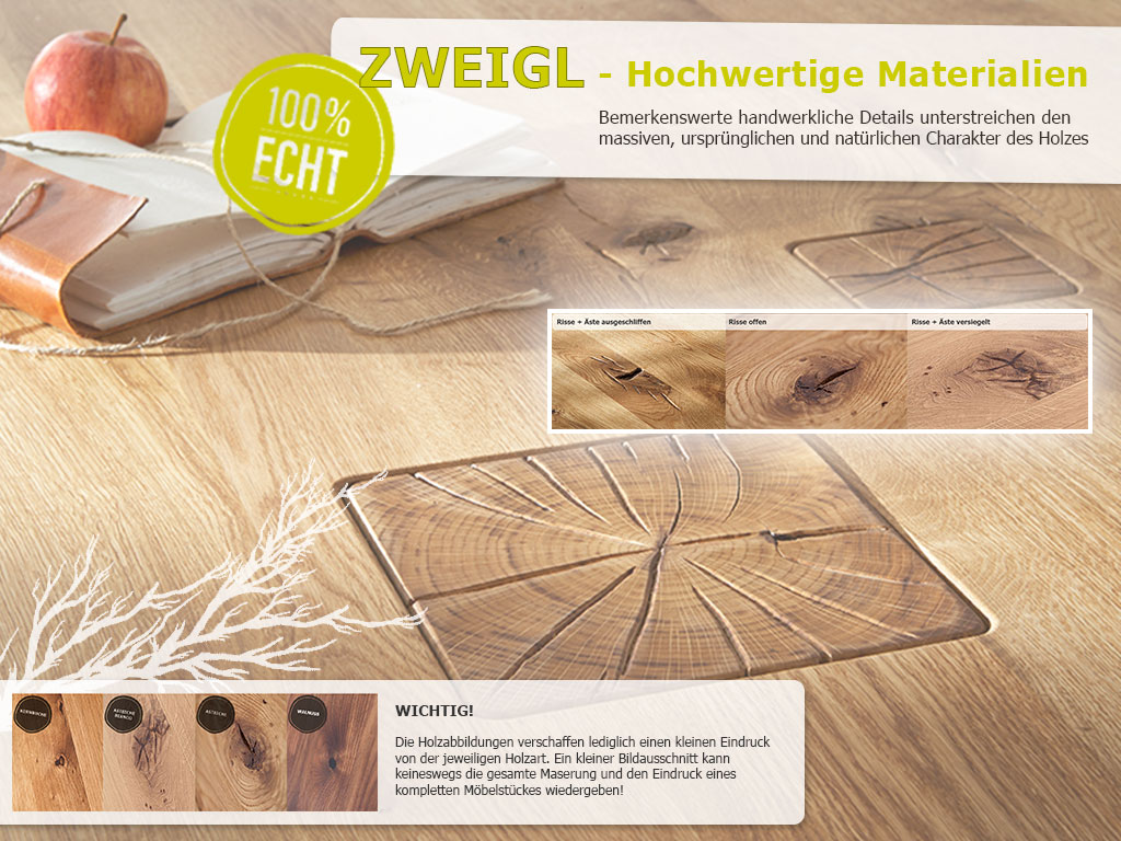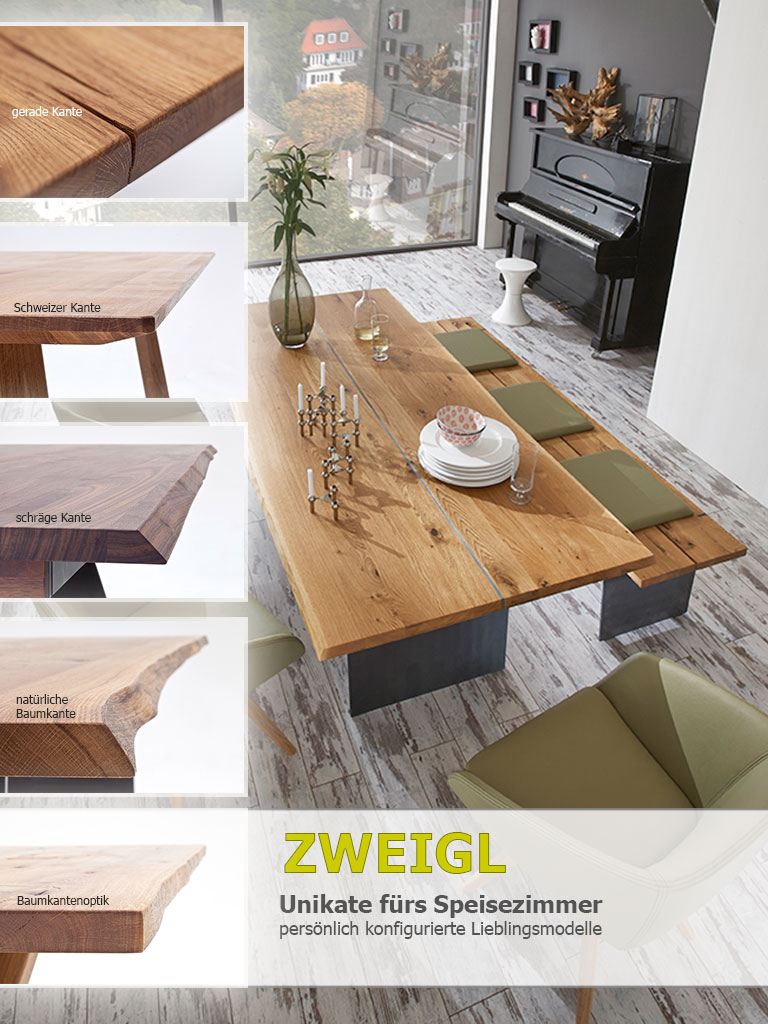 Setzen sie ein Statement mit ihren persönlich konfigurierten Lieblingsmodellen aus der Wimmer Kollektion ZWEIGL (hochdeutsch: Ästchen). Diese einzigartige Speisezimmerkollektion hat wie jeder Baum auch unterschiedliche Zweige (vielfältige Kombinationsmöglichkeiten) und ist genau wie jeder einzelne von uns einzigartig in seiner Erscheinung. Zu den charakteristischen Merkmalen im ZWEIGL-Programm gehören neben offenen Rissen in der Tischplatte auch natürliche Baumkanten als Tischkante und ausgeschliffene Äste.