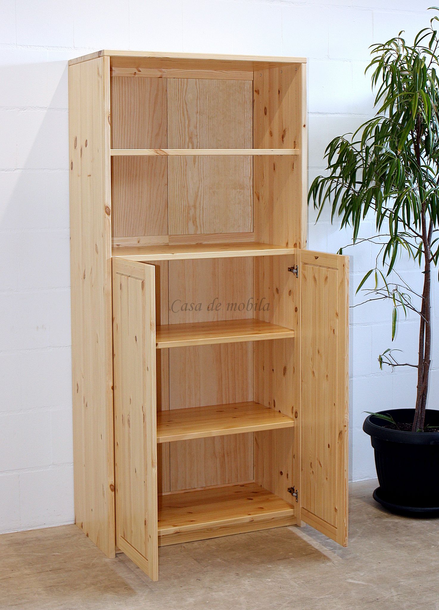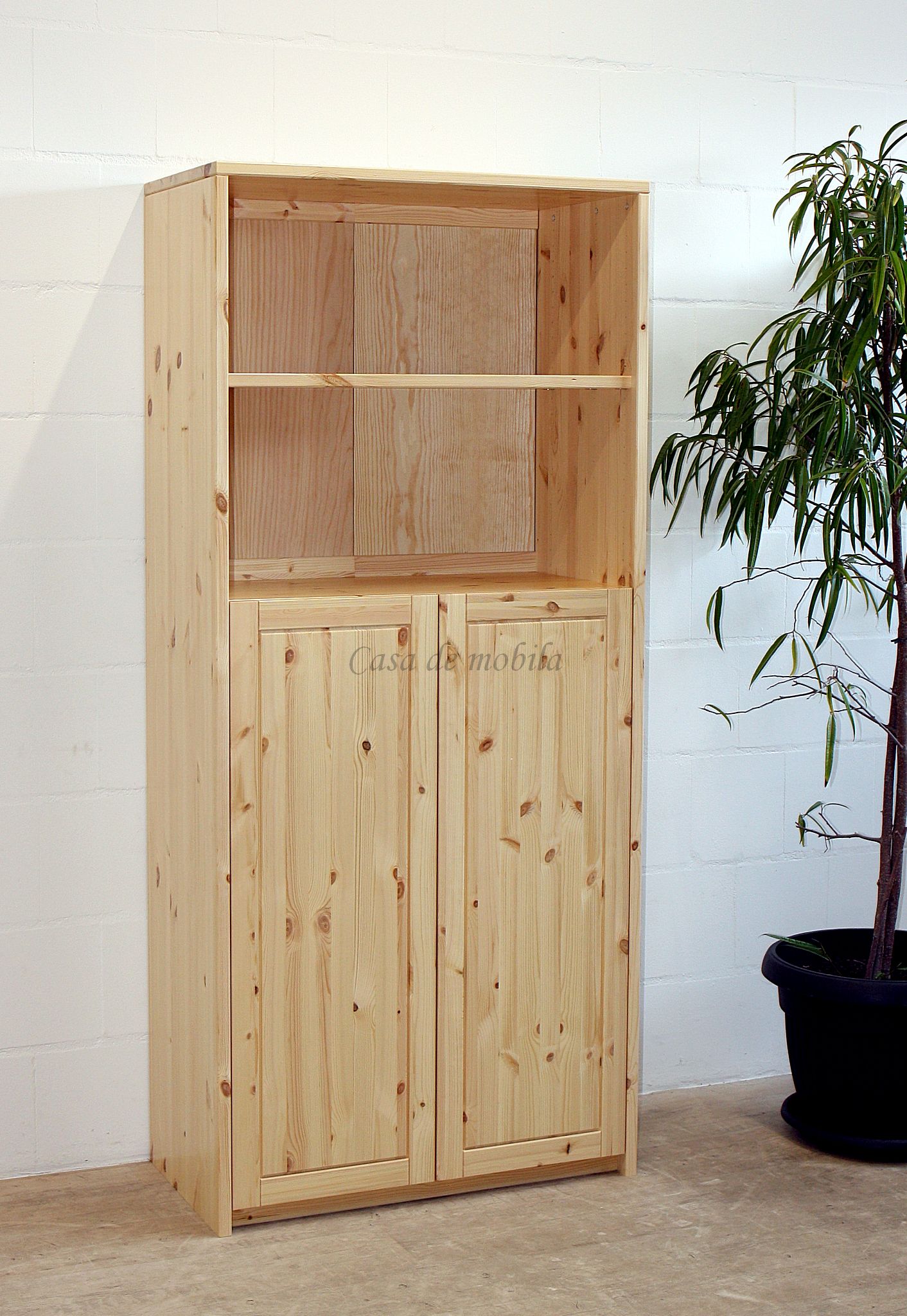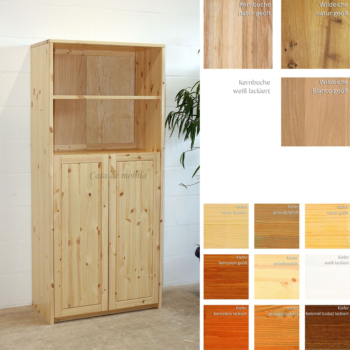 Massivholz Regal-Schrank mit Türen und offenen Fächern CONTRA ist aus Kiefernholz, Buchenholz oder Eichenholz lieferbar. Es stehen verschiedene Oberflächenbehandlungen wie geölt, lackiert oder weiß zur Auswahl. Das Möbelstück wird in Dänemark aus Massivholz gefertigt.