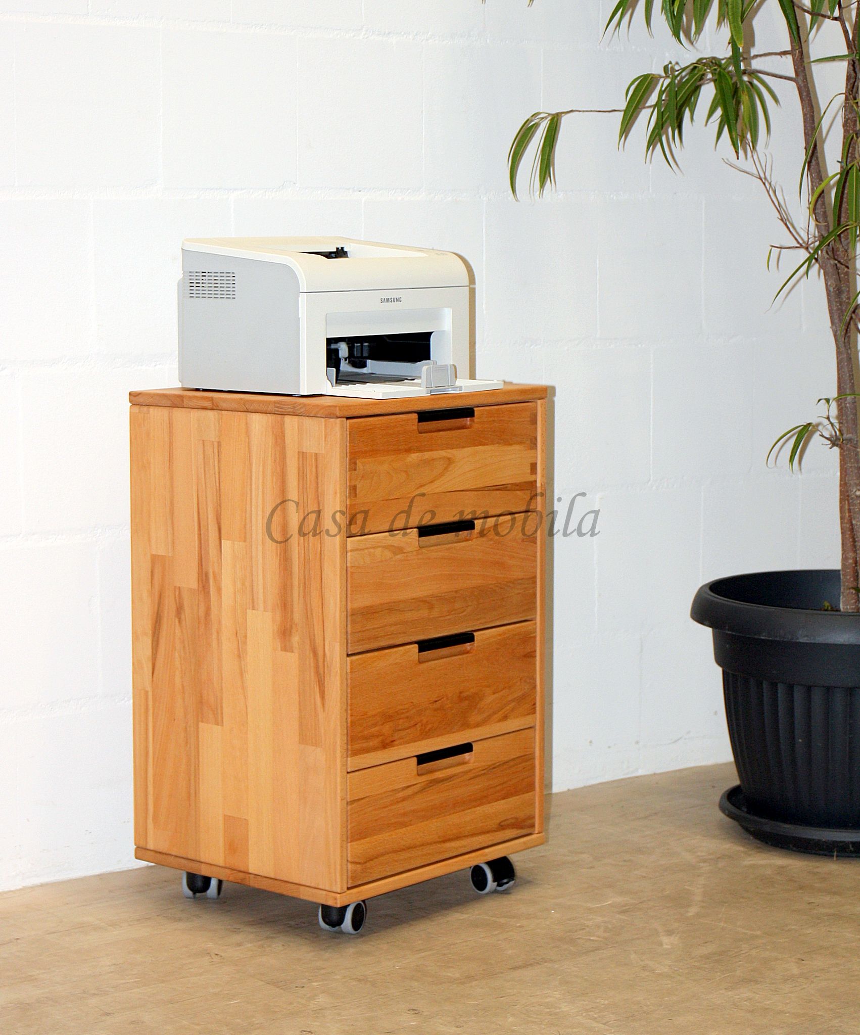 Die Oberfläche dieses Rollcontainers ist aus massiver Buche oder Eiche gefertigt und hat eine geölte Oberfläche.