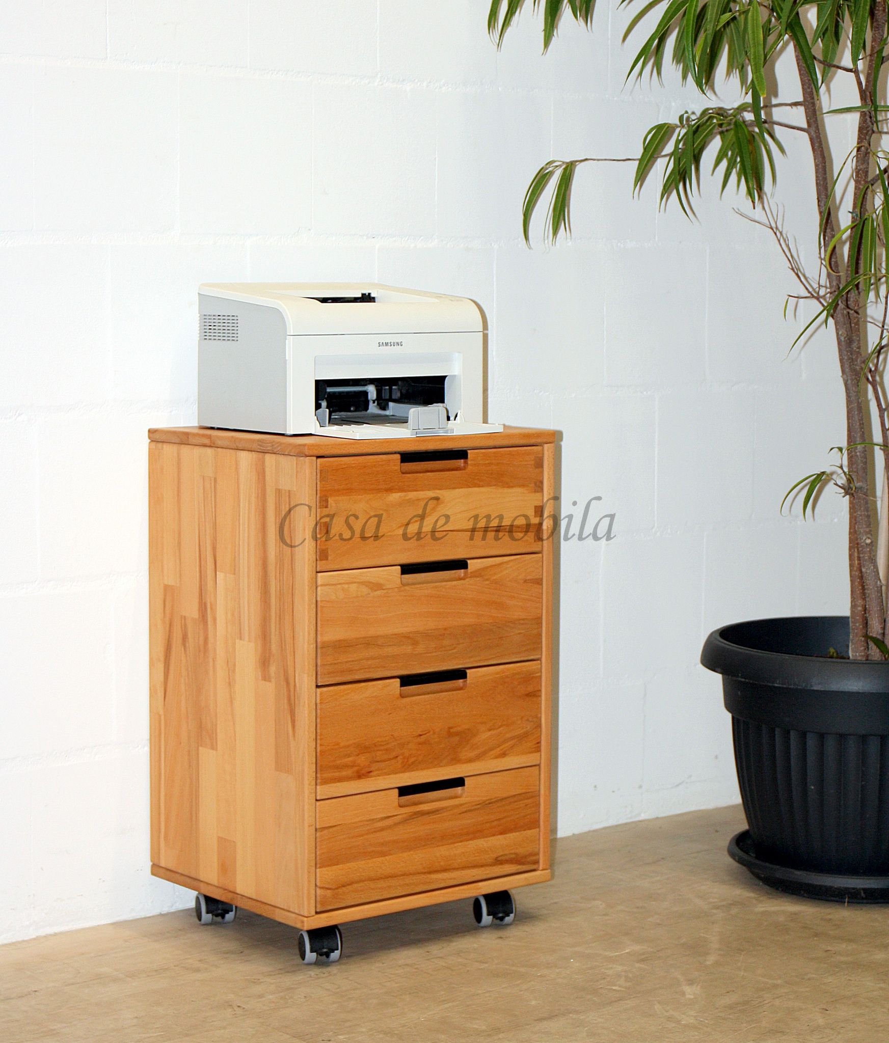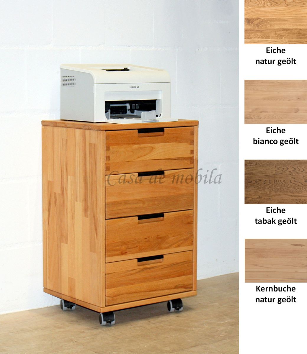 Die Oberfläche dieses Rollcontainers ist aus massiver Buche oder Eiche gefertigt und hat eine geölte Oberfläche.