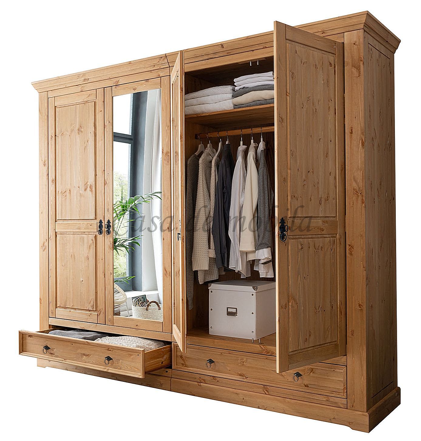 Ein edel und hochwertig verarbeitetes Schlafzimmer, gefertigt aus Kiefernholz. Diese Kombination besticht durch ihre hohe Vielseitigkeit und Eleganz - Hinzu kommen zwei Nachtschränke, ein Bett mit Bettkasten, ohne Lattenrost, sowie ein Kleiderschrank, 4-türig, eine Wäschekommode & einer Sitzbank - für einen edlen Vollholz-Look. Massive Kiefer zieren diese Massivholz-Möbelstücke. Hergestellt aus bestandsgepflegten Forsten, bietet diese Kombination das Maximale an Wohnkomfort und überzeugt in ihrer herausragenden Qualität. In diesen schicken Möbelstücken steckt viel Handarbeit und Liebe zum Detail. Dieses lebendige Naturprodukt zeichnet sich durch seine unverwechselbaren Echtheitsmerkmale aus - Maserungen, Verwachsungen, Unregelmäßigkeiten sowie Spannungen sind typische Eigenschaften und Sie dürfen sich somit auf ein echtes Unikat freuen.