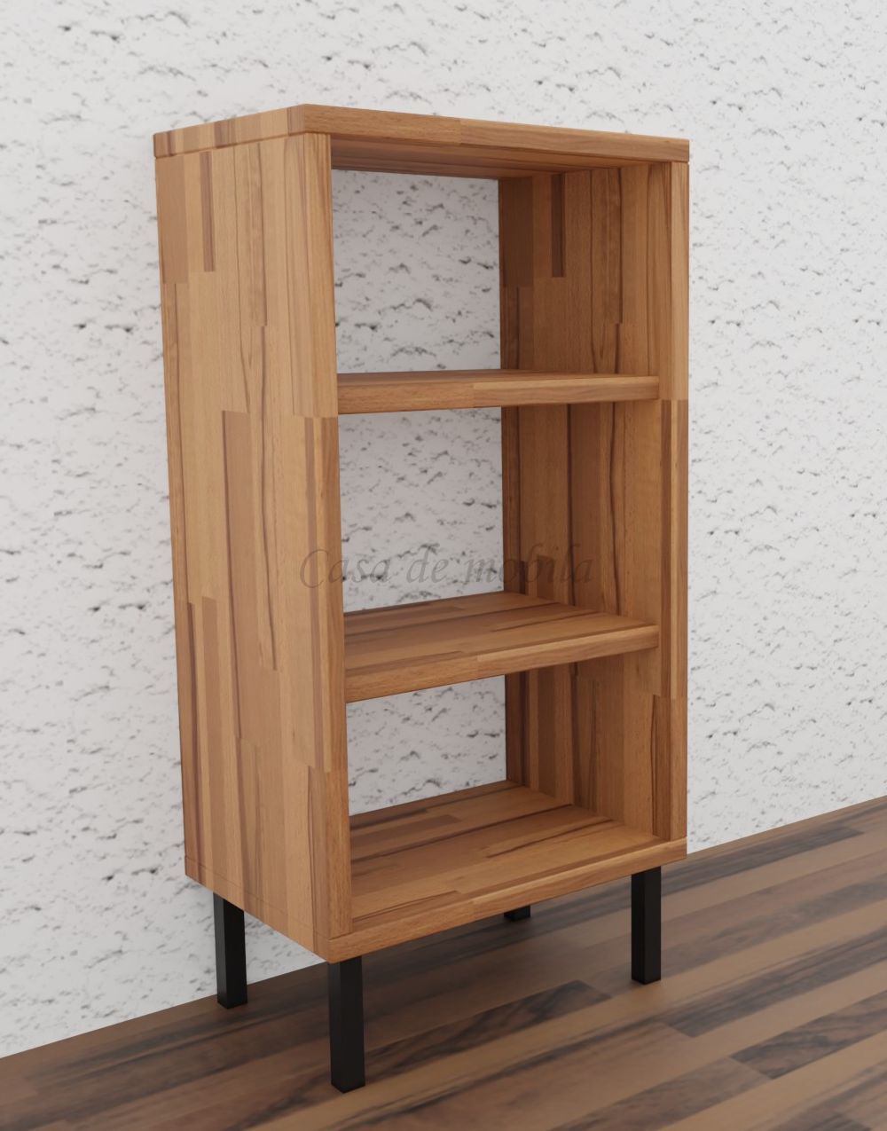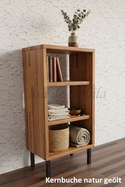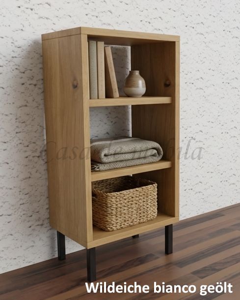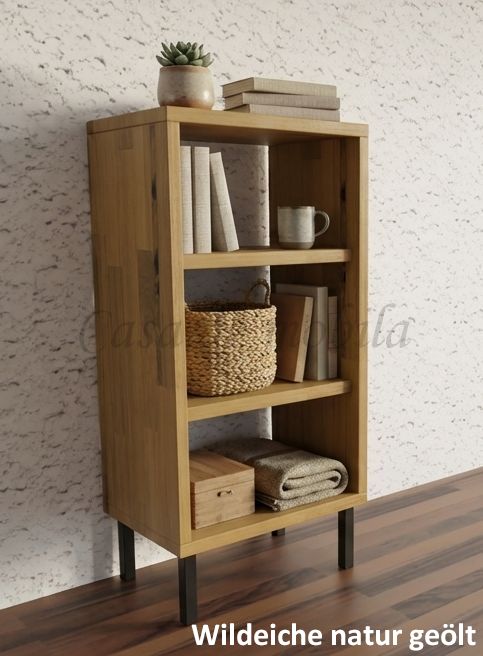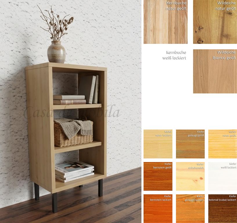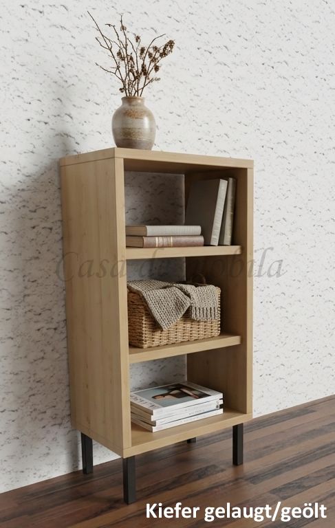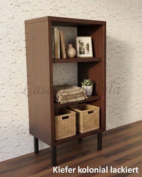 Dieses kleine Regal CONTRA ist aus Kiefernholz, Buchenholz oder Eichenholz lieferbar. Es stehen verschiedene Oberflächenbehandlungen wie geölt, lackiert oder weiß zur Auswahl. Das Möbelstück wird in Dänemark aus Massivholz gefertigt.