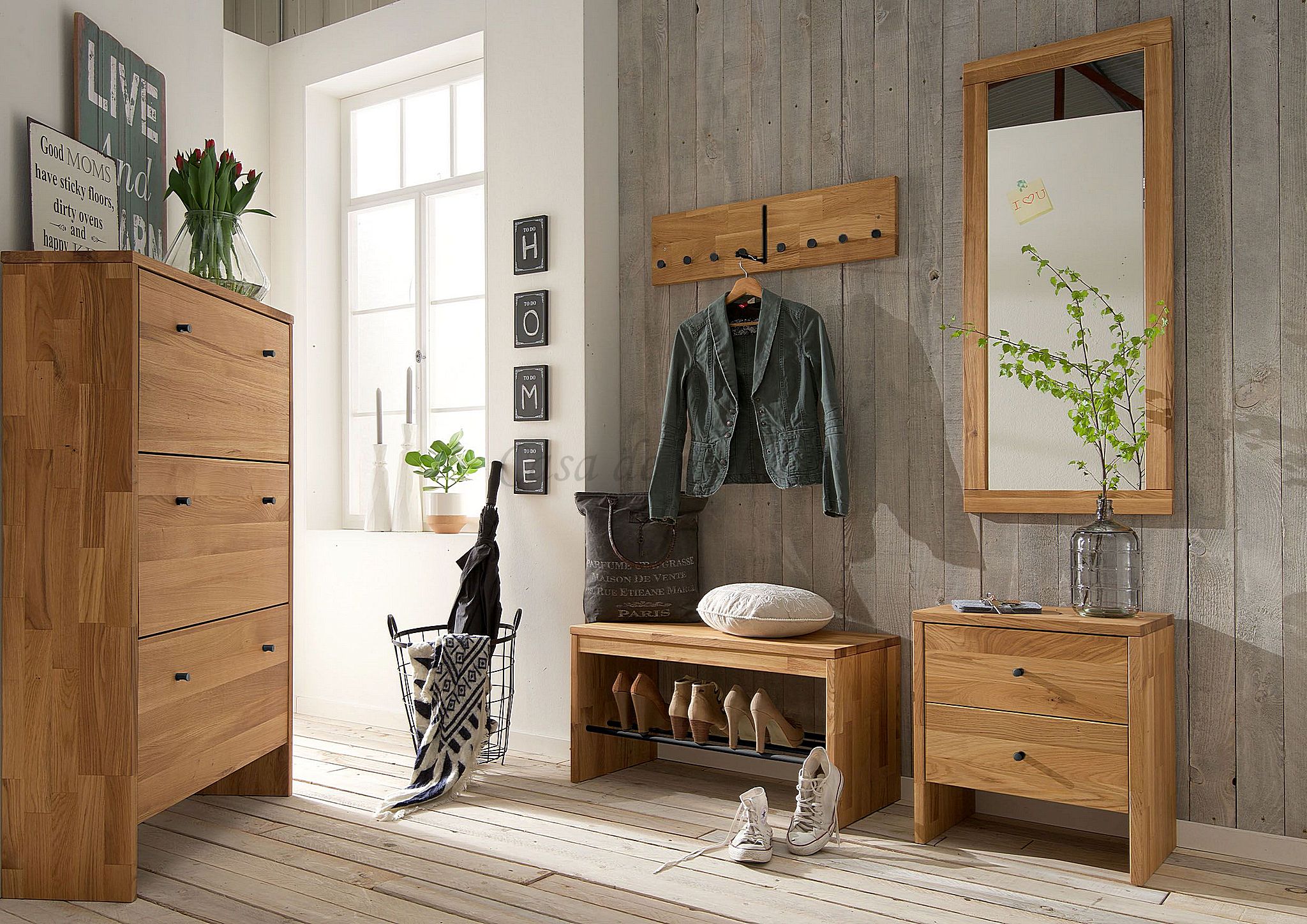 Massivholz Dielenbank mit Schuhablage Wildeiche natur geölt