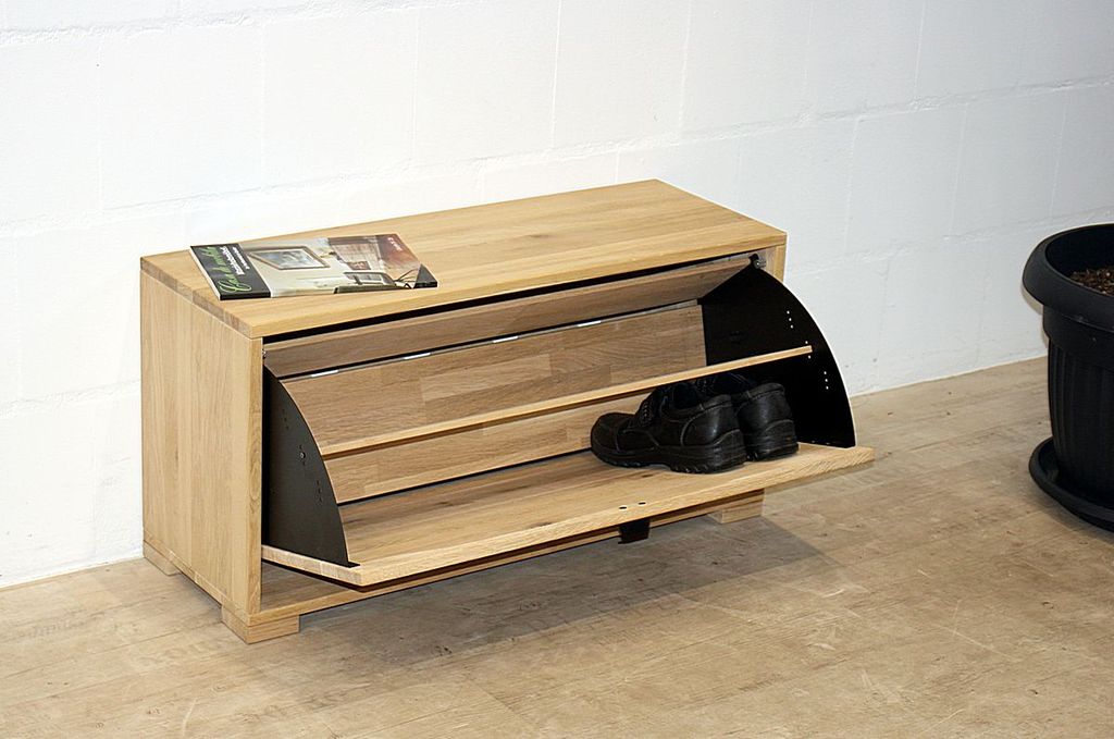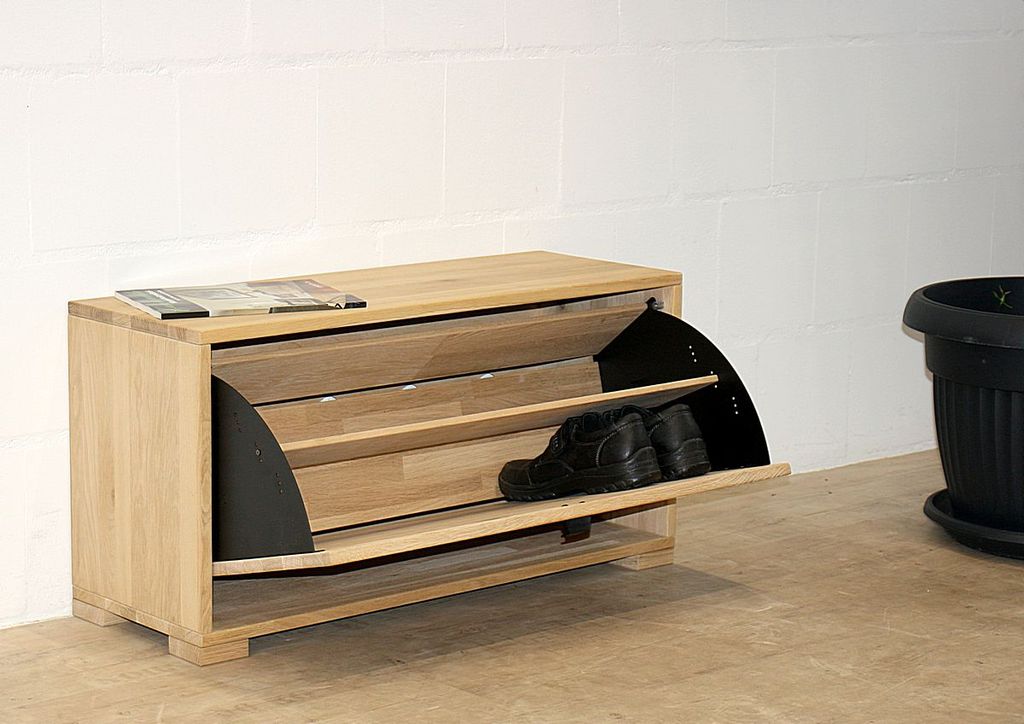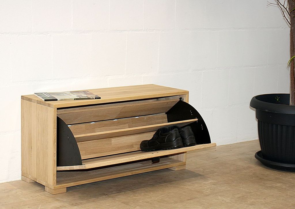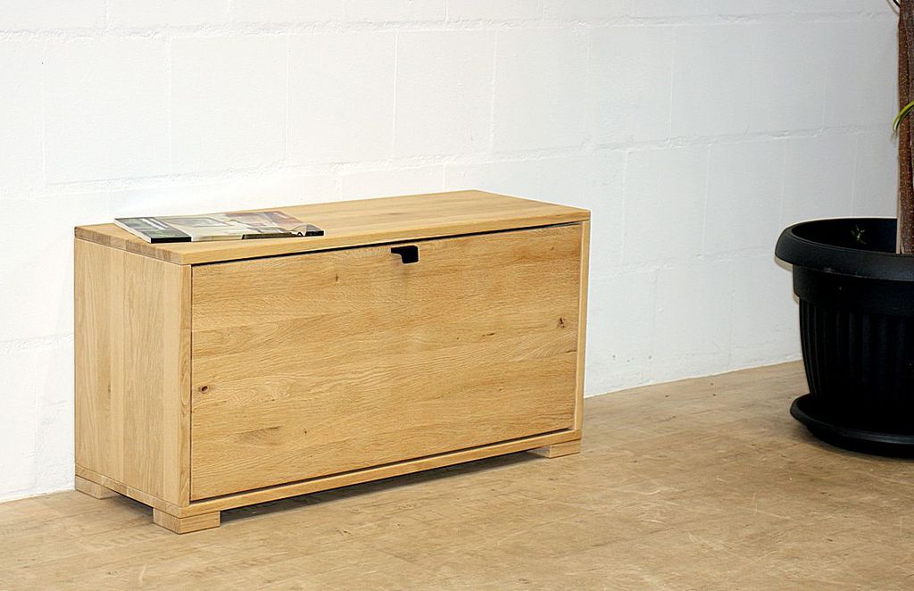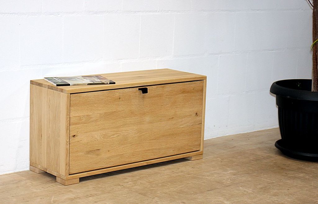 Dieser Schuhschrank aus dem Dielenprogramm WALK IN vom dänischen Hersteller Tjørnbo ist aus massivem Eichenholz gefertigt, bianco geölt und sandgestrahlt. Die 4 Holzfüße sind 2,6 cm hoch.