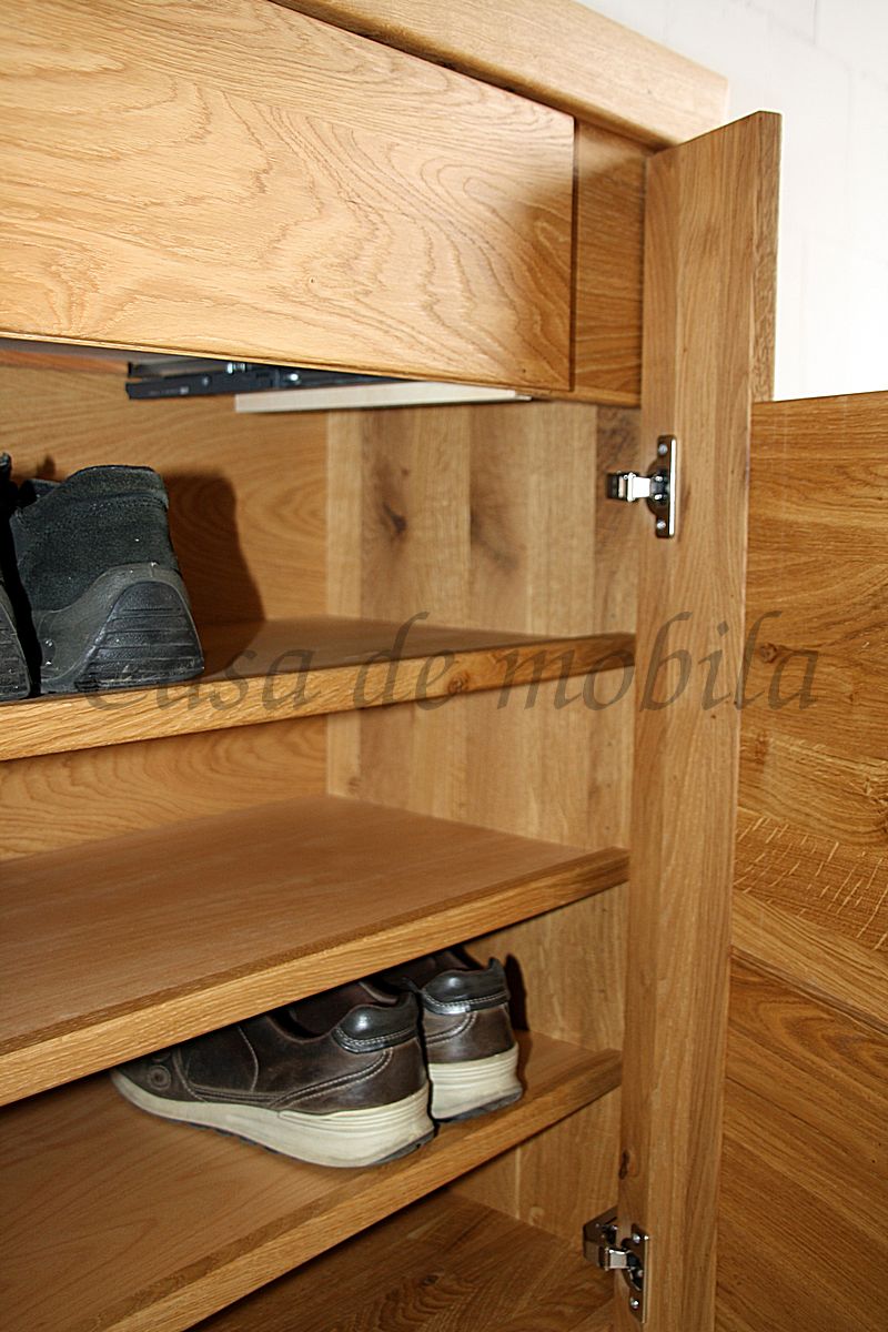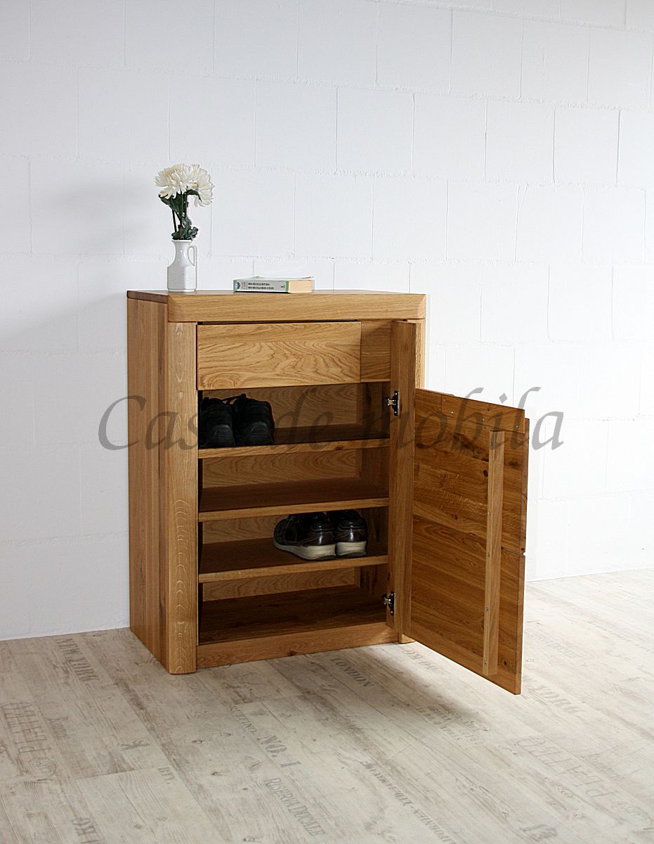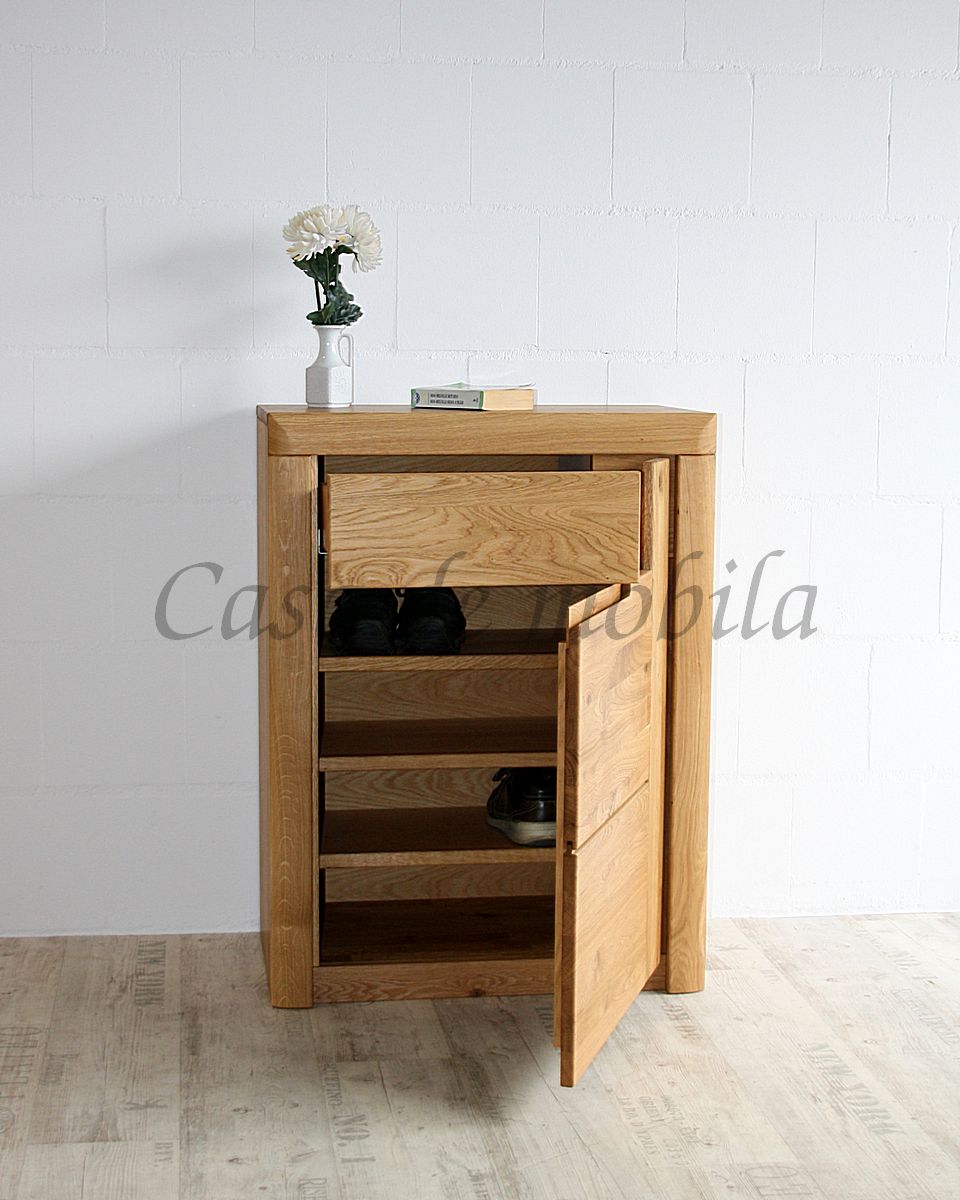 Die Schuhkommode HORIZONT bietet hinter seiner Tür 4 Fächer für jeweils ca. 2 Paar Schuhe. Der Türanschlag befindet sich rechts. Weiteren Platz bietet die darüberliegenden Schublade.