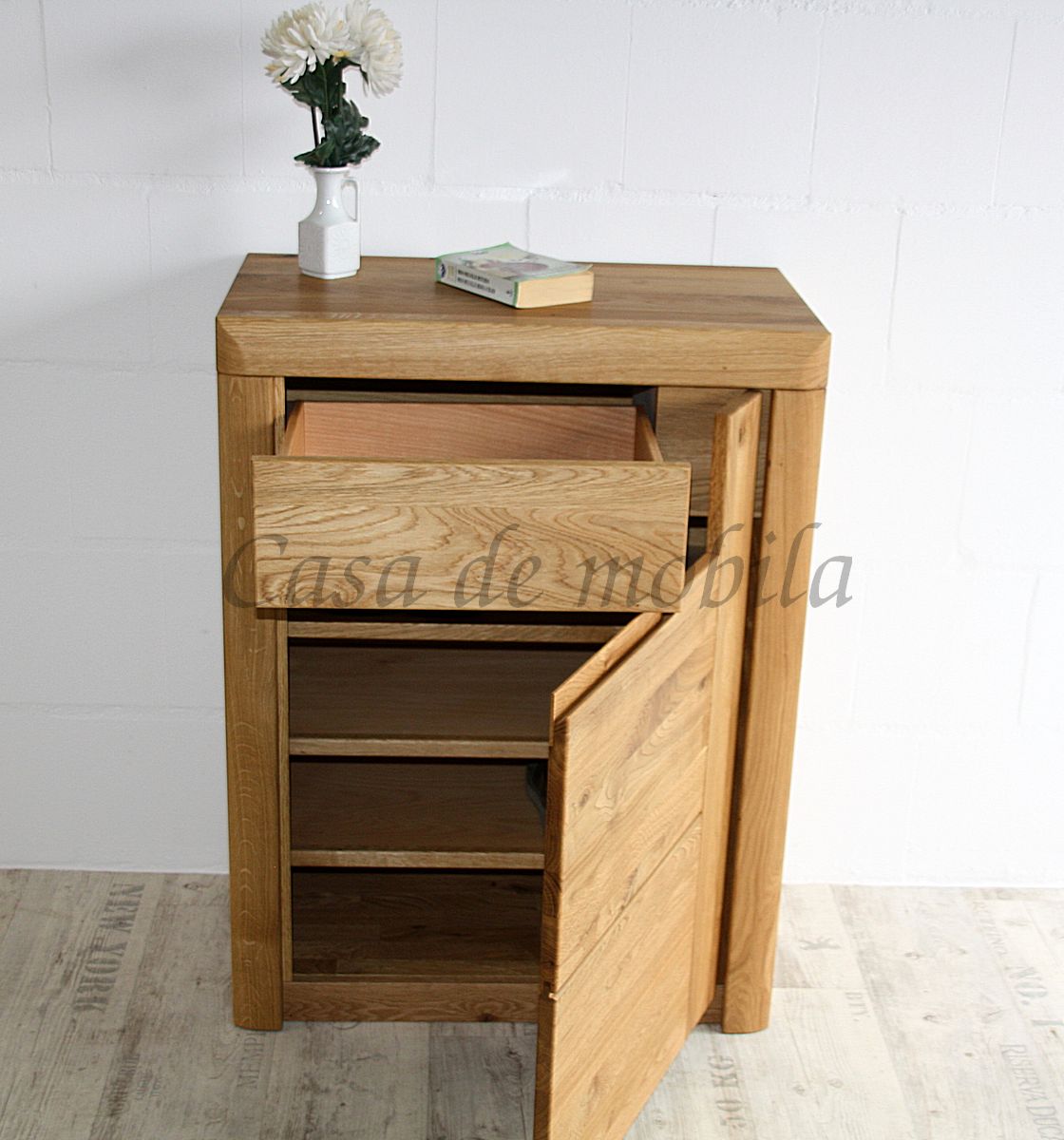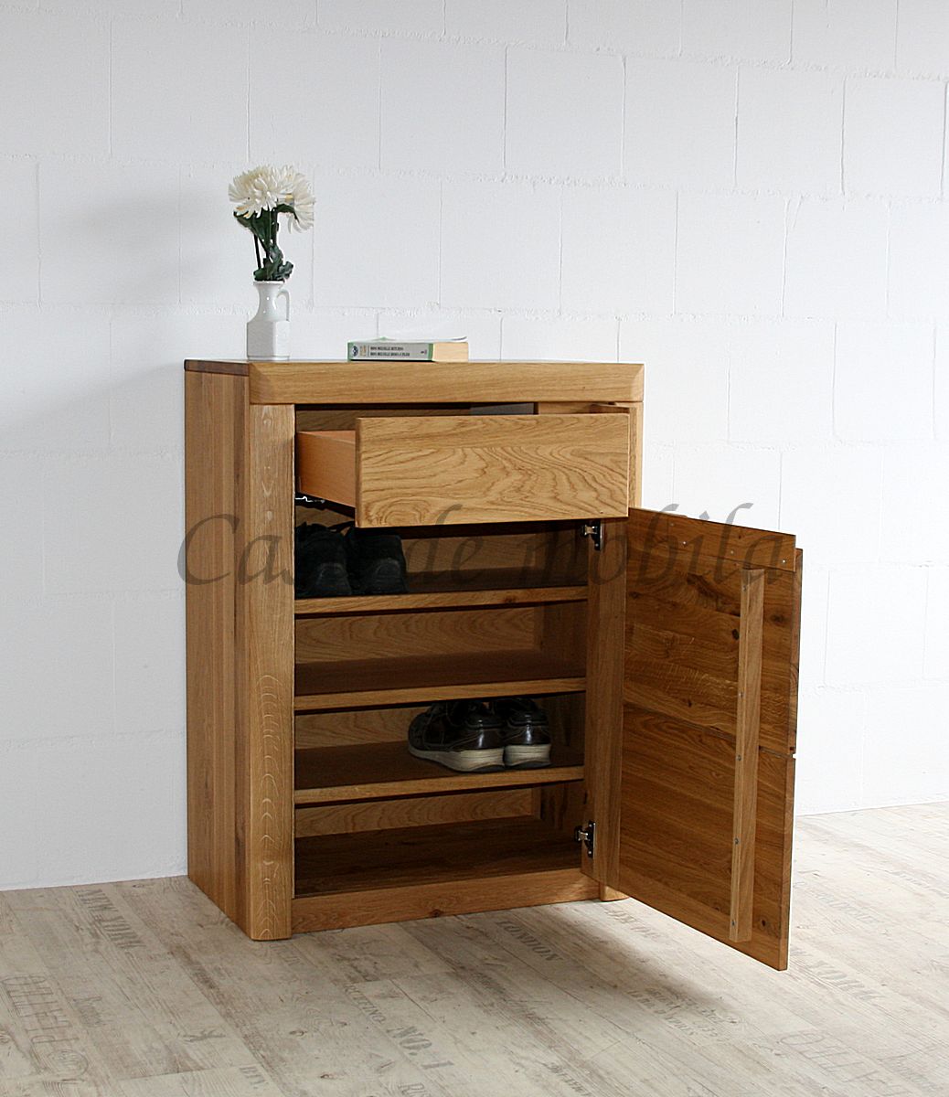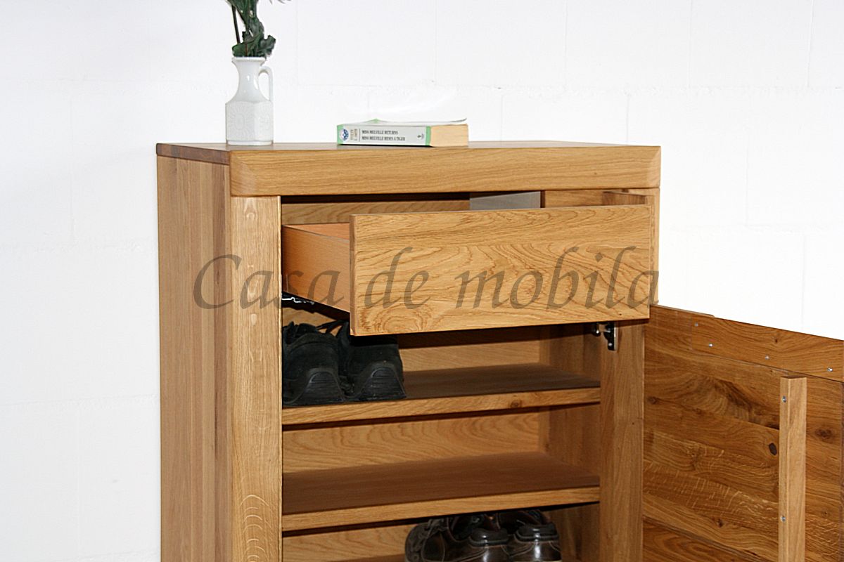 Die Schuhkommode HORIZONT bietet hinter seiner Tür 4 Fächer für jeweils ca. 2 Paar Schuhe. Der Türanschlag befindet sich rechts. Weiteren Platz bietet die darüberliegenden Schublade.