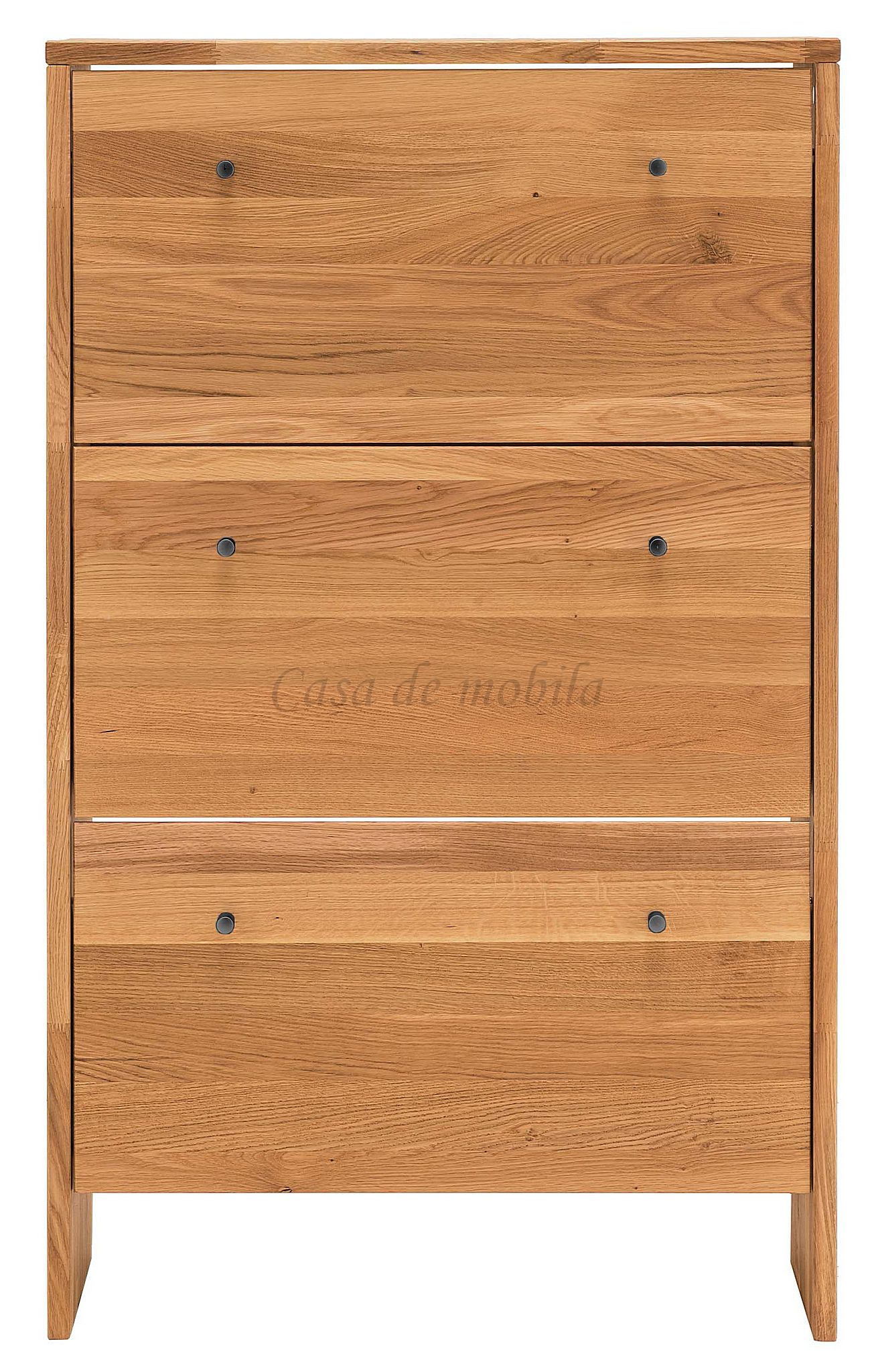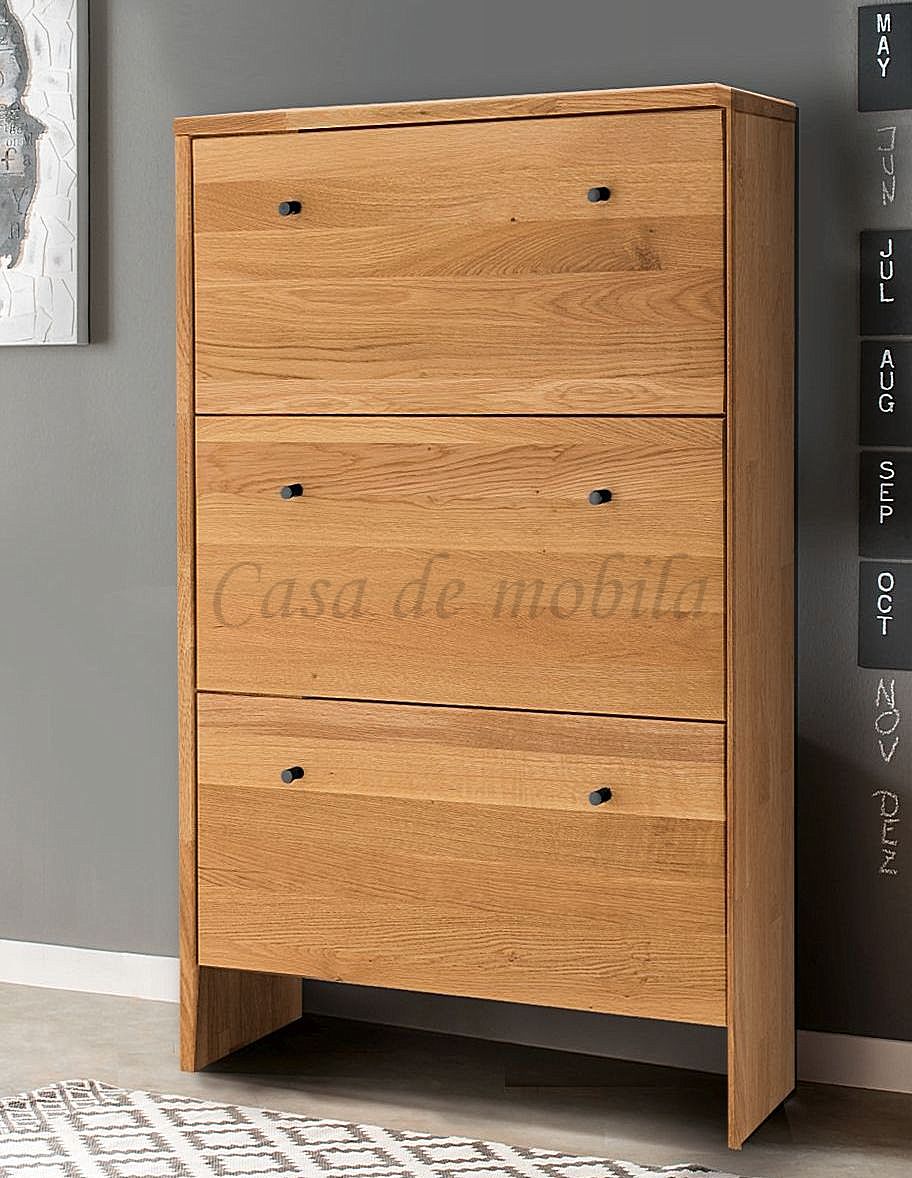 Diese Schuhkommode ist aus massiver Wildeiche gefertigt, einem Holz mit einer natürlichen Maserung und einer hellen Farbe. Die Kommode hat zwei Klappen, die jeweils durch einen weiteren Holzeinsatz unterteilt sind. Der Schrank bietet ausreichend Platz für ca. 18-24 Paar Schuhe. Die Maße betragen 133 cm Höhe, 27 cm Tiefe und 82 cm Breite. Der Schrank ist eine perfekte Ergänzung für jeden Flur oder Eingangsbereich und bietet eine praktische Möglichkeit, Schuhe aufzubewahren.