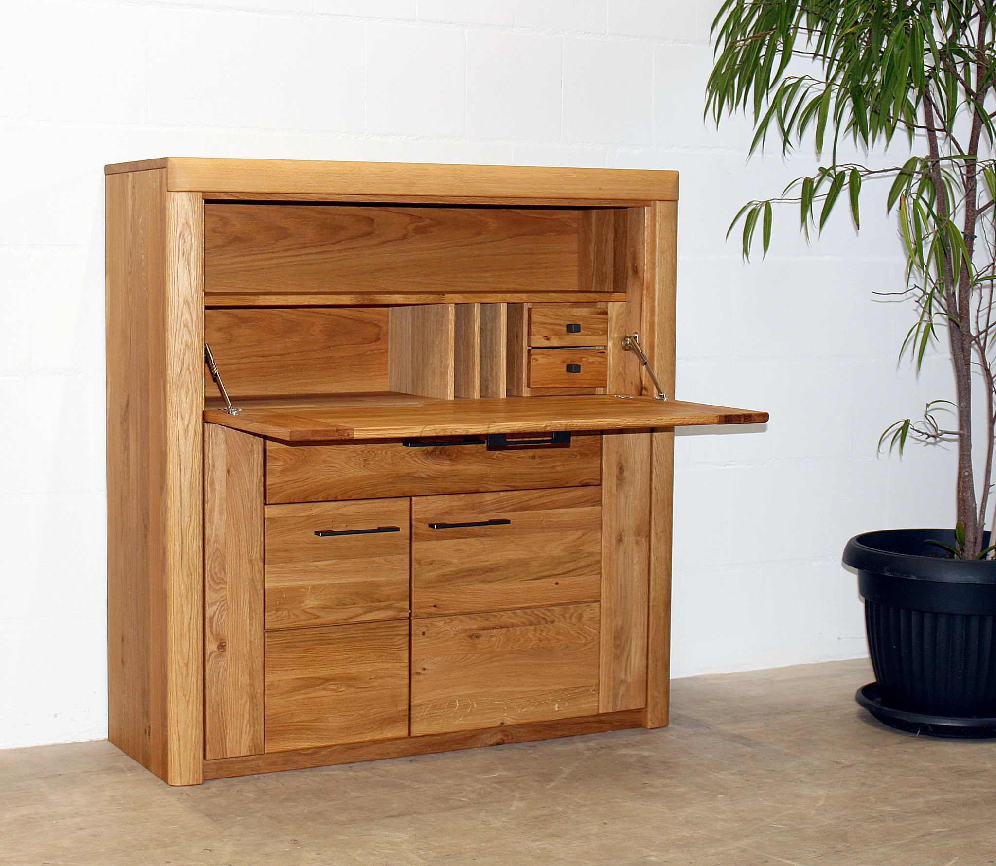 SKYLINE Möbel werden aus massiver Wildeiche hergestellt. Die Front ist aus rustikaler Ureiche gefertigt und besticht durch klare Linienführung und modernes Design mit hochwertigen Metallgriffen. Schubladenauzüge mit Selbsteinzug und Schaniere mit Soft-Close sind Qualitätsmerkmale dieses Möbelprogramms.