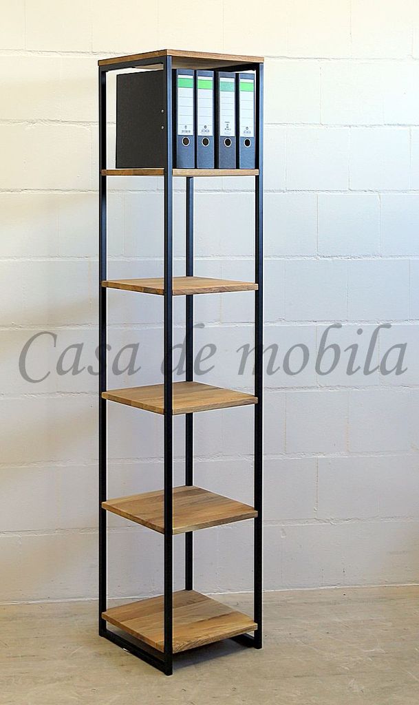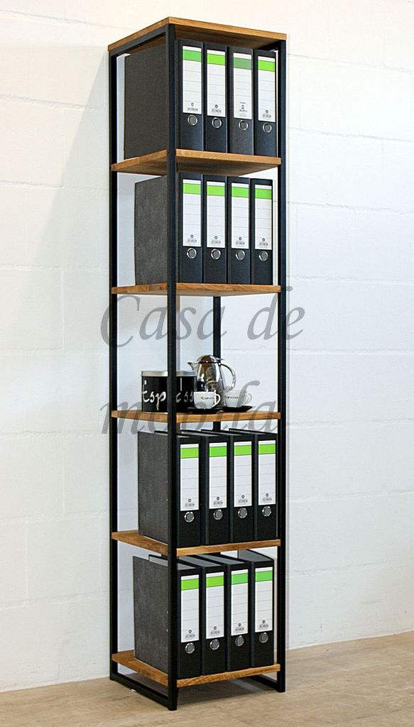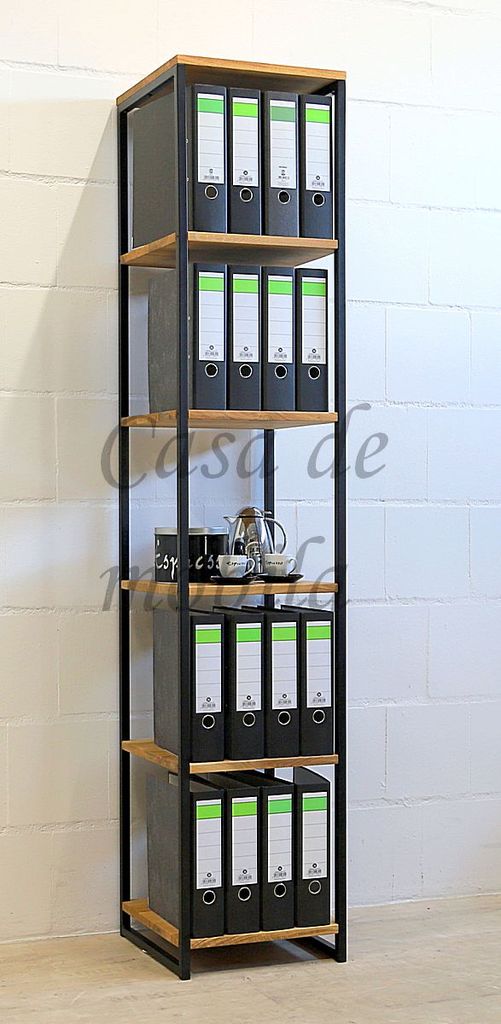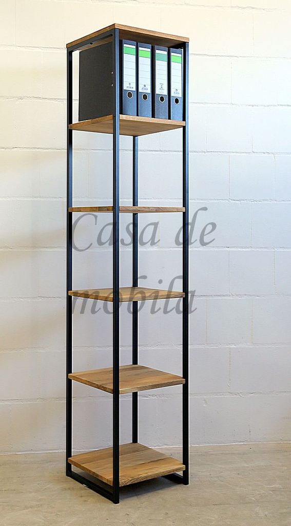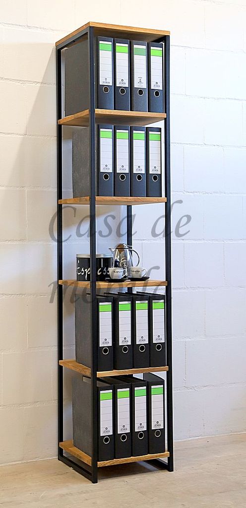 Dieses elegante Bücherregal LISSABON hat ein schwarzes Metallgestell und natur geölte Ablageböden aus massiver Wildeiche. Die harmonische Kombination aus robustem Holz und modernem Metall verleiht Ihrem Wohnzimmer oder Diele und Flur einen stilvollen und zeitlosen Look.