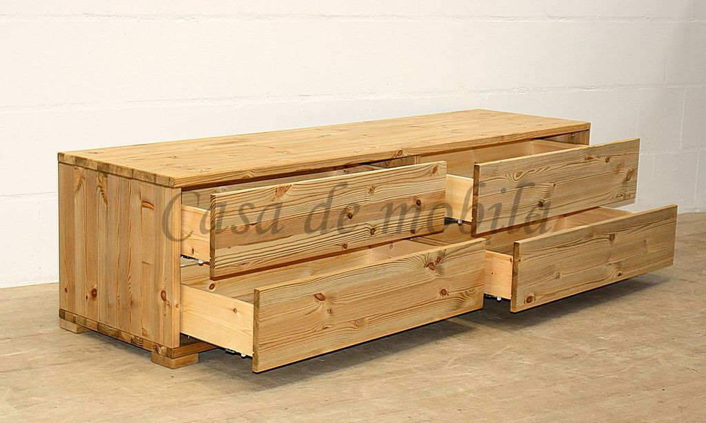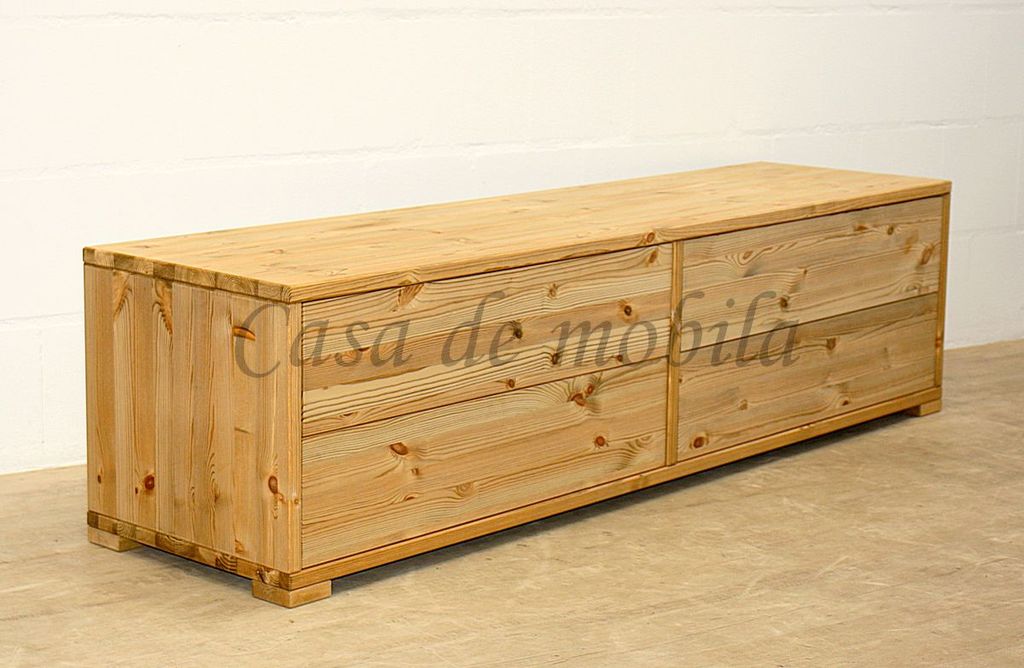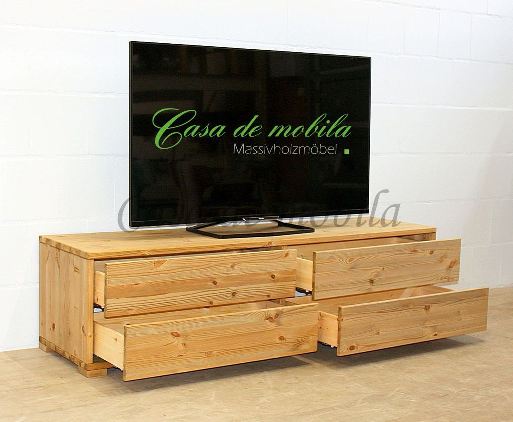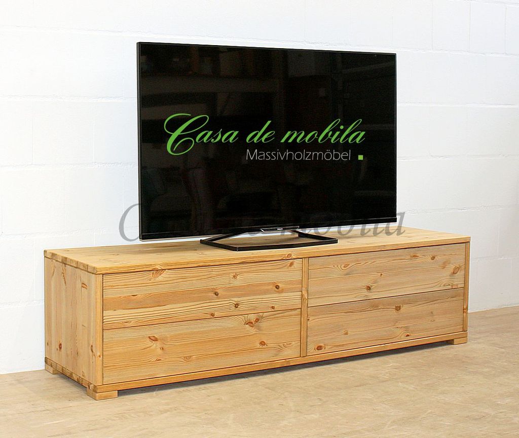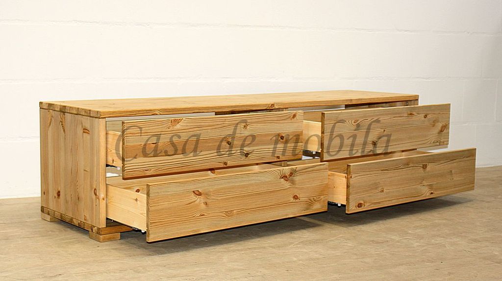 Das TV-Lowboard CONTRA mit 4 Schubladen in 33 cm Tiefe ist aus Kiefernholz lieferbar. Es stehen verschiedene Oberflächenbehandlungen wie geölt, lackiert, kolonial oder weiß zur Auswahl. Das Möbelstück wird in Dänemark aus Massivholz gefertigt.