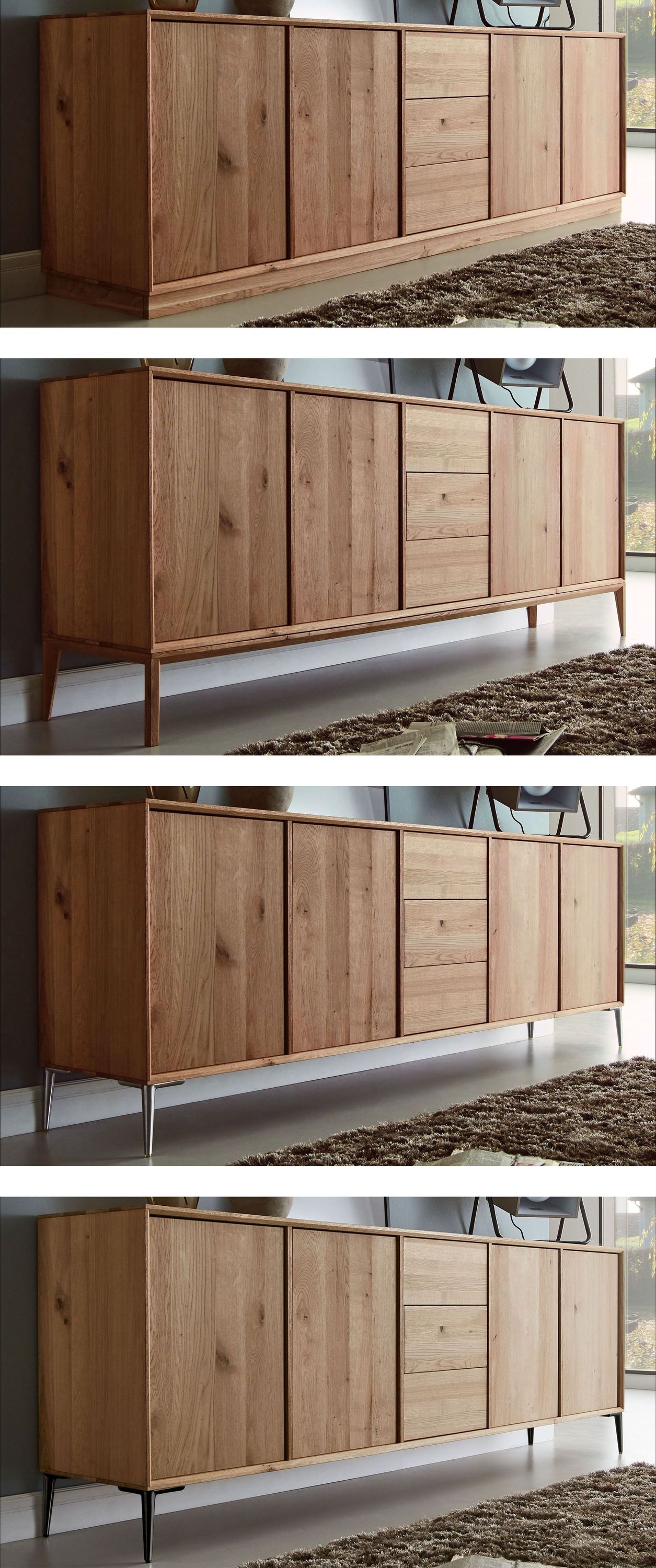 Die Fotos zeigen das Sideboard mit einem Holzsockel. Wahlweise sind auch Holzbeine oder Metallbeine erhältlich.