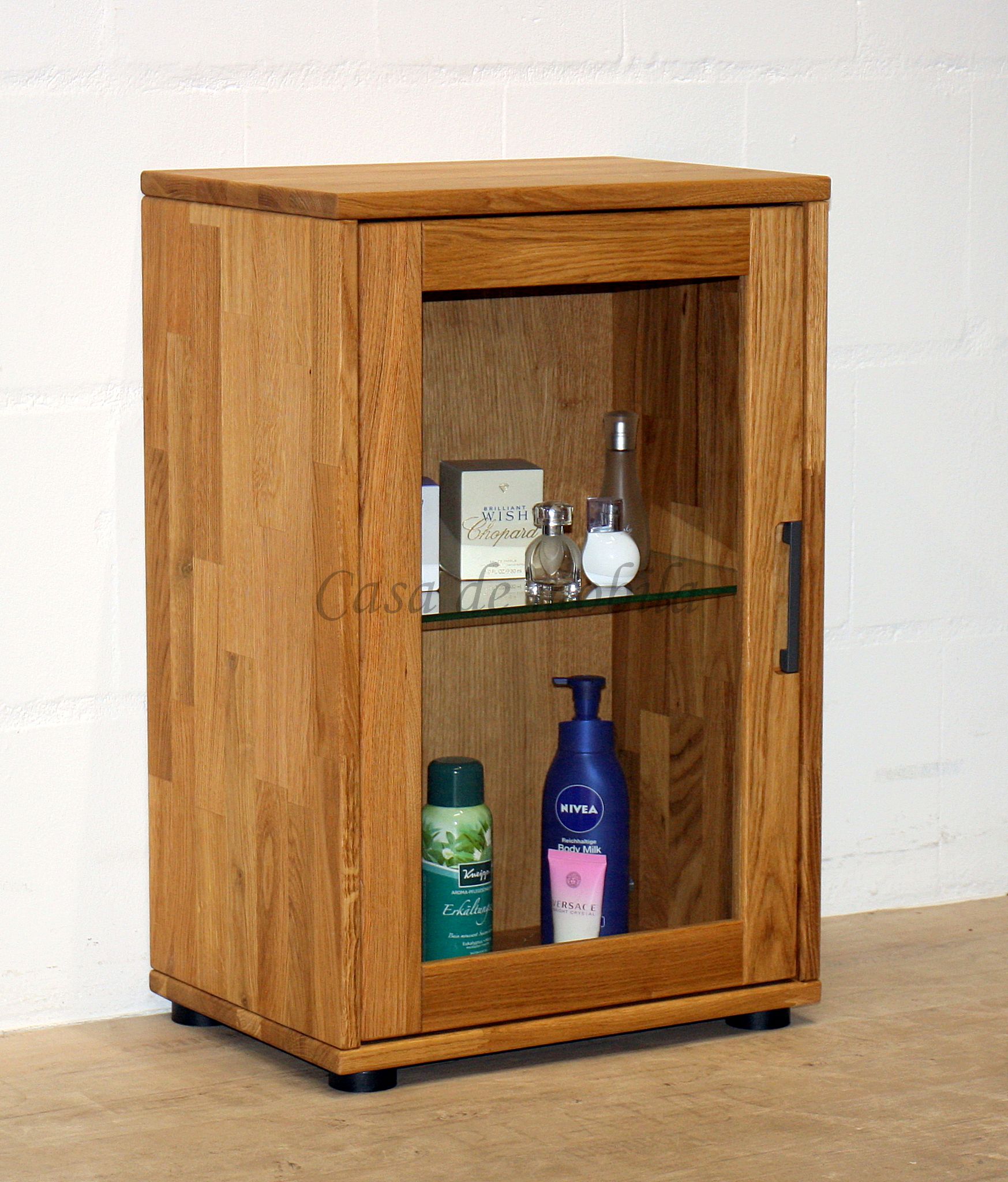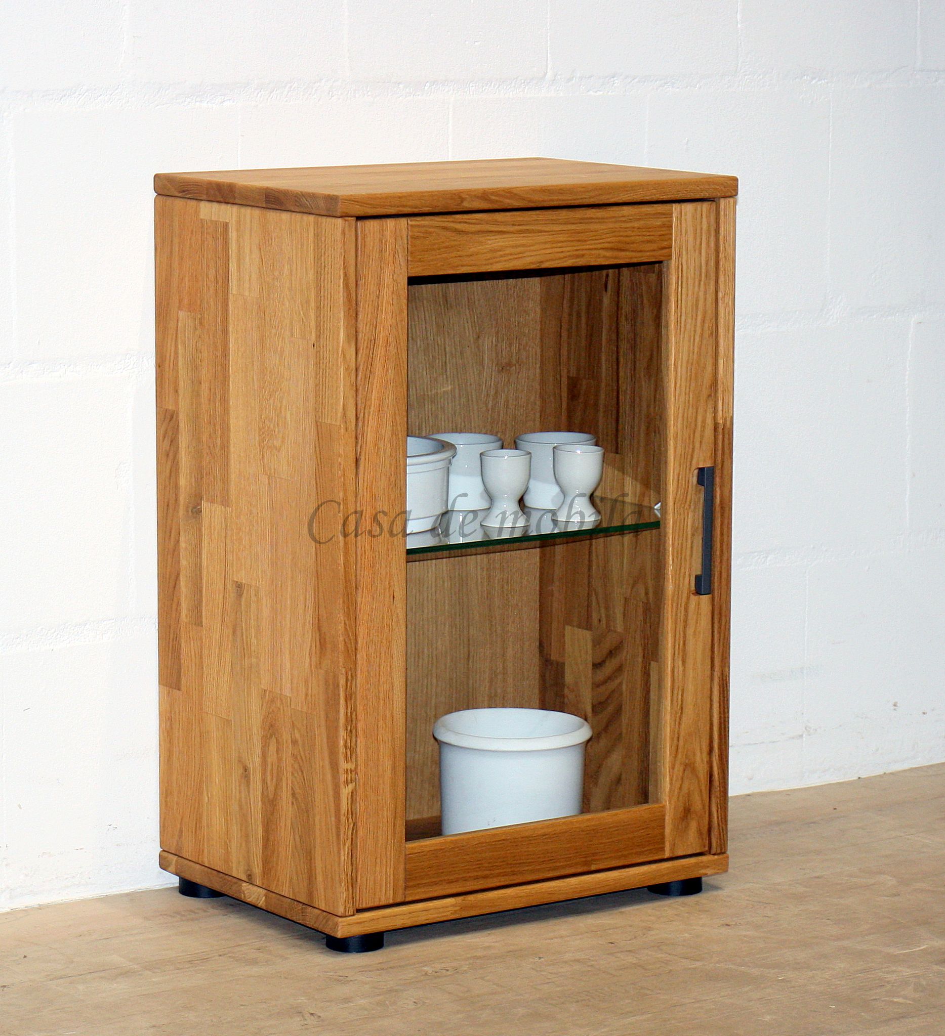 Sie hat eine Glastür wahlweise mit Links- oder Rechtsanschlag und einen Einlegeboden.