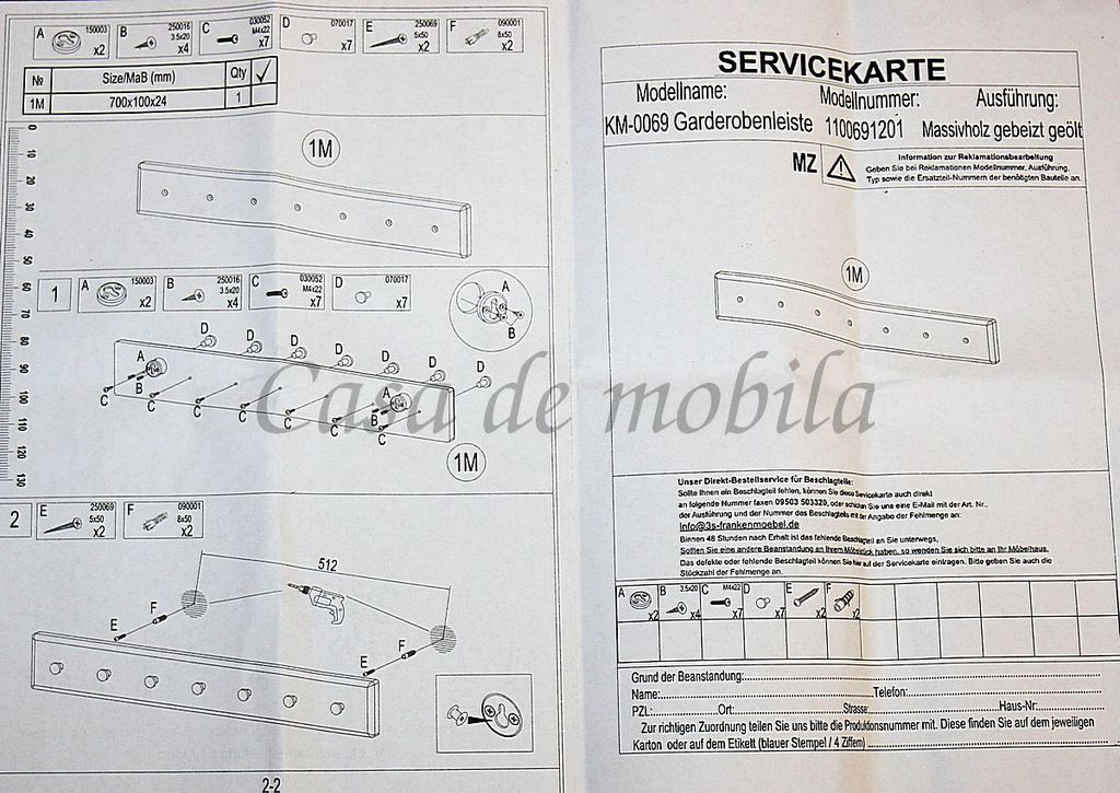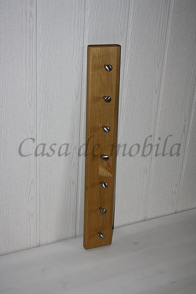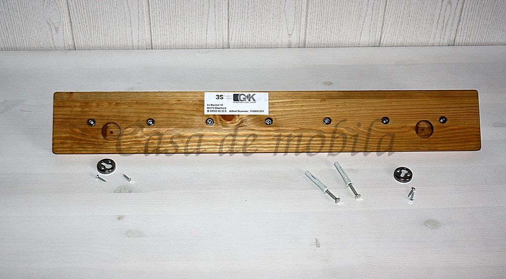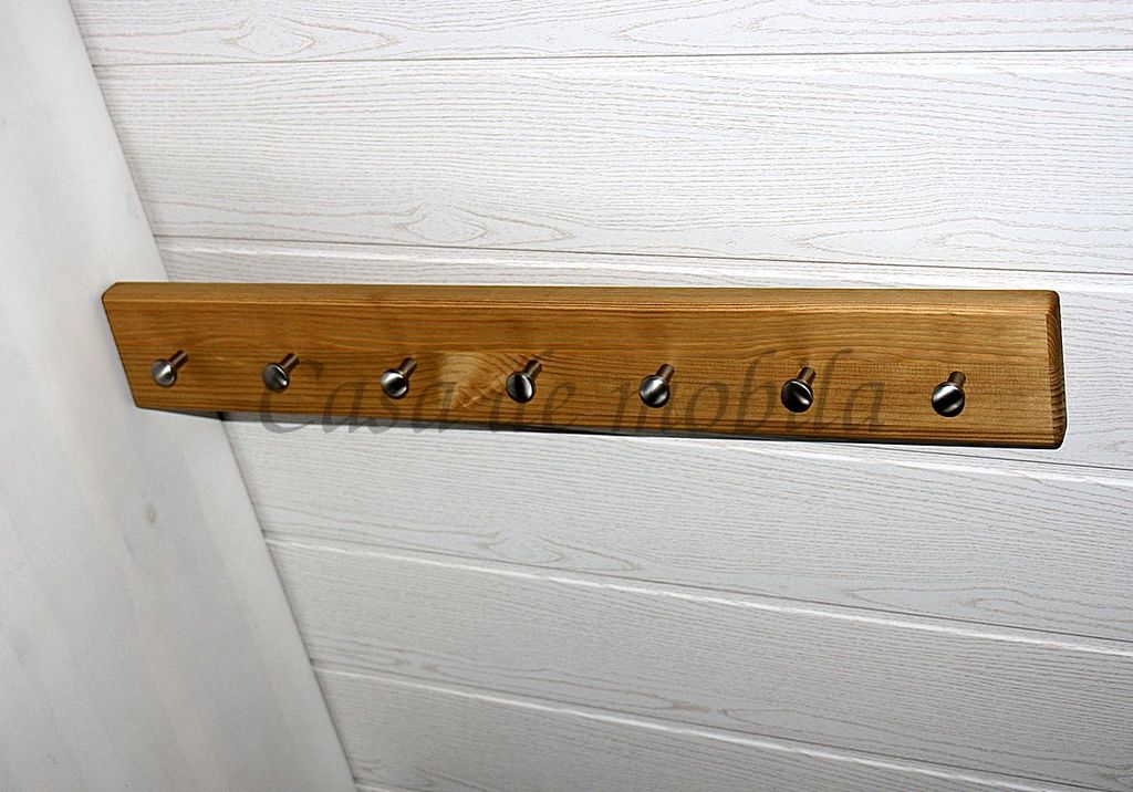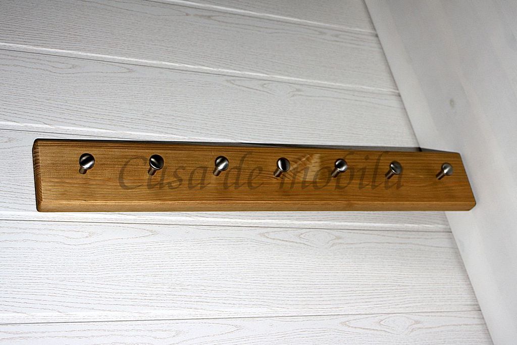 Diese Garderobenleisteist aus massiver Kiefer gefertigt und eichefarben gebeizt und geölt.