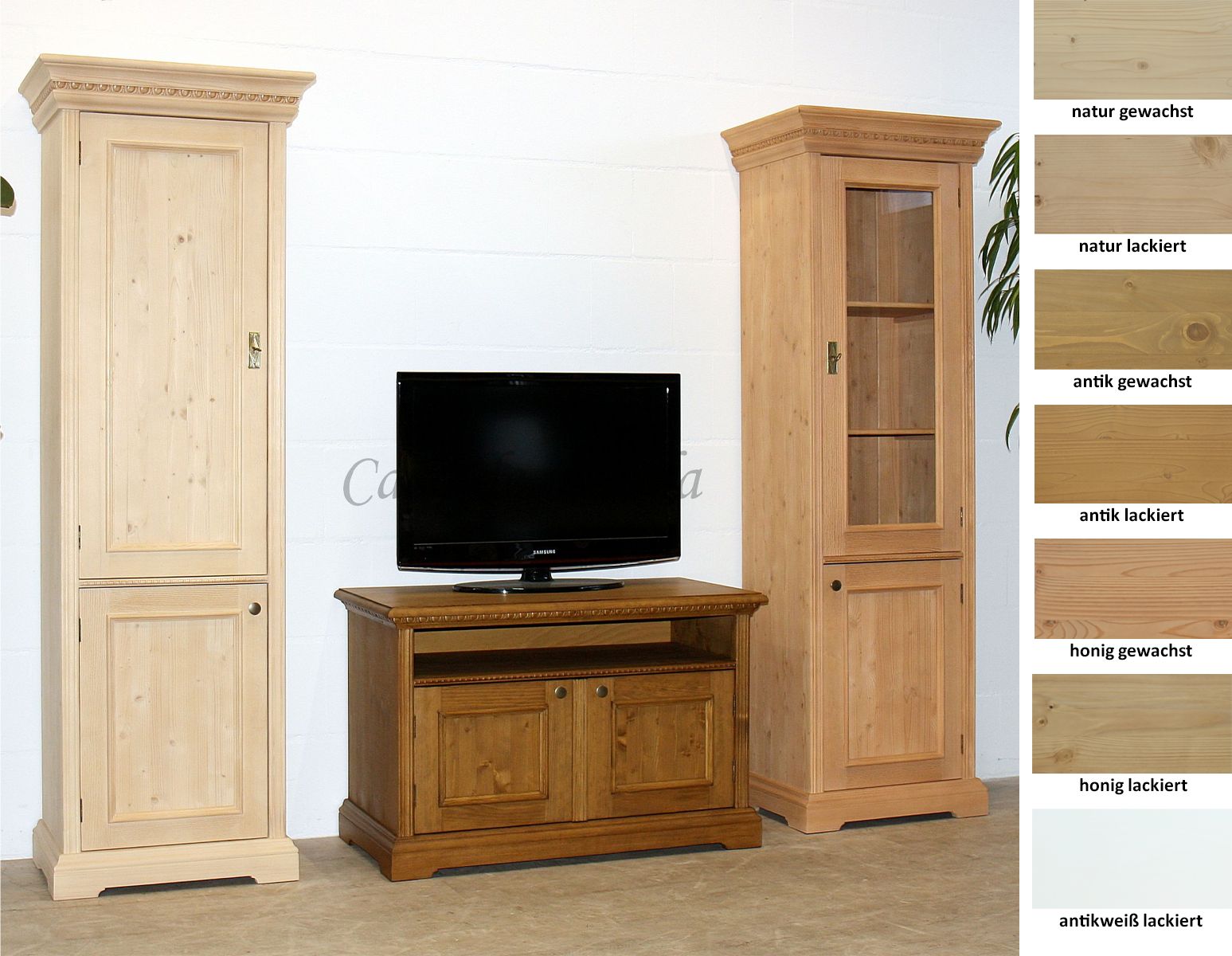 Diese Wohnkombination VICTORIA vereint klassischen Landhausstil mit der Wertigkeit massiver Handwerksmöbel. Gefertigt aus massivem Fichtenholz, überzeugt die Serie durch ihre robuste Bauweise, charakteristische Profilierungen und liebevoll ausgearbeitete Details. Die Kombination aus Hochschrank, Vitrine und einem TV-Lowboard schafft ein harmonisches Gesamtbild und bietet zugleich vielseitigen Stauraum für Wohn- und Medienbereiche.