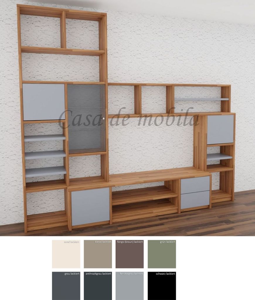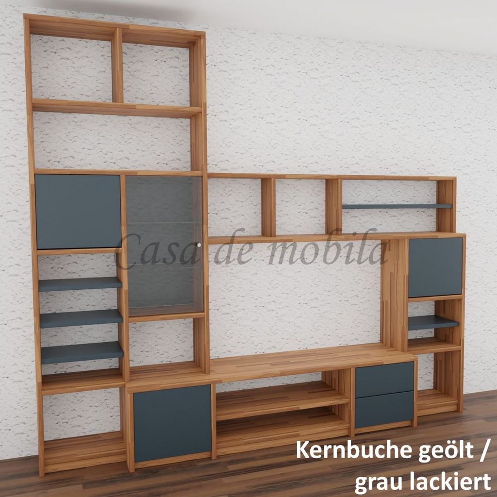 Die Echtholz Wohnwand CONTRA ist aus Buchenholz gefertigt. Die Holzoberfläche ist natur lackiert, die Türen und Schubladen sind farbig lackiert.